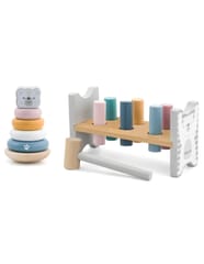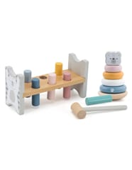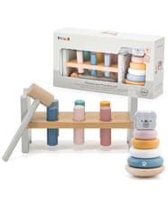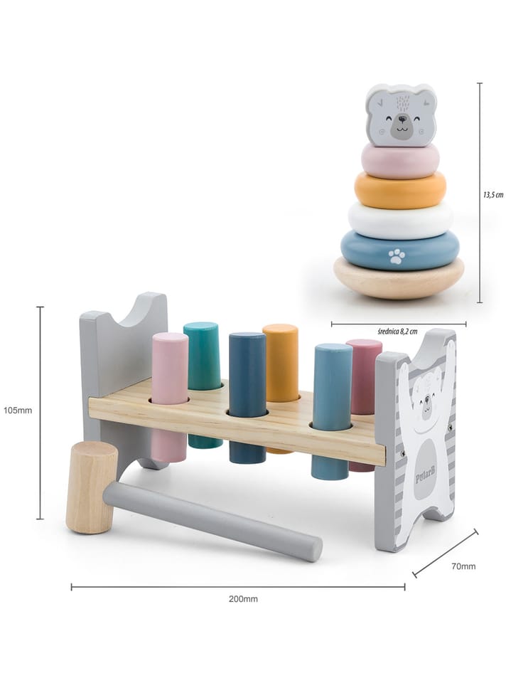 Przebijanka i piramidka Miś to wyjątkowy zestaw składający się z zabawki do układania (piramidki) oraz ławki do przebijania, który dostarcza maluchom wielogodzinnej, angażującej rozrywki. To doskonały wybór dla każdego rodzica, który pragnie wspierać rozwój swojego dziecka w zakresie zdolności motorycznych, koordynacji ruchowej oraz rozpoznawania kolorów. Zarówno układanie krążków na piramidce, jak i uderzanie młotkiem, poprawia koordynację ruchową, niezbędną na dalszych etapach rozwoju.