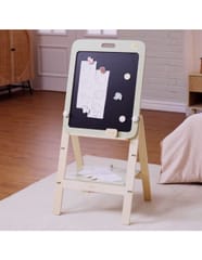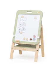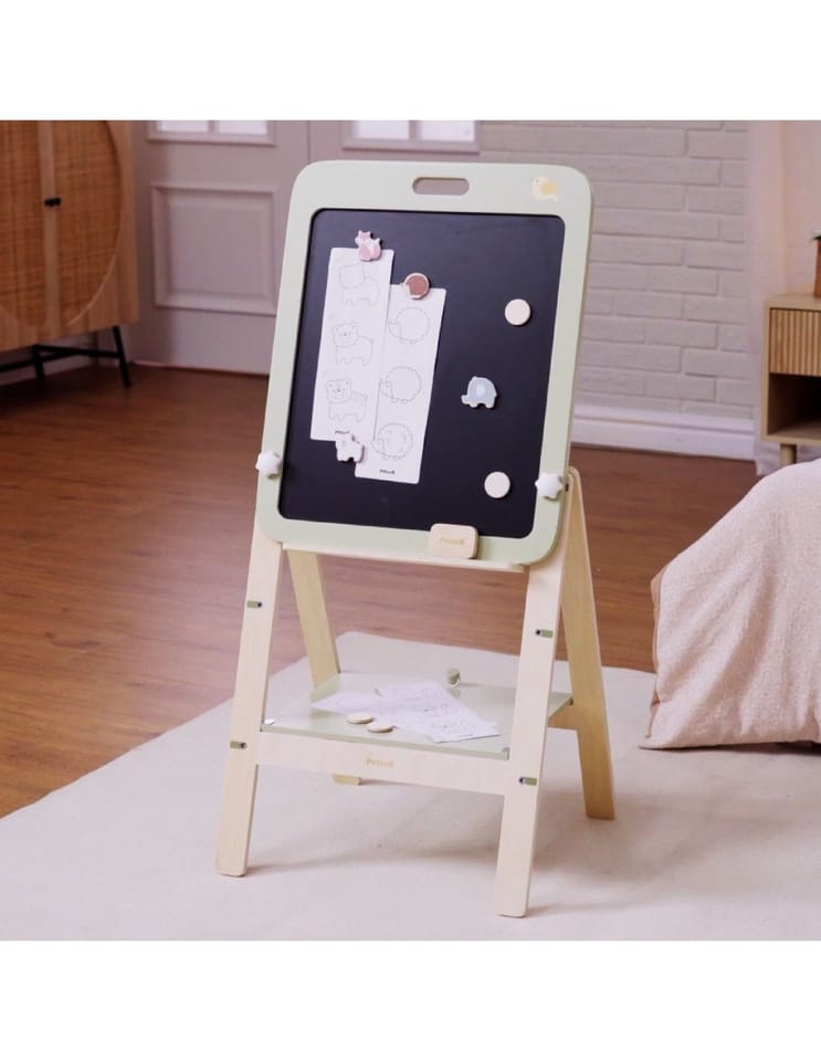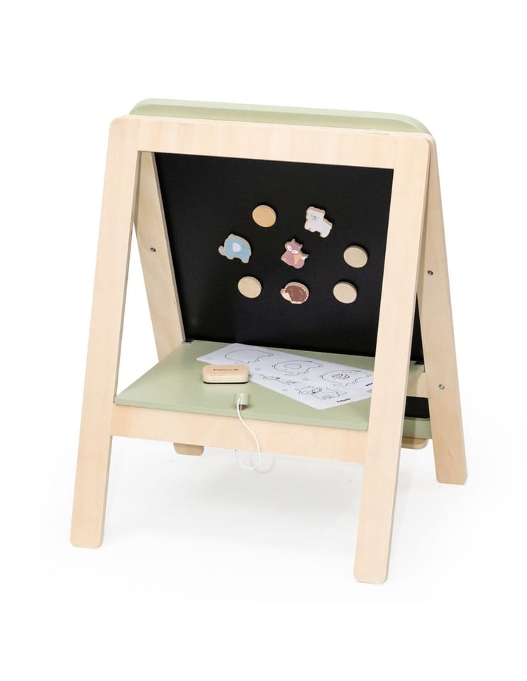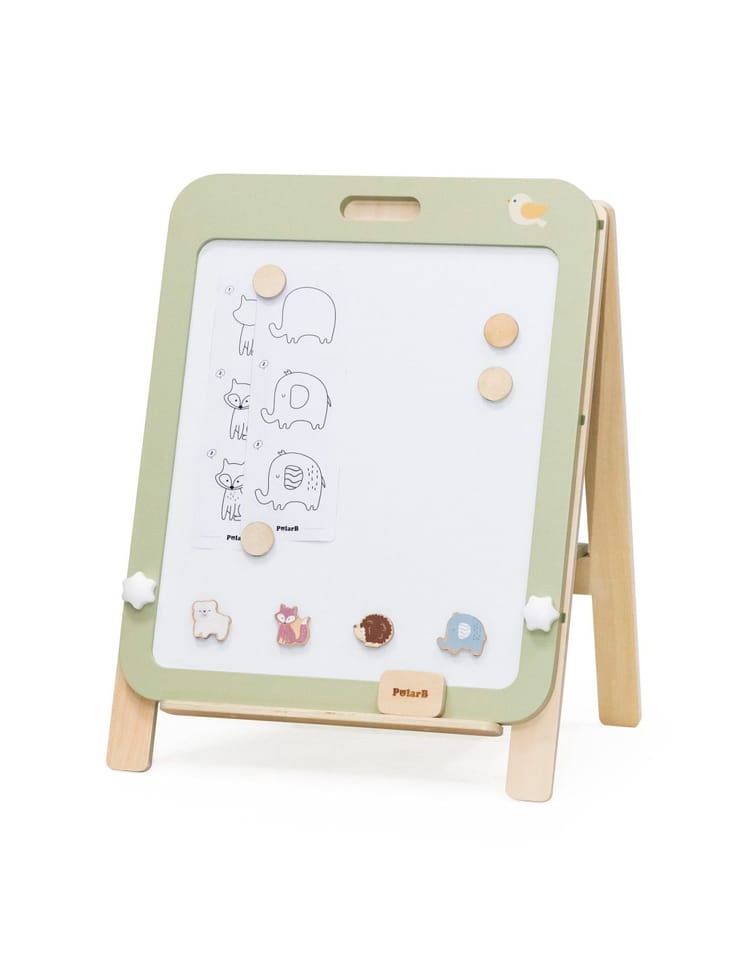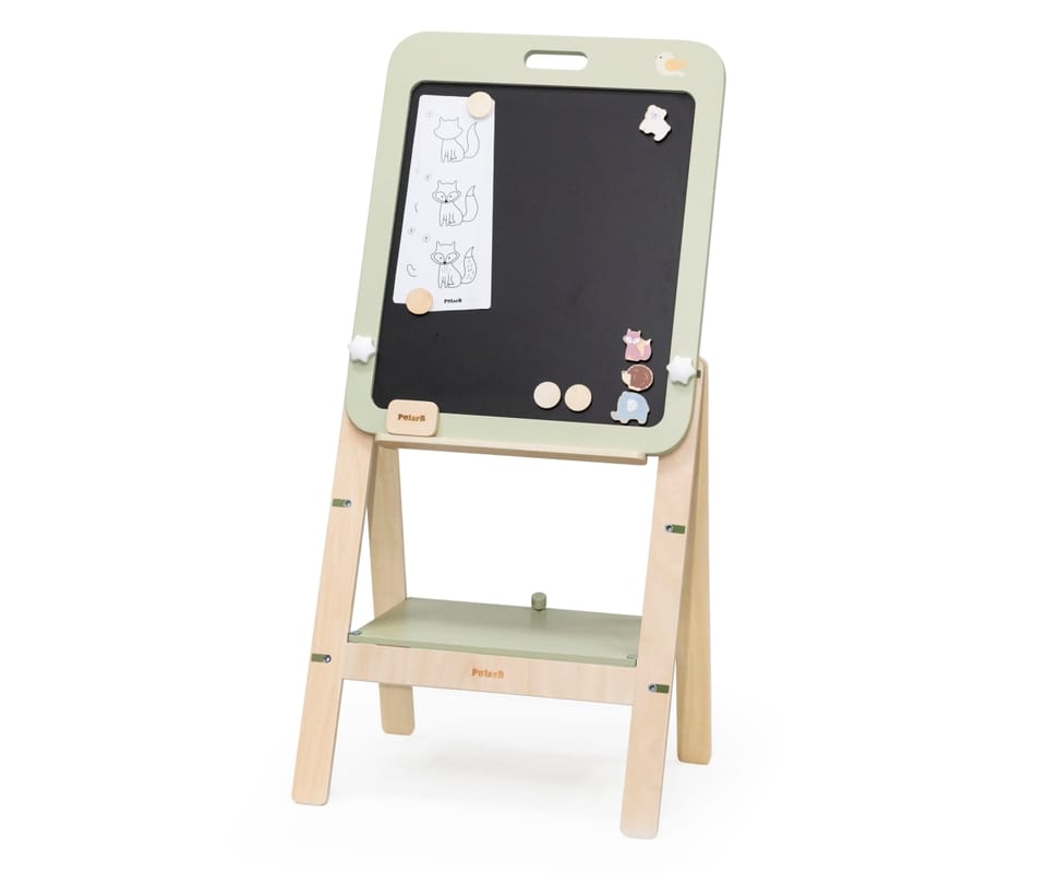 Przedstawiamy drewnianą zabawkę marki VIGA – tablica do rysowania z serii PolarB.Wyjątkowa dwustronna tablica do rysowania, idealna dla małych artystów. Jest wyposażona w czarno-białą powierzchnię, która wspiera rozwój kreatywności i umiejętności manualnych u dzieci. Jedna strona służy do pisania kredą, a druga to biała powierzchnia magnetyczna, doskonała do rysowania markerami whiteboard. Dziecko może również używać czterech drewnianych magnesów do przyczepienia papieru do rysowania, a także czterech dekoracyjnych magnesów w kształcie zwierząt. Tablica jest łatwa do montażu i demontażu oraz regulowana na trzech poziomach wysokości, dzięki czemu nadaje się dla dzieci o różnym wzroście. Może być również zdjęta i powieszona na ścianie, kiedy dziecko skończy swoje dzieło.Całość wykonana została z drewna bukowego i pomalowana nietoksycznymi farbami o stonowanych barwach, które przyciągną wzrok oraz zachęcą do zabawy dając jednocześnie mnóstwo radości. Farby są w 100% bezpieczne, spełniają normy bezpieczeństwa EN71 i ASTM.Zestaw zapakowany jest w kolorowe kartonowe pudełko, w sam raz na prezent.Zabawka przeznaczona dla dzieci powyżej 36. miesiąca życia.Cała seria zabawek PolarB została stworzona przez firmę VIGA aby sprostać oczekiwaniom rodziców i dzieci w doskonaleniu procesu ich rozwoju poprzez zabawę.DANE TECHNICZNE: Wymiary opakowania: Dł. 475 mm x wys. 625 mm x szer. 80 mmWaga netto: 3,8 kgWaga brutto: 4,3 kgOpisy