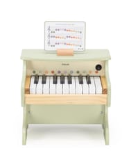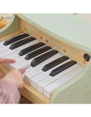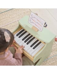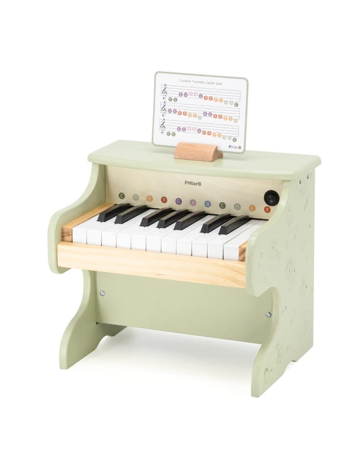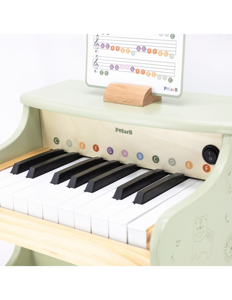 Drewniane pianino dla dzieci z serii PolarB by Viga to wyjątkowa zabawka muzyczna, która łączy estetyczny design z edukacyjną wartością. Zostało zaprojektowane z myślą o najmłodszych melomanach, aby wprowadzić ich w świat dźwięków i rytmu w przyjazny, zabawowy sposób.Instrument wykonano z wysokiej jakości drewna i pomalowano bezpiecznymi, nietoksycznymi farbami w delikatnych, pastelowych kolorach. Zielone pianino ozdobiono subtelnymi ilustracjami zwierzątek i nutek, co nadaje mu uroczy, naturalny wygląd pasujący do pokoju dziecka.Pianino posiada 18 klawiszy, które emitują delikatne dźwięki, pozwalając dziecku odtwarzać pierwsze melodie. Kolorowe oznaczenia nut (C, D, E, F, G, A, B) pomagają w nauce prostych utworów – w zestawie znajdują się również karty z nutami i drewniany stojak, które ułatwiają pierwsze kroki w świecie muzyki.Zabawka wspiera rozwój koordynacji wzrokowo-ruchowej, słuchu muzycznego oraz poczucia rytmu. To doskonały sposób, by pobudzić kreatywność i zachęcić dziecko do nauki poprzez zabawę.Cechy produktu: