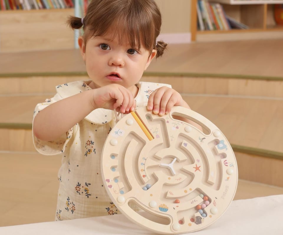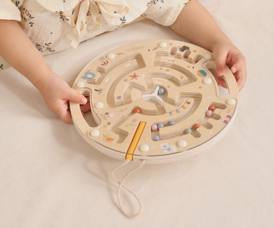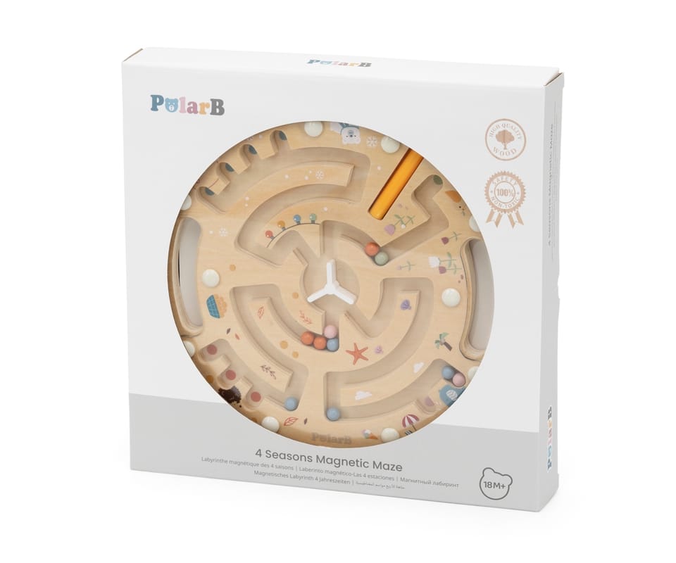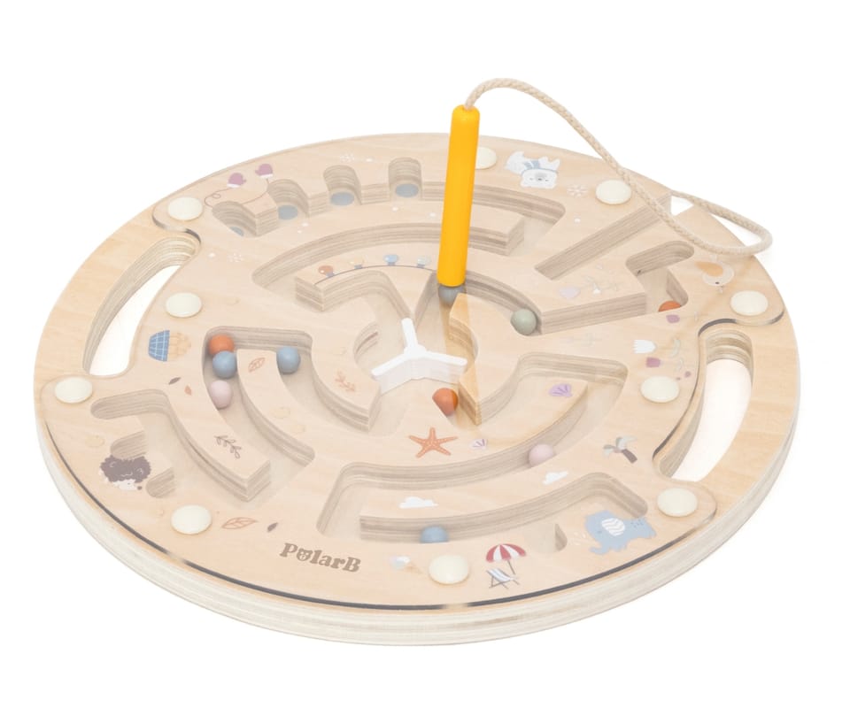 Drewniany labirynt magnetyczny PolarB od Viga Toys to wspaniała zabawka edukacyjna, która rozwija zręczność, koncentrację i koordynację ręka–oko u najmłodszych.W zestawie znajduje się drewniana plansza z kolorowym labiryntem oraz magnetyczny rysik przymocowany sznurkiem. Dziecko za pomocą rysika prowadzi kolorowe kuleczki po torach, starając się doprowadzić je do odpowiednich miejsc. Przezroczysta osłona zabezpiecza kulki przed wypadnięciem, co gwarantuje bezpieczną zabawę.Zabawka została wykonana z wysokiej jakości drewna, pomalowanego nietoksycznymi farbami w delikatnych, pastelowych kolorach charakterystycznych dla linii PolarB. Motywy zwierzątek i przyrody sprawiają, że labirynt jest nie tylko edukacyjny, ale też estetyczny i przyjazny dla dziecka.Idealny dla przedszkolaków – uczy logicznego myślenia, cierpliwości i precyzji ruchów.Seria zabawek POLAR BEAR została stworzona przez firmę VIGA aby sprostać oczekiwaniom rodziców i dzieci w doskonaleniu procesu ich rozwoju poprzez zabawę.Całość wykonana została z drewna lakierowanego i pomalowana nie toksycznymi farbami w „polarne” barwy, które zadowolą każdego użytkownika i dadzą mnóstwo radości z zabawy.Naszym priorytetem jest bezpieczeństwo i jakość naszego towaru, dlatego dbamy o to aby farby, którymi malujemy nasze zabawki nie były toksyczne i spełniały normy bezpieczeństwa ( EN71 i ASTM).Cechy produktu: