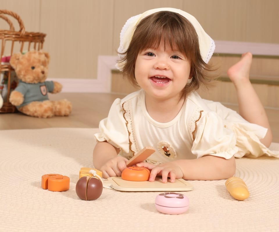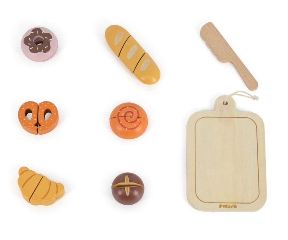 - deskę do krojenia- drewniany nożyk- bagietkę- rogalik- precelek- bułkę- drożdżówkę- pączek- donut