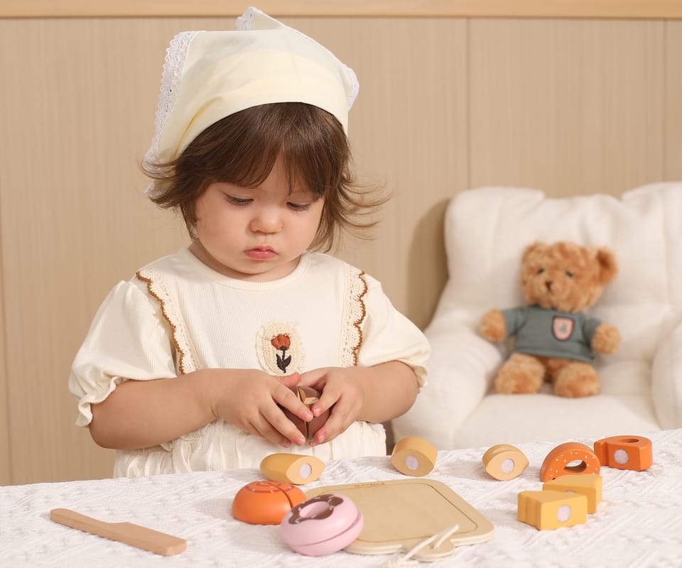 Drewniany zestaw PolarB Deska z pieczywem marki Viga Toys to idealna zabawka dla małych kucharzy i miłośników zabawy w gotowanie! Dziecko może przygotować pyszne śniadanie, krojąc świeże pieczywo i słodkie wypieki, ucząc się przy tym precyzji oraz rozwijając wyobraźnię.W zestawie znajduje się drewniana deska do krojenia, nożyk oraz apetycznie wyglądające pieczywo i słodkości: bagietka, rogalik, bułka, precelek, drożdżówka, pączek i donut. Każdy element można „pokroić” dzięki rzepom, które umożliwiają wielokrotne łączenie i rozdzielanie części – tak jak prawdziwe pieczywo!Zabawka doskonale rozwija koordynację ręka–oko, motorykę małą i zdolności manualne, a także zachęca do zabaw tematycznych, które uczą samodzielności i planowania posiłków. Cechy produktu: