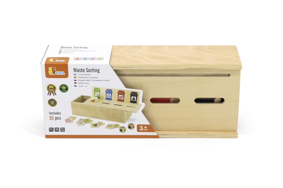 Przedstawiamy drewnianą zabawkę marki VIGA – sorter odpadów. Klasyczna zabawka w nowoczesnym wydaniu, przeznaczona dla dzieci od 3 roku życia. Składa się z 50 drewnianych małych płytek z obrazkami oraz z drewnianej skrzynki zamykanej pokrywką z otworami. Każda płytka posiada inny obrazek odpadu z jednej strony zaś z drugiej buźkę w kolorze odpowiadającym grupie odpadów (kosza) do której należy. Do zestawu dołączona jest dodatkowa większa płytka przedstawiająca pojemniki na śmieci w 4 kolorach. Należy ją zamocować na pokrywce, wówczas nadrukowane pojemniki będą wskazywały odpowiedni otwór do wrzucania małych płytek. Do kompletu dołączone są również 2 kostki do gry.Ta wszechstronna zabawka pobudza koncentrację, koordynację i zdolności motoryczne. Dzięki niej dzieci zwiększają świadomość ekologiczną i uczą klasyfikowania codziennych odpadów.Zabawka jest jednocześnie sorterem oraz­ grą dla jednej lub większej ilości osób. Znakomita do wspólnej zabawy z rodzicami.Całość wykonana została z drewna bukowego i pomalowana nietoksycznymi farbami, które przyciągną wzrok oraz zachęcą do zabawy dając jednocześnie mnóstwo radości. Farby są w 100% bezpieczne, spełniają normy bezpieczeństwa EN71 i ASTM.Całość jest estetycznie zapakowana w przeźroczystą folię z kolorową etykietą, w sam raz na prezent.Zabawka przeznaczona dla dzieci powyżej 36. miesiąca życia. Cała seria zabawek VIGA została stworzona aby sprostać oczekiwaniom rodziców i dzieci w doskonaleniu procesu ich rozwoju poprzez zabawę.DANE TECHNICZNE: Wymiar produktu:dł: 295mm x wys: 85mm x szer: 124mmWymiary opakowania:dł: 295mm x wys: 85mm x szer: 124mm Waga: 0,8kg Opisy
