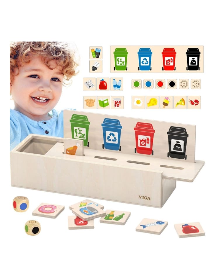 Przedstawiamy drewnianą zabawkę marki VIGA – sorter odpadów. Klasyczna zabawka w nowoczesnym wydaniu, przeznaczona dla dzieci od 3 roku życia. Składa się z 50 drewnianych małych płytek z obrazkami oraz z drewnianej skrzynki zamykanej pokrywką z otworami. Każda płytka posiada inny obrazek odpadu z jednej strony zaś z drugiej buźkę w kolorze odpowiadającym grupie odpadów (kosza) do której należy. Do zestawu dołączona jest dodatkowa większa płytka przedstawiająca pojemniki na śmieci w 4 kolorach. Należy ją zamocować na pokrywce, wówczas nadrukowane pojemniki będą wskazywały odpowiedni otwór do wrzucania małych płytek. Do kompletu dołączone są również 2 kostki do gry.Ta wszechstronna zabawka pobudza koncentrację, koordynację i zdolności motoryczne. Dzięki niej dzieci zwiększają świadomość ekologiczną i uczą klasyfikowania codziennych odpadów.Zabawka jest jednocześnie sorterem oraz grą dla jednej lub większej ilości osób. Znakomita do wspólnej zabawy z rodzicami.Całość wykonana została z drewna bukowego i pomalowana nietoksycznymi farbami, które przyciągną wzrok oraz zachęcą do zabawy dając jednocześnie mnóstwo radości. Farby są w 100% bezpieczne, spełniają normy bezpieczeństwa EN71 i ASTM.Całość jest estetycznie zapakowana w przeźroczystą folię z kolorową etykietą, w sam raz na prezent.Zabawka przeznaczona dla dzieci powyżej 36. miesiąca życia. Cała seria zabawek VIGA została stworzona aby sprostać oczekiwaniom rodziców i dzieci w doskonaleniu procesu ich rozwoju poprzez zabawę.DANE TECHNICZNE: Wymiar produktu:dł: 295mm x wys: 85mm x szer: 124mmWymiary opakowania:dł: 295mm x wys: 85mm x szer: 124mm Waga: 0,8kg Opisy