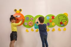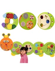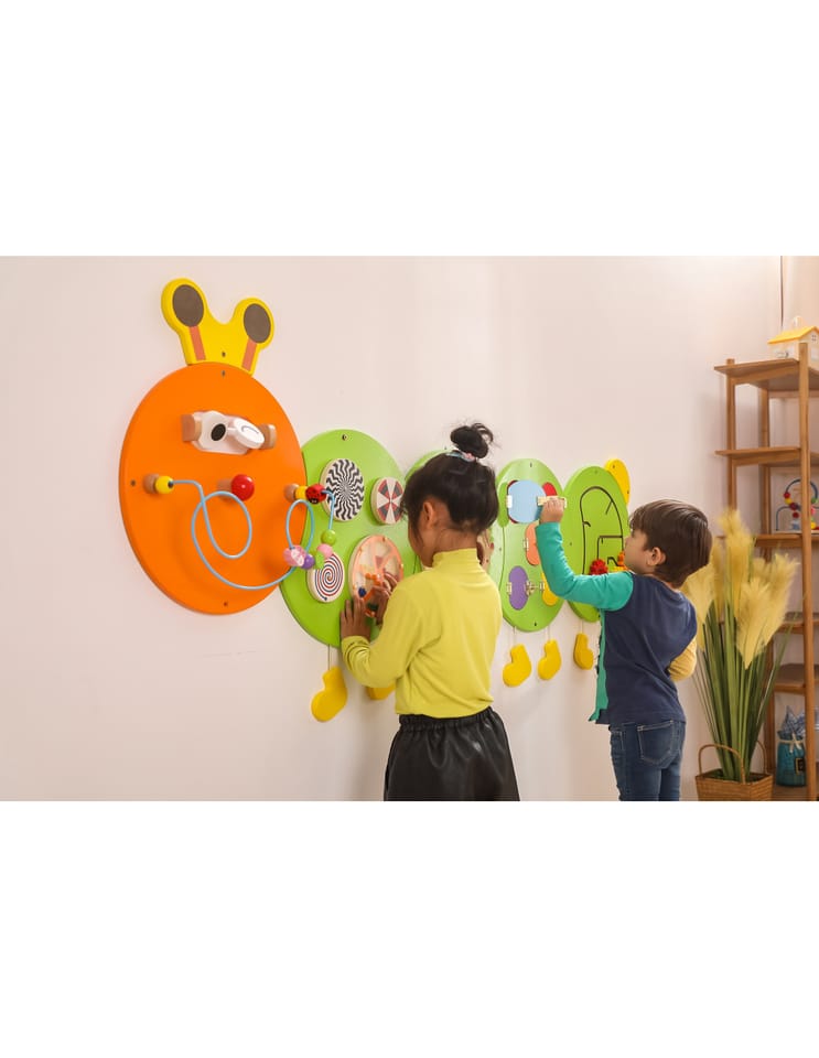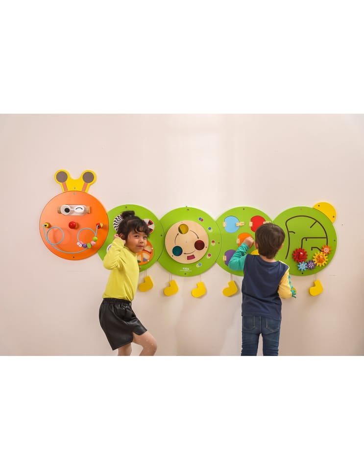 Wielofunkcyjna tablica ścienna z uroczym wizerunkiem gąsienicy. Zestaw składa się z 5 tablic z różnymi funkcjami. Tablice są bardzo łatwe w montażu i demontażu, jak również w transporcie. Tablica z wizerunkiem gąsienicy jest zabawką, na której jednocześnie może się bawić kilkoro dzieci. Mogą nie tylko bawić się dla przyjemności, ale także wiele się nauczyć. Pomaga w nauce kolorów, dźwięku, grafiki. Rozwija również koordynację ręka-oko oraz umiejętności społeczne. Genialna kombinacja zabawek dla szkół, przedszkoli, centrów nauki oraz miejsc publicznych. Produkt przeznaczony dla dzieci powyżej 18 miesiąca życia.