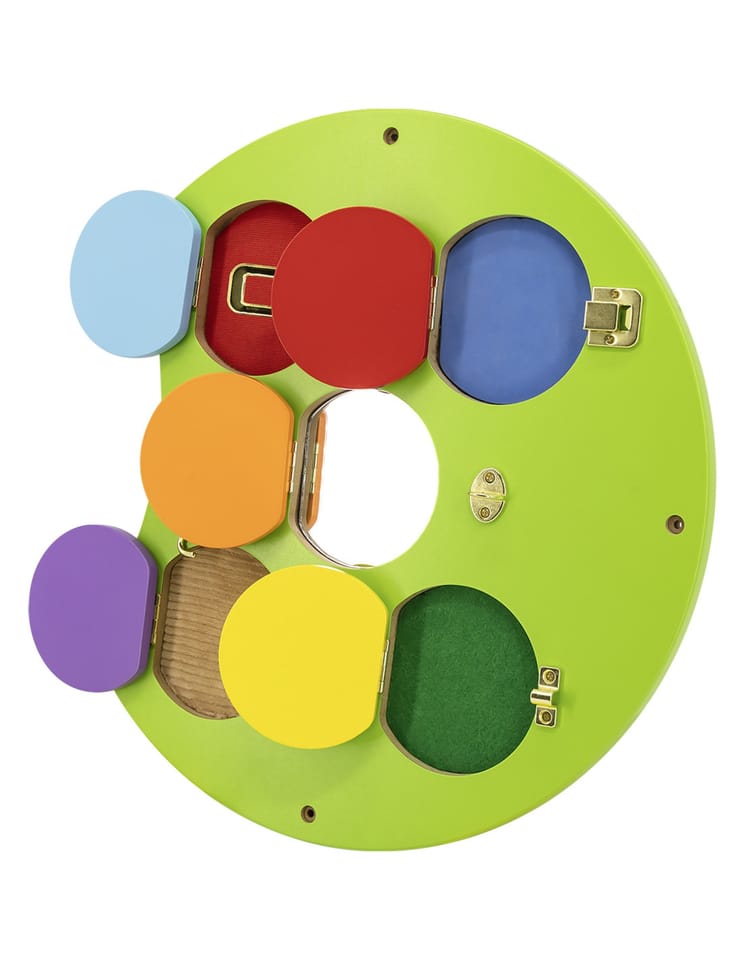- - na czwartej tablicy znajduję się 5 rodzajów zamków. Po otwarciu każdego z nich dziecko może zapoznać się z 5 różnymi materiałami (EVA, rzepy, lustro, tkanina filcowa, tektura falista),