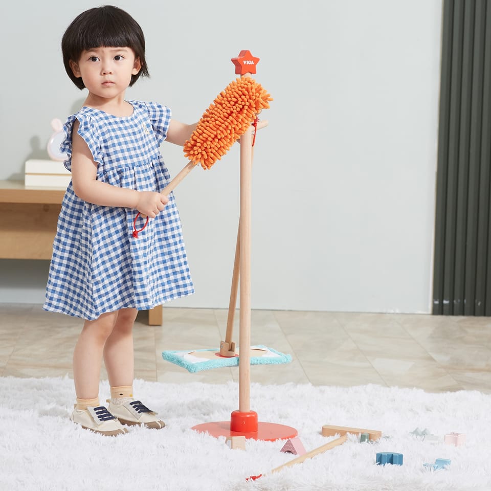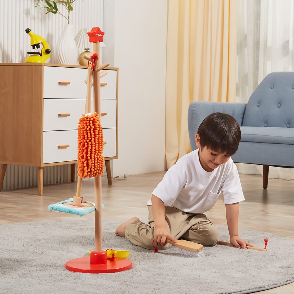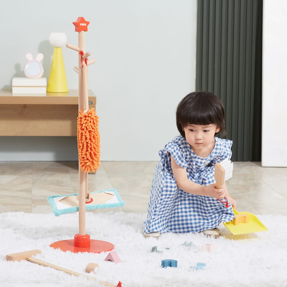 Drewniany niezbędnik domowy od VIGA to akcesoria dopasowane do małych raczek naszych pomocników, zarówno wielkością jak i ciężarem. Przedmioty można łatwo przechowywać na dedykowanym stojaku z czerwoną podstawą, gdzie można je zawiesić. Maluch nauczy się dbać o porządek i czystość w swoim pokoju naśladując swoich rodziców. Narzędzie do udawanej zabawy pomaga dzieciom rozwijać koordynację i zdolności motoryczne oraz wyobraźnię i umiejętności społeczne.