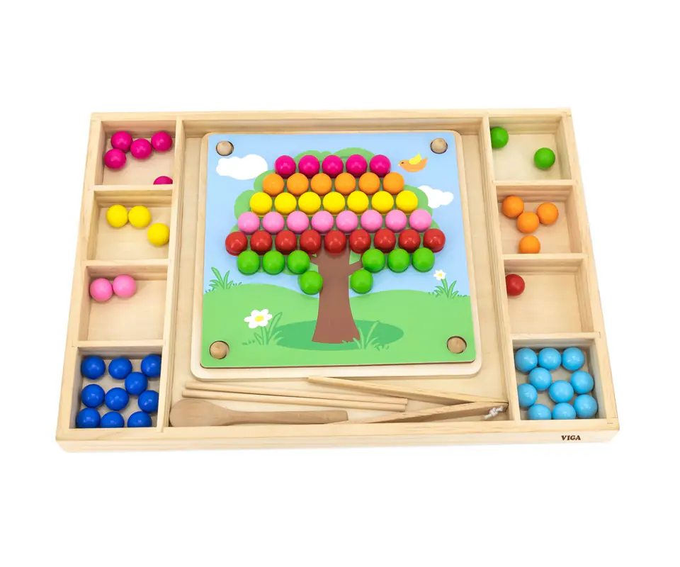 Przedstawiamy drewnianą zabawkę marki VIGA – kreatywną grę/układankę.Zabawka rozwija umiejętności koordynacji ręka-oko, koncentracji, pamięci i spostrzegawczości u dzieci. Zapewnia wiele radości i rozrywki.Składa się z drewnianego pudełka/bazy z przegródkami, kolorowych kulek, 8 plansz/obrazków z otworami oraz zestawu przyborów (pałeczki, łyżka) do ich układania. Zachęca do eksploracji i odkrywania różnych sposobów dopasowywania elementów. Można tworzyć kulkowe kompozycje zgodnie ze wzorem na kolorowych planszach lub własne pomysły.Całość wykonana została z drewna bukowego i pomalowana nietoksycznymi farbami, które przyciągną wzrok oraz zachęcą do zabawy dając jednocześnie mnóstwo radości. Farby są w 100% bezpieczne, spełniają normy bezpieczeństwa EN71 i ASTM.Gra zapakowana jest w kolorowy karton, w sam raz na prezent.Zabawka przeznaczona dla maluchów powyżej 36. miesiąca życia. Cała seria zabawek VIGA została stworzona, aby sprostać oczekiwaniom rodziców i dzieci w doskonaleniu procesu ich rozwoju poprzez zabawę.Wymiar produktu:Dł. 398mm x wys. 30mm x szer. 269mmWymiary opakowania:Dł. 400mm x wys. 30mm x szer. 277mmWaga brutto: 1,2 kgOpisy