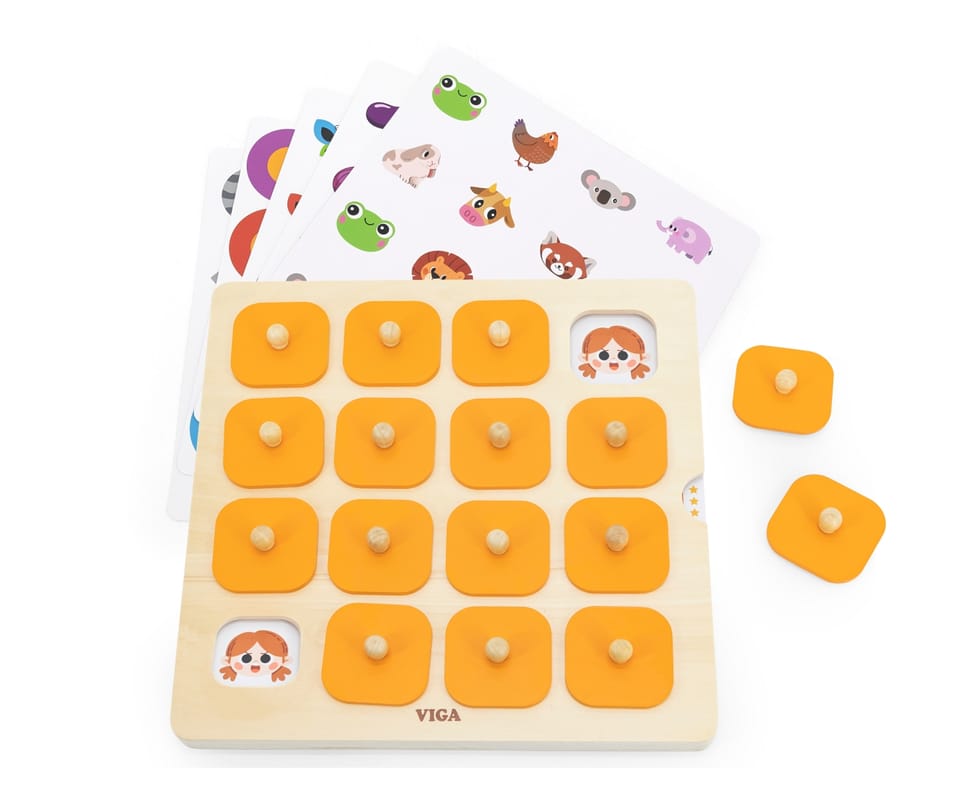 Przedstawiamy drewnianą zabawkę marki VIGA – grę pamięciową Memory.Klasyczna i popularna gra pamięciowa, która rozwija umiejętności koncentracji, pamięci i spostrzegawczości u dzieci. Jest to interaktywna i edukacyjna zabawka, która zapewnia wiele radości podczas rozgrywki.Składa się z drewnianej tarczy/bazy z wyciętymi szesnastoma otworami, zakrywanymi wieczkiem z pinezką. Z boku tarczy wsuwa się jedną z dziesięciu plansz, której obrazki będą widoczne w otworach bazy. Plansze mają różny poziom trudności dostosowane do wieku i umiejętności dzieci.Gra pamięciowa jest nie tylko rozrywką, ale także świetnym sposobem na rozwijanie umiejętności poznawczych i kształtowanie koncentracji u dzieci. Zapewnia interaktywną zabawę, angażującą zarówno pojedynczego gracza, jak i grupę dzieci. Zabawa w Memory jest również doskonałą okazją do budowania więzi między dziećmi oraz rozwijania umiejętności społecznych, takich jak umiejętność czekania na swoją kolej i fair play.Całość wykonana została z drewna bukowego i pomalowana nietoksycznymi farbami, które przyciągną wzrok oraz zachęcą do zabawy dając jednocześnie mnóstwo radości. Farby są w 100% bezpieczne, spełniają normy bezpieczeństwa EN71 i ASTM.Gra zapakowana jest w kolorowy karton, w sam raz na prezent.Zabawka przeznaczona dla maluchów powyżej 36. miesiąca życia. Cała seria zabawek VIGA została stworzona aby sprostać oczekiwaniom rodziców i dzieci w doskonaleniu procesu ich rozwoju poprzez zabawę.DANE TECHNICZNE: Wymiar produktu: dł: 300mm x wys: 37mm x szer: 300mmWymiary opakowania: dł: 310mm x wys: 42mm x szer: 310mm Waga: 0,7kgOpisy
