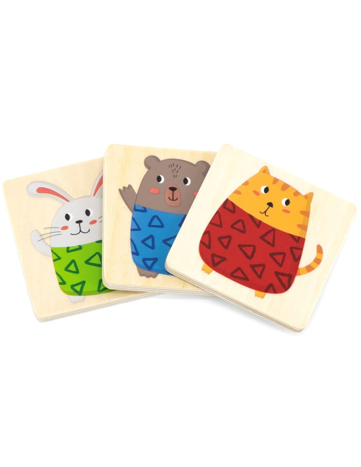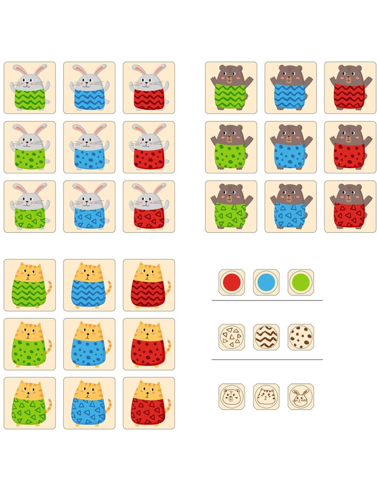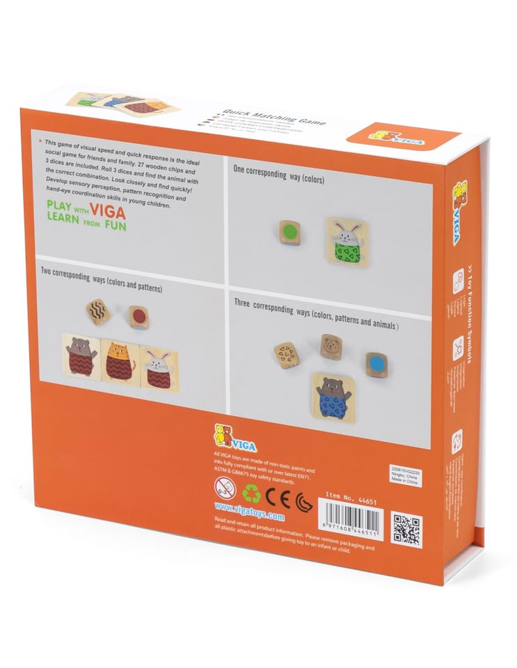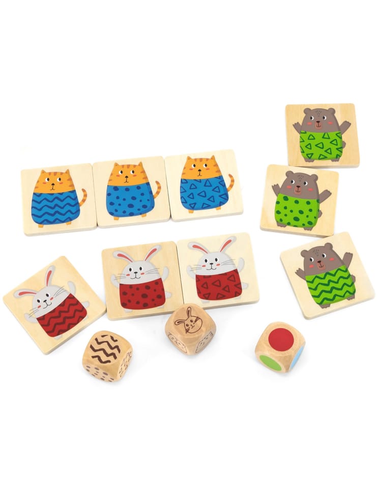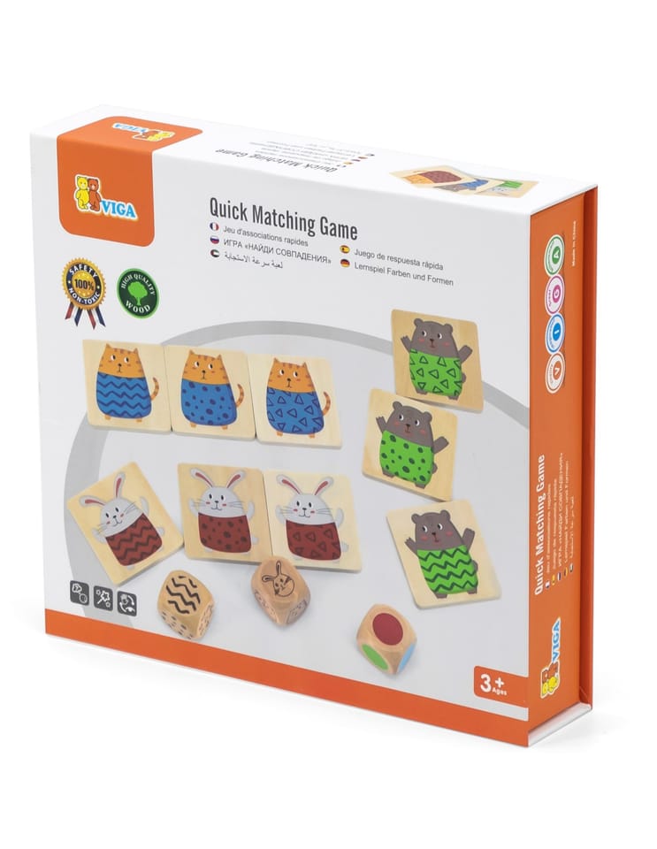 Gra-szybko dopasuj od firmy Viga to jedna z ciekawszych gier, która będzie służyła długo i zapewni Twojemu dziecku wiele lat ciekawej i kreatywnej zabawy. Możliwości jaki stawia przed dzieckiem są niezliczone. Twoje dziecko będzie mogło spędzać czas z innymi dziećmi podczas gry i podczas każdego kolejnej gry w dopasowywanie zwierzątek i wzorów jakie mają na malowanych na koszulkach. Z każdym dniem zabawa będzie wywoływała coraz większy uśmiech na twarzy dziecka, każde zwycięstwo motywuje je dodatkowo do nauki dopasowywania. Maluch nauczy się dokładności i staranności w układaniu wylosowanych za pomocą kostki elementów. Celem gry jest wyrzucenie kostek od 1 do 3 i szybkie dopasowanie dostępnych 27 kart- obrazków ze zwierzątkami: królika, misia, kotka w zależności od wybranego stopnia trudności. Przy wyrzuceniu 1 kostki gracz szybko dopasowuje kolor, wyrzucając 2 kostki należy szybko dopasować: kolor i wzór, natomiast gracz, który wyrzuci 3 kostki szybko dopasowuje: kolor, zwierzątko i wzór który zwierzątko ma namalowany na koszulce.