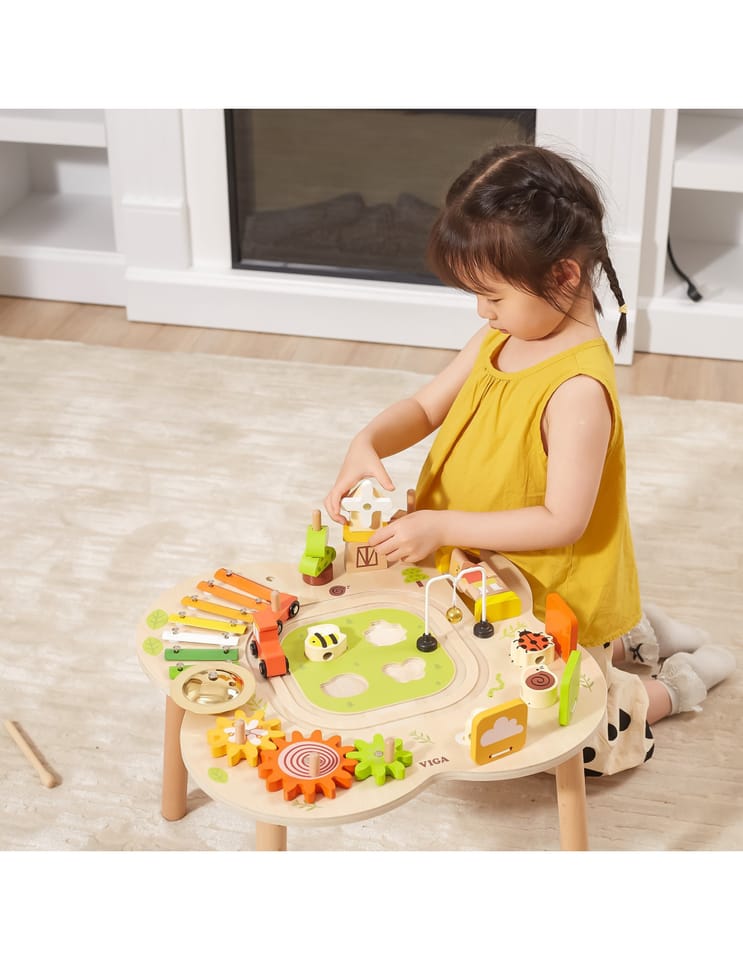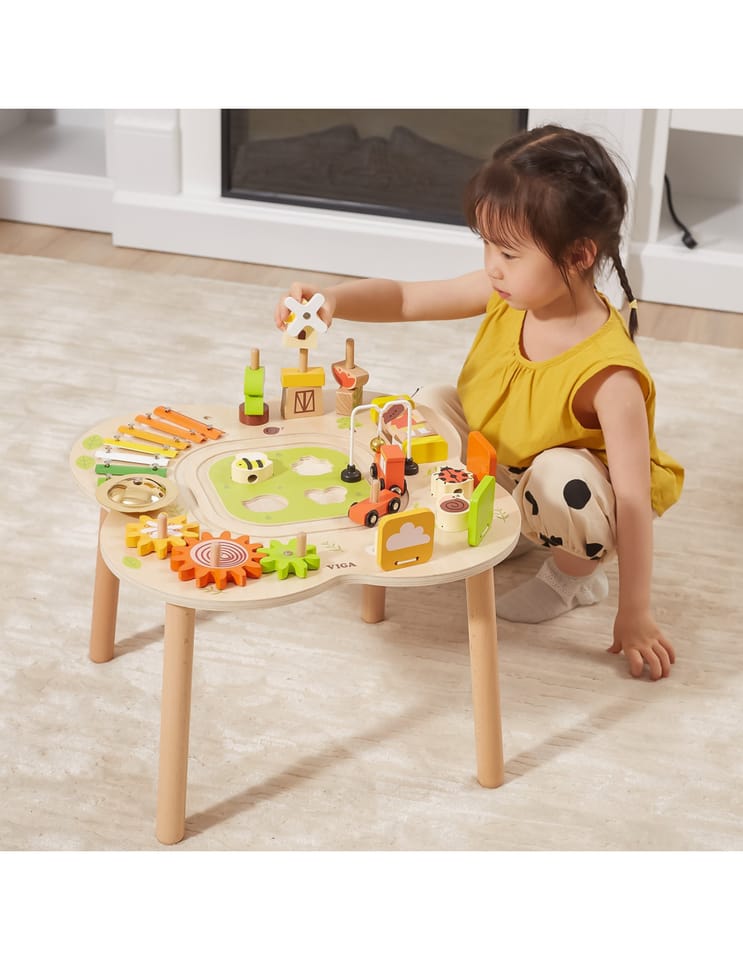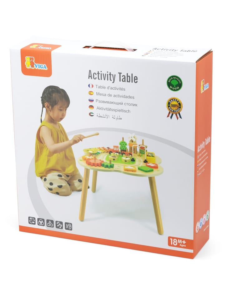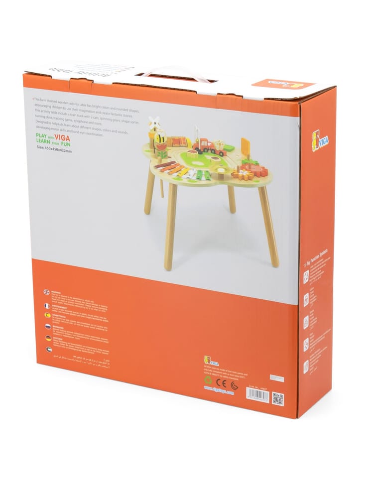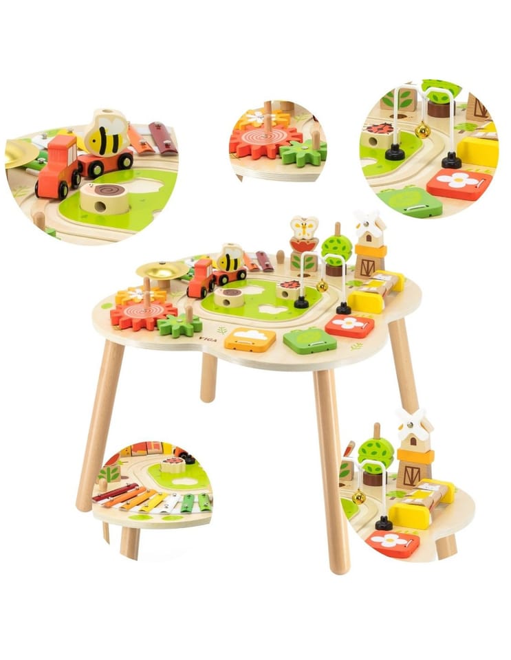 Ten drewniany stół rozwojowy od farmy Viga Toys ma jasne kolory i zaokrąglone kształty, zachęcając dzieci do używania wyobraźni i tworzenia fantastycznych historii. Jest wystarczająco duży, aby kilkoro dzieci mogło bawić się jednocześnie. Ten stolik edukacyjny jest niezwykle bogato wyposażony w wiele gier. Stół zawiera: tor kolejowy z lokomotywą i wagonikiem, sorter, talerz, obracające się koła zębate, piramidkę, ksylofon do wybijania dźwięków i wiele więcej atrakcji.