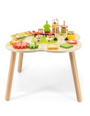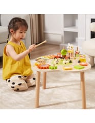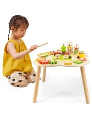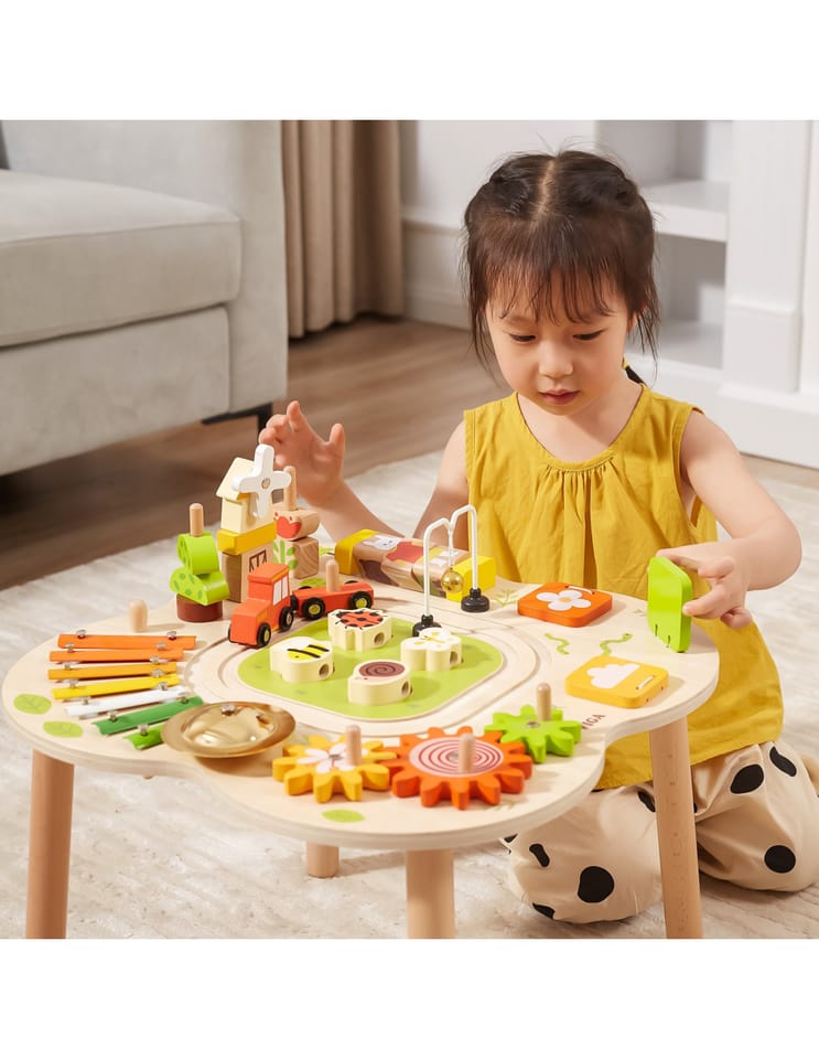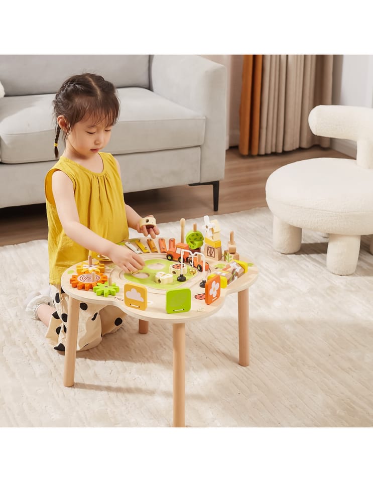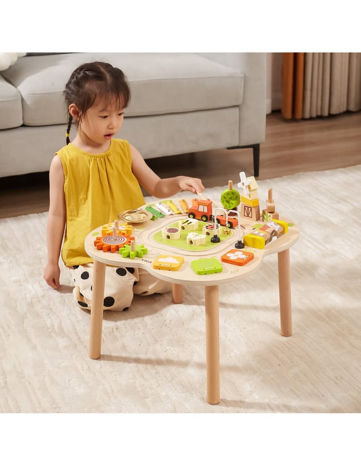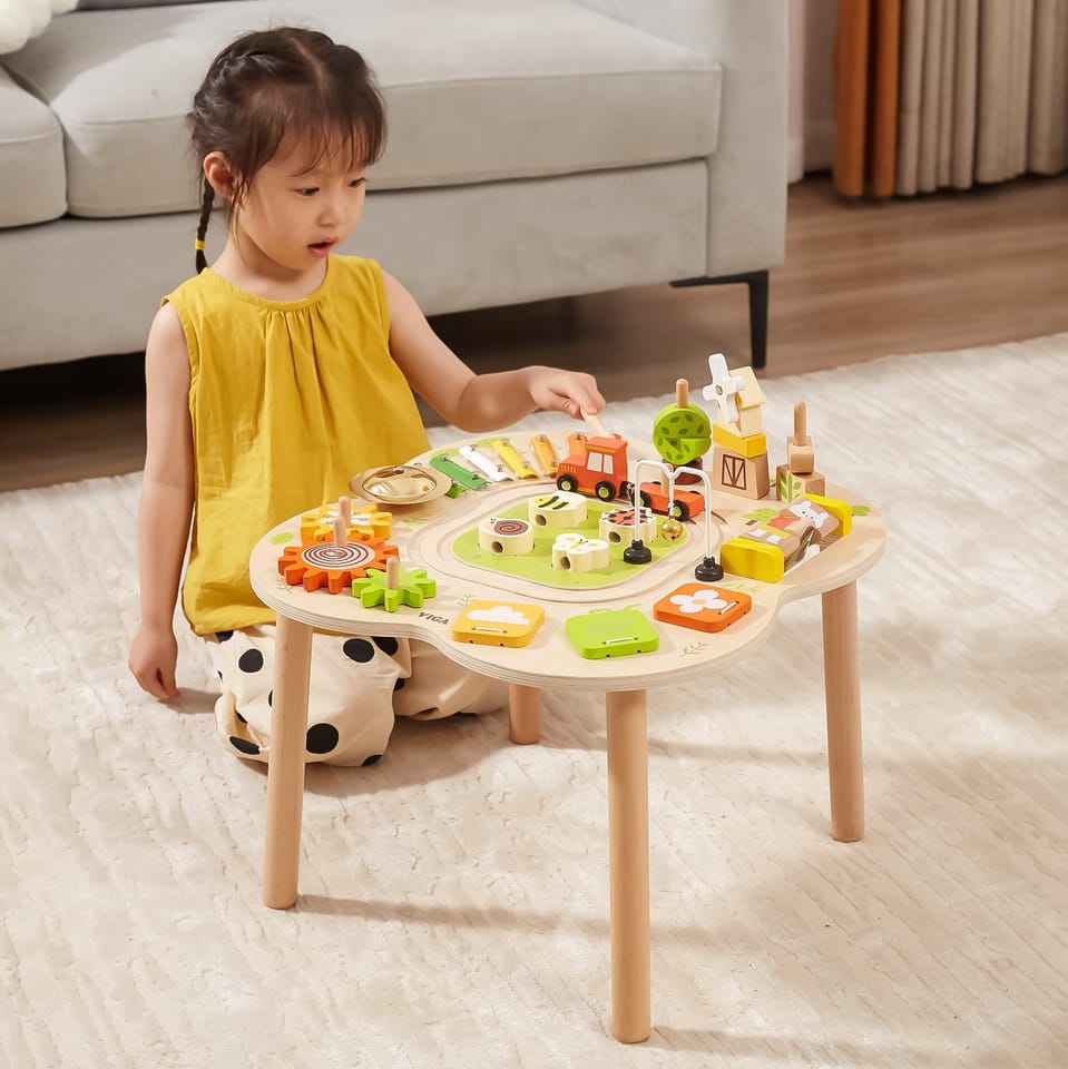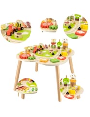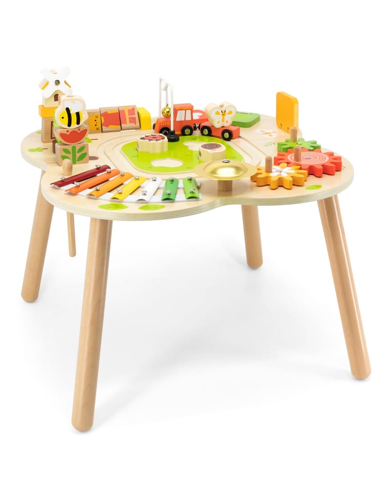 Ten drewniany stół rozwojowy od farmy Viga Toys ma jasne kolory i zaokrąglone kształty, zachęcając dzieci do używania wyobraźni i tworzenia fantastycznych historii. Jest wystarczająco duży, aby kilkoro dzieci mogło bawić się jednocześnie. Ten stolik edukacyjny jest niezwykle bogato wyposażony w wiele gier. Stół zawiera: tor kolejowy z lokomotywą i wagonikiem, sorter, talerz, obracające się koła zębate, piramidkę, ksylofon do wybijania dźwięków i wiele więcej atrakcji.