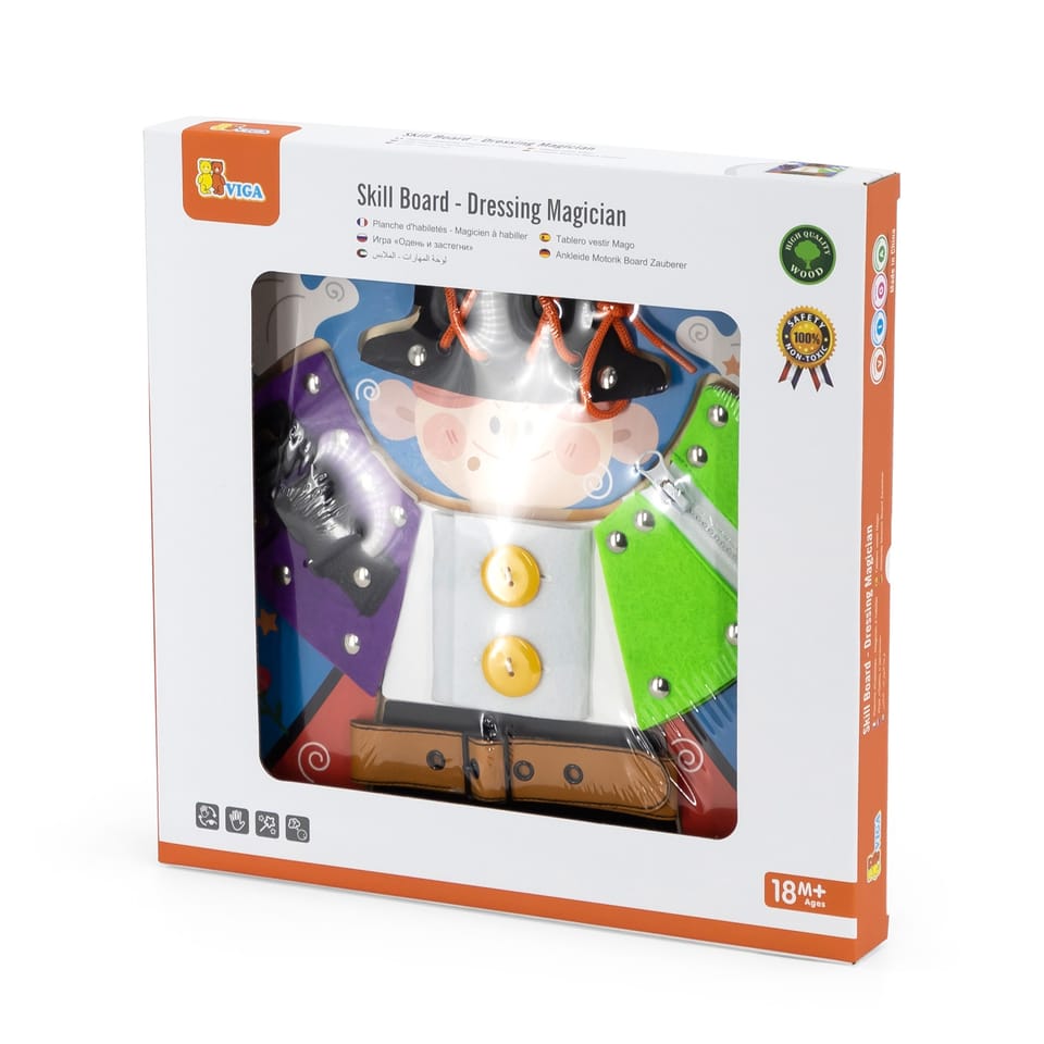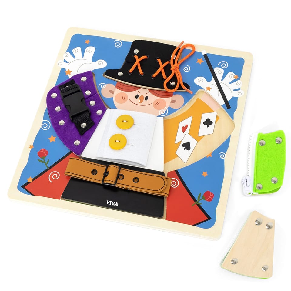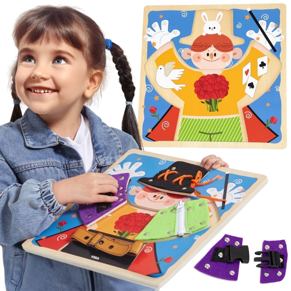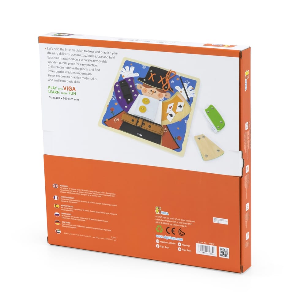 Przedstawiamy drewnianą zabawkę marki VIGA – magiczne przebieranki.To fascynująca zabawka, która zapewnia dzieciom wiele godzin kreatywnej zabawy i rozwoju. Pomaga w ćwiczeniu umiejętności ubierania się za pomocą guzików, zamka błyskawicznego, klamry, sznurówki i paska. Każdy rodzaj zapięcia jest przymocowany do jednego drewnianego elementu, układanego na planszy z wyprofilowanymi otworami. Dzieci mogą wyjąć elementy i znaleźć grafiki ukryte pod spodem.Zabawka pomaga ćwiczyć zdolności motoryczne i uczy podstawowych czynności związanych z ubieraniem się. Stymuluje rozwój wyobraźni i pomaga rozwijać umiejętność łączenia elementów w spójną całość.Całość wykonana została z drewna bukowego i pomalowana nietoksycznymi farbami, które przyciągną wzrok oraz zachęcą do zabawy dając jednocześnie mnóstwo radości. Farby są w 100% bezpieczne, spełniają normy bezpieczeństwa EN71 i ASTM.Puzzle zapakowane są w kolorowy karton, w sam raz na prezent.Zabawka przeznaczona dla maluchów powyżej 18. miesiąca życia. Cała seria zabawek VIGA została stworzona aby sprostać oczekiwaniom rodziców i dzieci w doskonaleniu procesu ich rozwoju poprzez zabawę.DANE TECHNICZNE: Wymiar produktu: dł: 300mm x wys: 25mm x szer: 300mm Wymiary opakowania: dł: 310mm x wys: 35mm x szer: 305mm Waga: 0,5kgOpisy