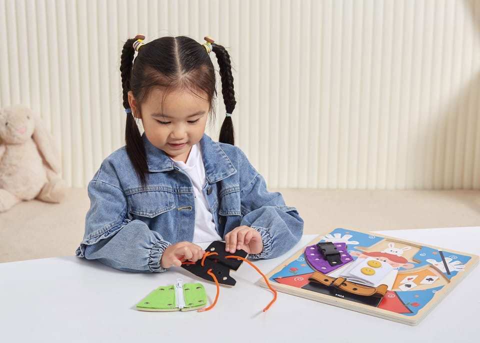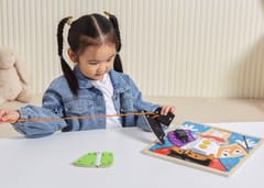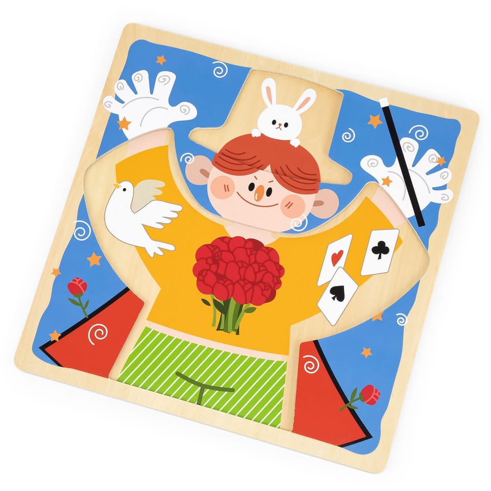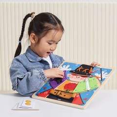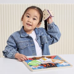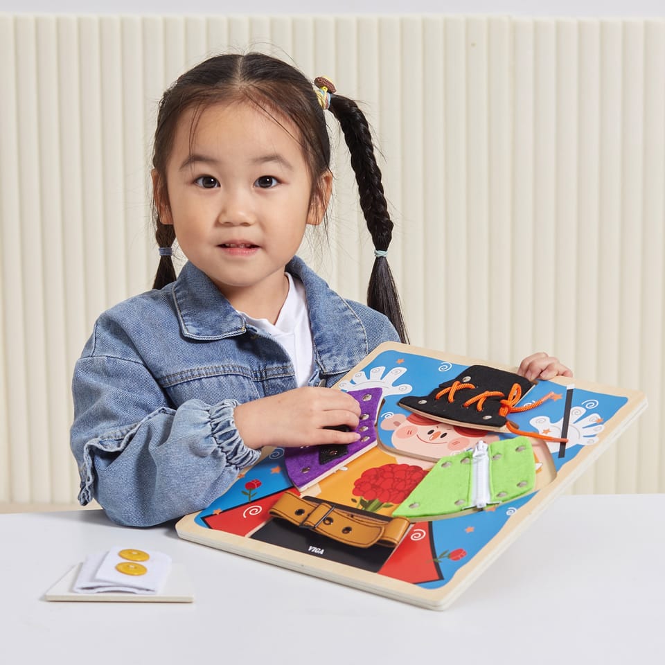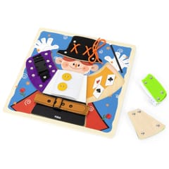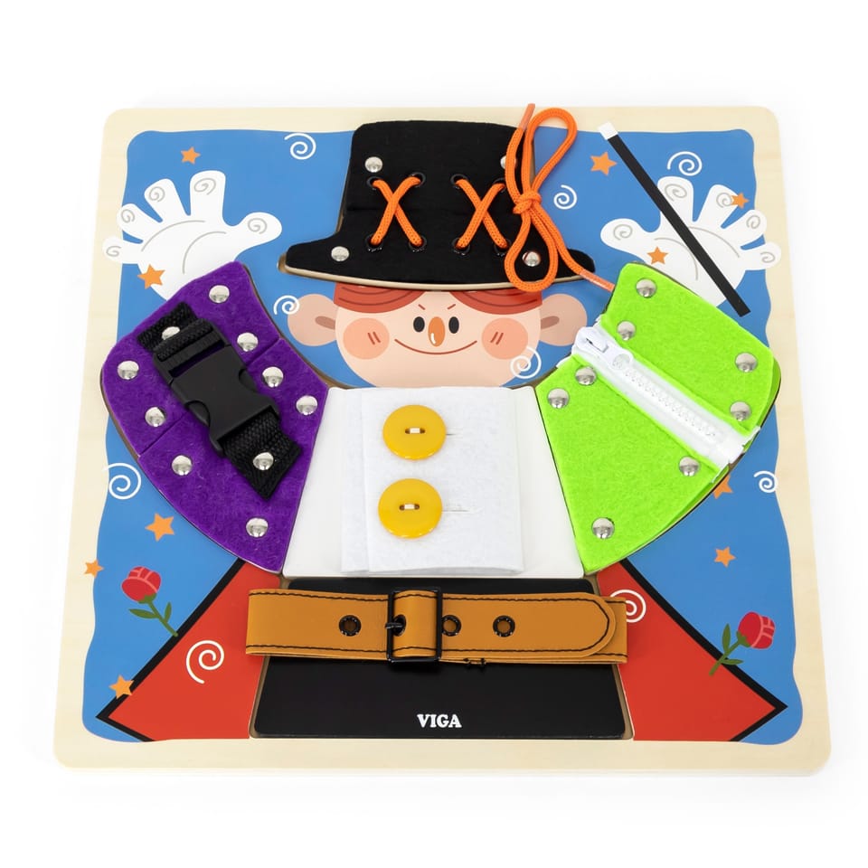 Przedstawiamy drewnianą zabawkę marki VIGA – magiczne przebieranki.To fascynująca zabawka, która zapewnia dzieciom wiele godzin kreatywnej zabawy i rozwoju. Pomaga w ćwiczeniu umiejętności ubierania się za pomocą guzików, zamka błyskawicznego, klamry, sznurówki i paska. Każdy rodzaj zapięcia jest przymocowany do jednego drewnianego elementu, układanego na planszy z wyprofilowanymi otworami. Dzieci mogą wyjąć elementy i znaleźć grafiki ukryte pod spodem.Zabawka pomaga ćwiczyć zdolności motoryczne i uczy podstawowych czynności związanych z ubieraniem się. Stymuluje rozwój wyobraźni i pomaga rozwijać umiejętność łączenia elementów w spójną całość.Całość wykonana została z drewna bukowego i pomalowana nietoksycznymi farbami, które przyciągną wzrok oraz zachęcą do zabawy dając jednocześnie mnóstwo radości. Farby są w 100% bezpieczne, spełniają normy bezpieczeństwa EN71 i ASTM.Puzzle zapakowane są w kolorowy karton, w sam raz na prezent.Zabawka przeznaczona dla maluchów powyżej 18. miesiąca życia. Cała seria zabawek VIGA została stworzona aby sprostać oczekiwaniom rodziców i dzieci w doskonaleniu procesu ich rozwoju poprzez zabawę.DANE TECHNICZNE: Wymiar produktu: dł: 300mm x wys: 25mm x szer: 300mm Wymiary opakowania: dł: 310mm x wys: 35mm x szer: 305mm Waga: 0,5kgOpisy