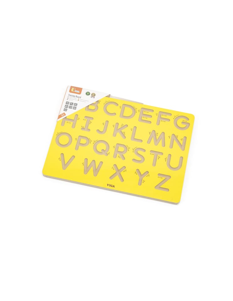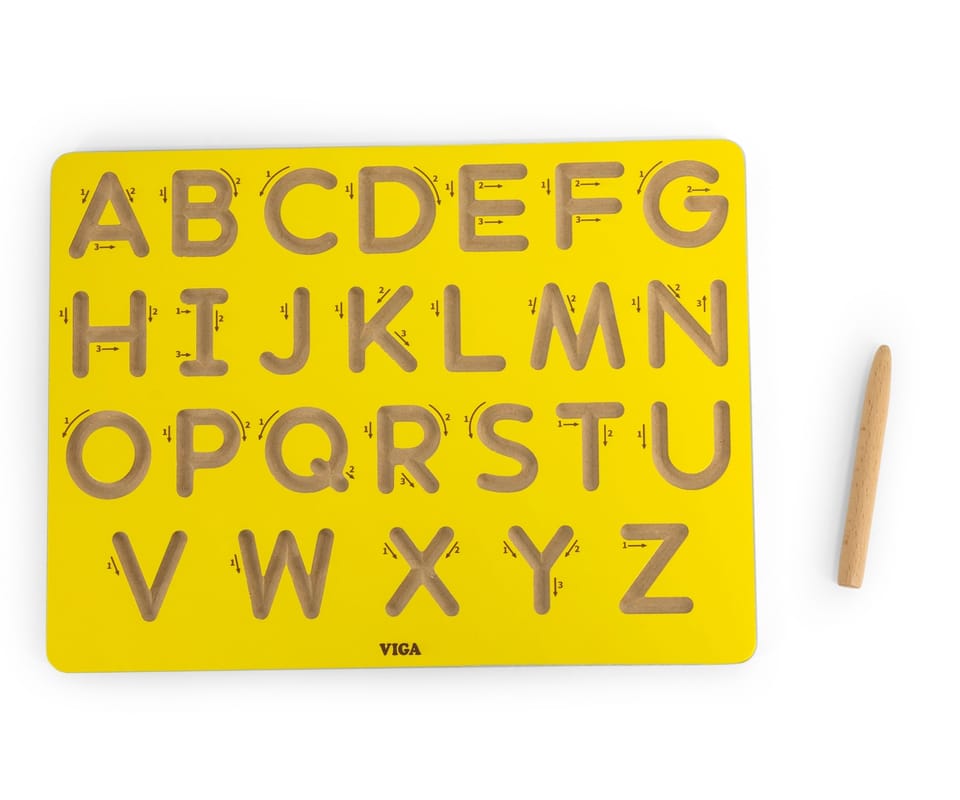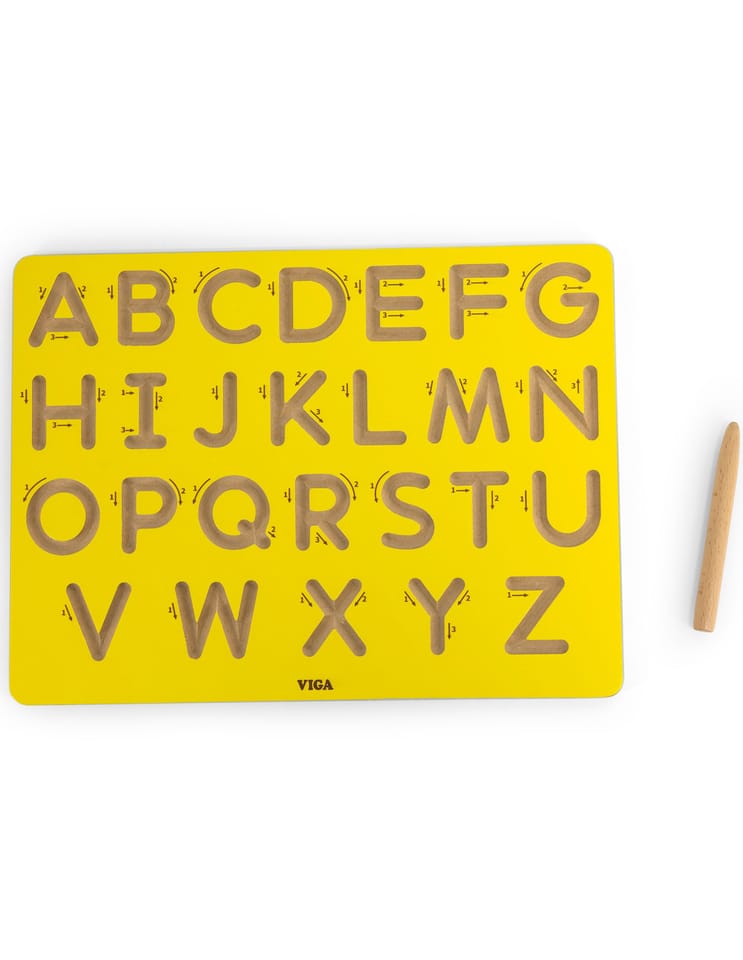 Drewniana tablica kreślarska od Viga to doskonałe narzędzie edukacyjne dla najmłodszych, które wspiera naukę alfabetu poprzez zabawę. Tablica o wymiarach 30 cm x 23,5 cm jest solidna i wykonana z drewna, a specjalnie wyprofilowane rowki w kształcie wielkich liter alfabetu pozwalają dziecku śledzić kształty liter za pomocą dołączonego drewnianego pióra. Każda litera posiada numery i strzałki wskazujące prawidłową kolejność ruchów, co wspomaga naukę pisania.Sposób korzystania: Dziecko używa drewnianego pióra do prowadzenia po rowkach liter zgodnie z oznaczeniami. Dzięki intuicyjnym strzałkom i numeracji maluchy uczą się poprawnego kierunku pisania. Zabawa polega na śledzeniu kształtów liter, co wspomaga ich zapamiętywanie i późniejsze odtwarzanie na papierze.Korzyści dla dziecka: