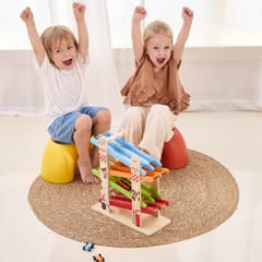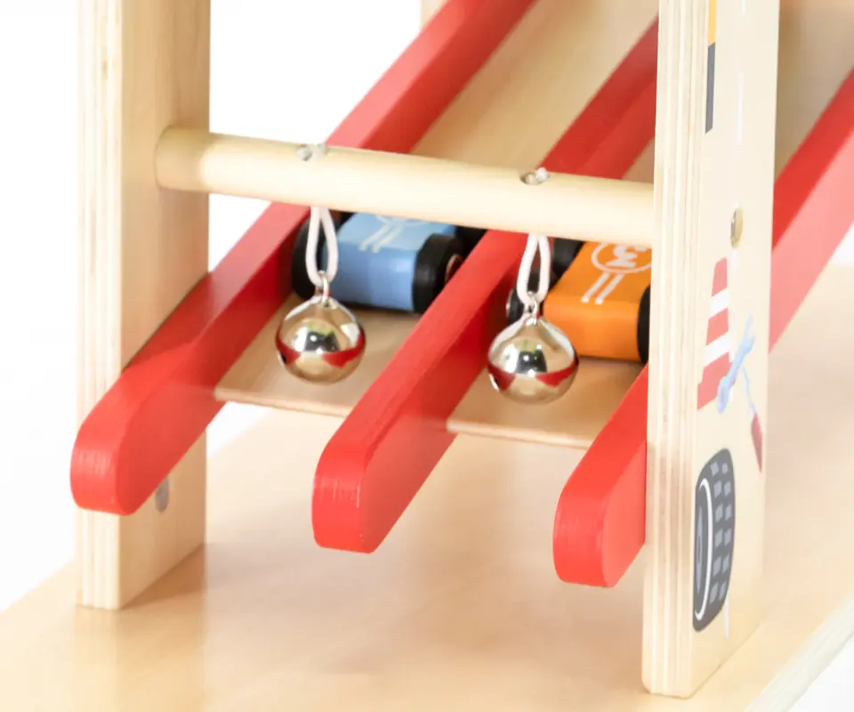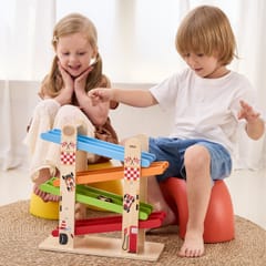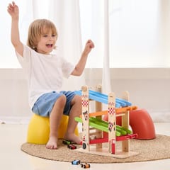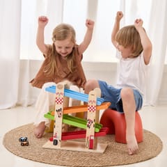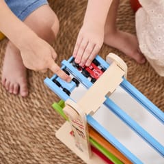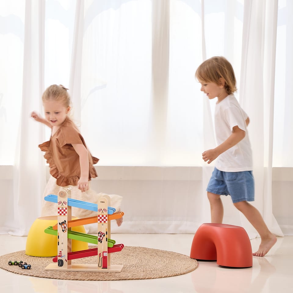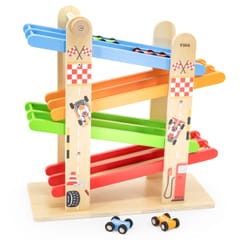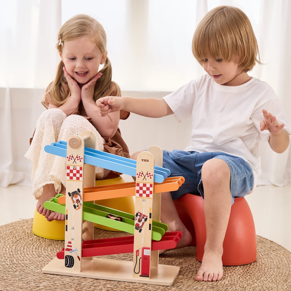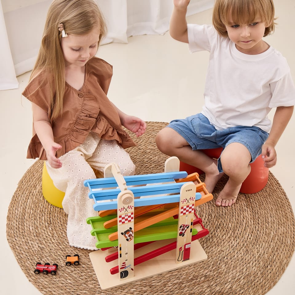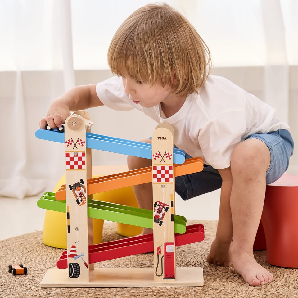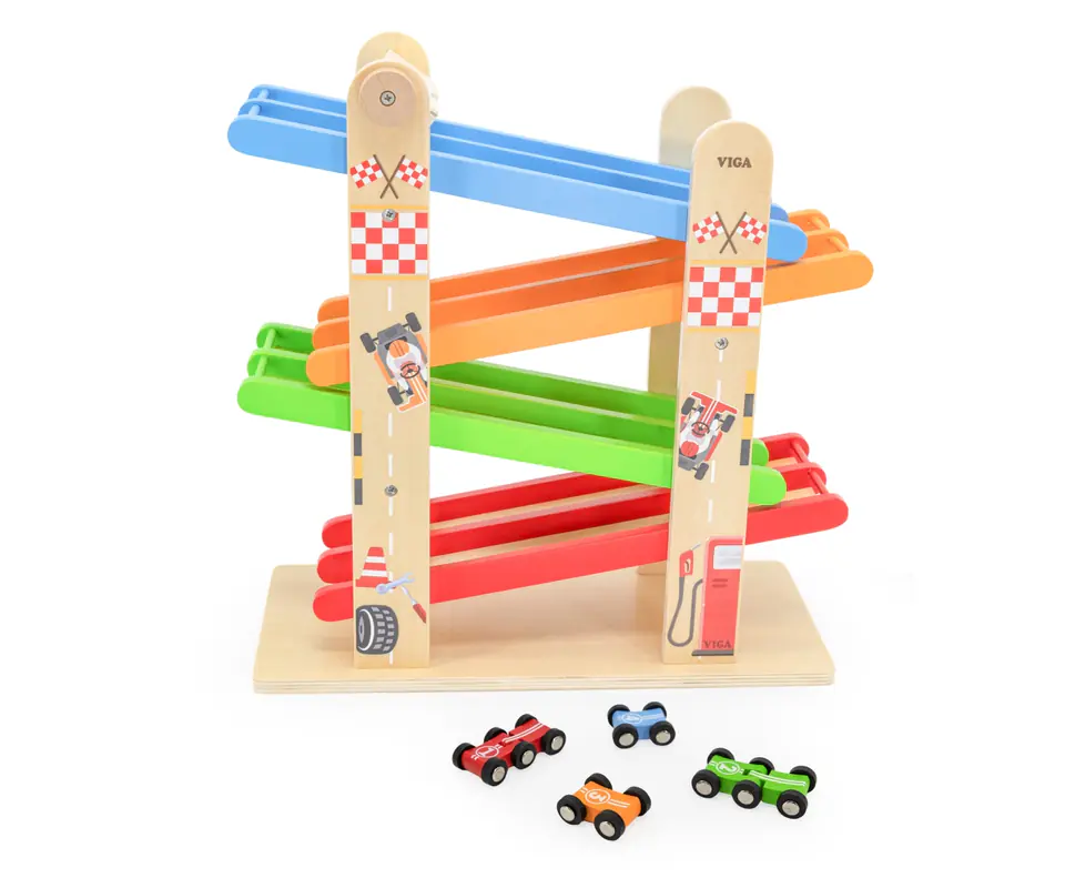 Na miejsca! Gotowi! Start!Tor wyścigowy dla samochodów od firmy Viga to jeden z najwspanialszych zabawek, która będzie służyła długo i zapewni Twojemu dziecku dużo ciekawej i kreatywnej zabawy. Ten kolorowy tor do wyścigów przeniesie dziecko w świat szybkich aut. Wspaniała zabawa rozpocznie się, gdy samochody ruszą z linii startu. Które autko dojedzie pierwsze? Każdy z 4 podwójnych torów jest wykonany z innego tworzywa: niebieski- jak jezioro z lustrzaną powłoką, żółty panel akrylowy jako preria, zielony- filcowy jako łąka i czerwony- drewniany jako tor wyścigowy. Dzięki czemu dzieci mogą obserwować jaki jest odgłos i prędkość auta na poszczególnej nawierzchni. Na górze znajduje się przekręcana blokada służąca do startowania autek a na mecie zawieszone są dzwoneczki, dzięki którym będzie wiadomo czyje autko dojechało pierwsze.To świetna okazja by wspólnie spędzić czas z dzieckiem i poznać w praktyce niektóre prawa fizyki.Zestaw zawiera: