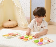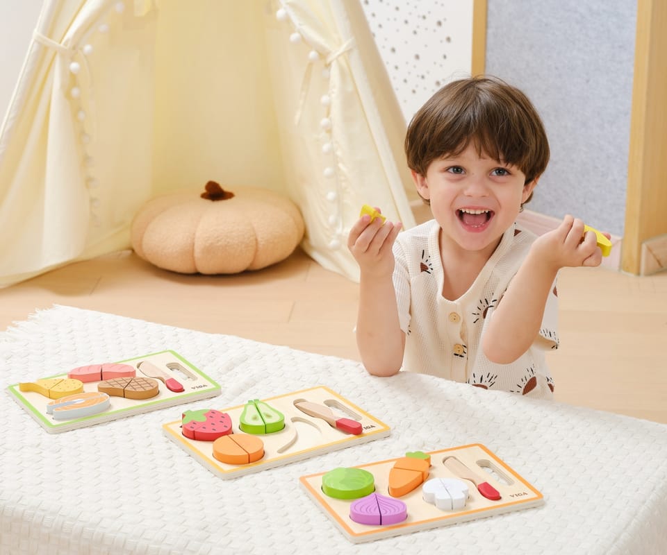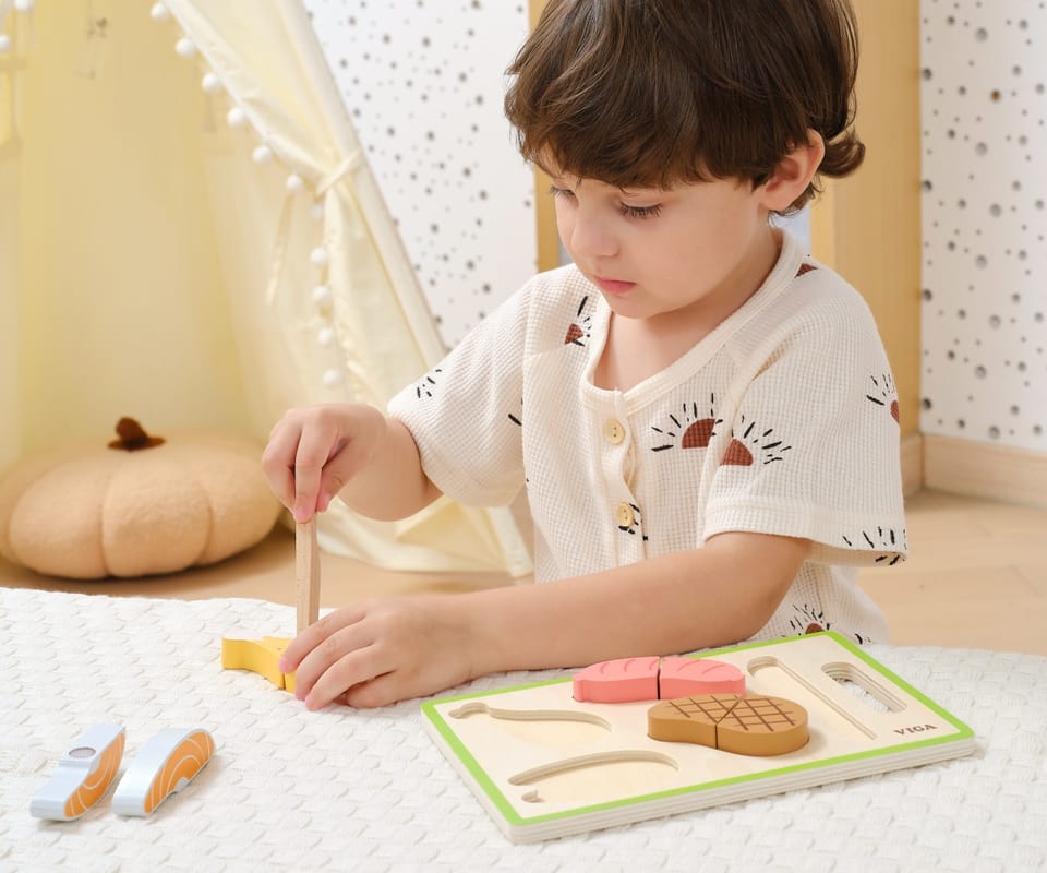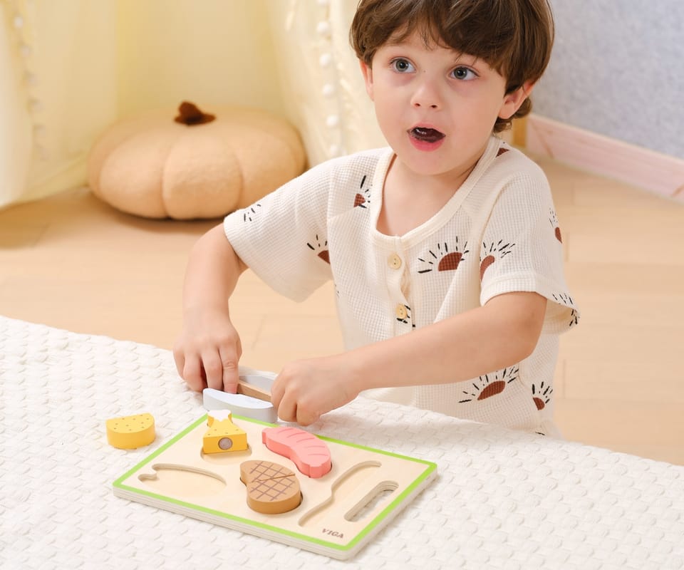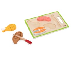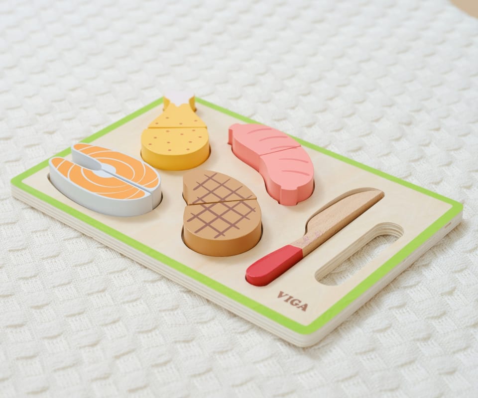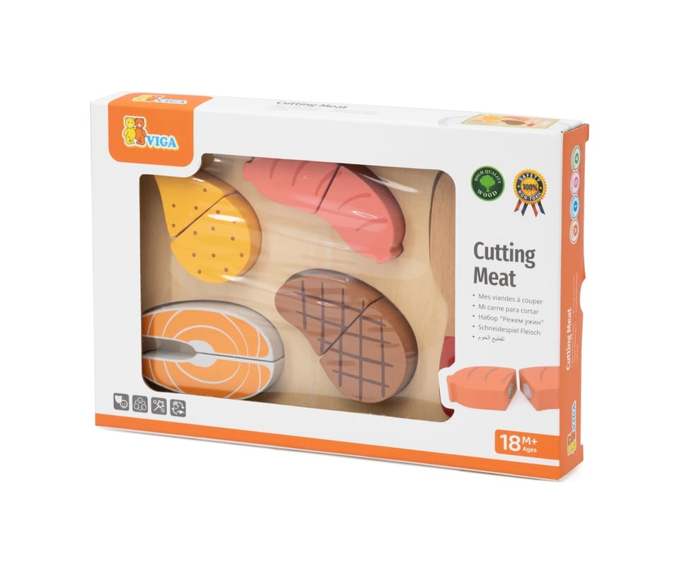 Viga 44791 Zabawa w krojenie – mięsoZestaw Viga 44791 Zabawa w krojenie – mięso to doskonała propozycja dla małych kucharzy, którzy lubią naśladować dorosłych w codziennych czynnościach. Drewniany komplet składa się z deski do krojenia, bezpiecznego nożyka oraz różnorodnych elementów przedstawiających produkty mięsne i rybne, takich jak stek, udko z kurczaka, filet z łososia czy kiełbaska.Każdy element można przeciąć na pół za pomocą drewnianego nożyka, a dzięki zastosowaniu rzepów części łatwo ponownie połączyć. Zabawa w krojenie rozwija koordynację ręka–oko, zdolności manualne i wyobraźnię, a także wprowadza dziecko w świat zdrowego gotowania i planowania posiłków.Zestaw wykonano z wysokiej jakości drewna, pomalowanego bezpiecznymi, nietoksycznymi farbami. Kolorowe, realistyczne elementy zachęcają do zabawy i nauki poprzez działanie.Zestaw zawiera:• Deskę do krojenia• Drewniany nożyk• 4 produkty spożywcze do krojenia (stek, udko kurczaka, łosoś, kiełbaska).Wiek: od 18 miesięcyWymiary produktu:Dł.220 x szer.150 x wys.19 mmWymiary opakowania:Dł.228 x szer.154 x wys.30 mmWaga: 0,33 kgINFORMACJE NA TEMAT BEZPIECZEŃSTWA PRODUKTUViga 44791 Zabawa w krojenie – mięsoZabawka przeznaczona dla dzieci w wieku od 18 miesiąca.PRODUCENT:Ningbo Viga International Co., Ltd.20F, 588 CANHGAI ROAD315040, NINGBO, Chinye-mail: sales@vigatoys.comIMPORTER:PM INVESTMENT GROUP Napert, Soszyński Sp.k.Podkowy 1804-937 Warszawa, Polskaemail: info@pminvestment.plINSTRUKCJA OBSŁUGI. WAŻNE! PRZECZYTAJ UWAŻNIE I ZACHOWAJ DO PÓŹNIEJSZEGO STOSOWANIA.OSTRZEŻENIA! Przed użyciem zabawki usuń opakowanie. Nie używać zabawki jeśli jakikolwiek jej element jest uszkodzony lub go brakuje. Czyszczenie: Przetrzyj wilgotną ściereczką lub szczotką o miękkim włosiu zwilżoną w wodzie z mydłem. Nie mocz drewna w wodzie. Po umyciu wytrzyj do sucha czystą ściereczką.