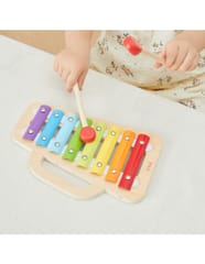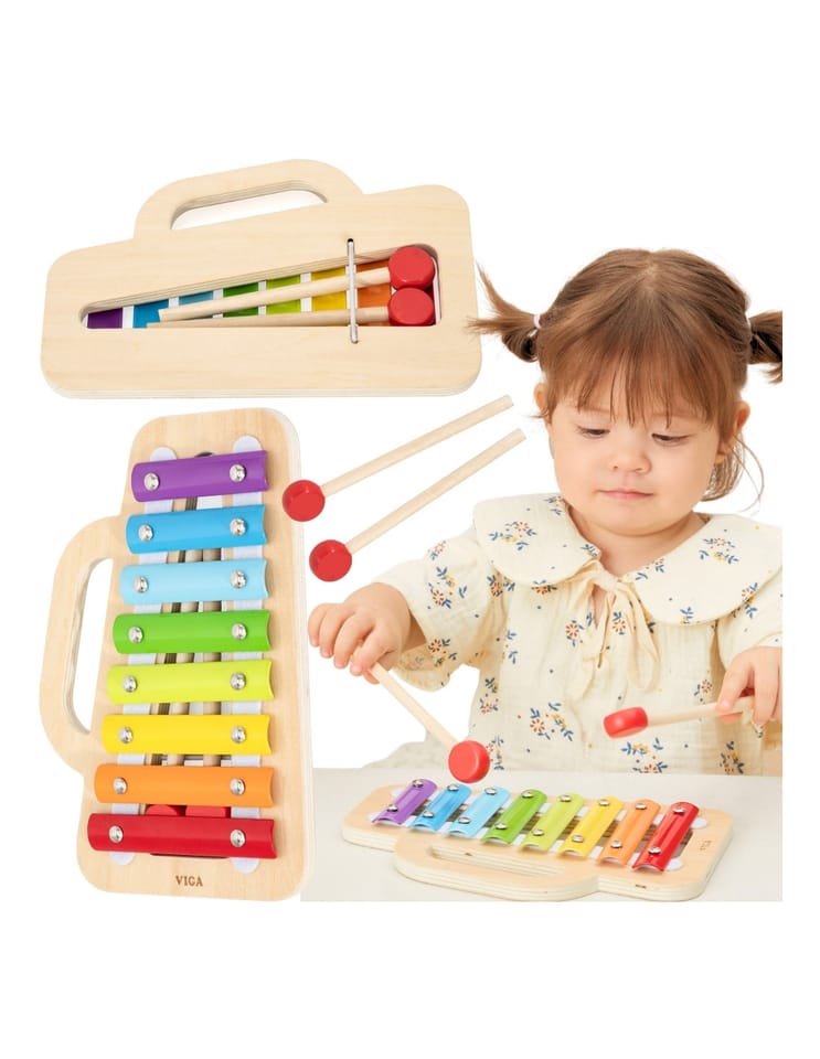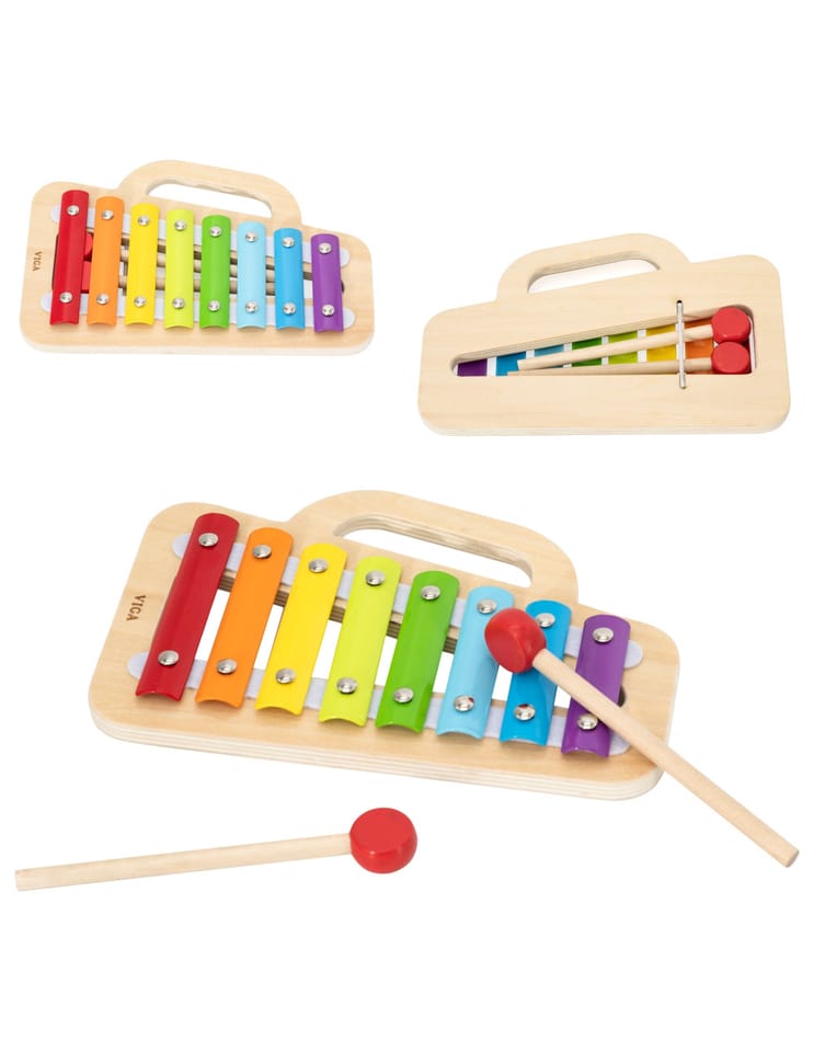 Viga 44793 Drewniany ksylofonKolorowy drewniany ksylofon Viga 44793 to idealna zabawka dla małych muzyków!Dzięki ośmiu metalowym płytkom w różnych barwach dziecko może tworzyć swoje pierwsze melodie, poznawać dźwięki i kolory, a przy tym rozwijać koordynację, słuch muzyczny i poczucie rytmu.Zabawka wykonana jest z wysokiej jakości drewna, a każda listwa ksylofonu pomalowana została bezpiecznymi, nietoksycznymi farbami na bazie wody. Zestaw zawiera dwie pałeczki oraz wygodny uchwyt do przenoszenia, co ułatwia zabranie instrumentu wszędzie tam, gdzie czeka zabawa.Z tyłu instrumentu znajduje się praktyczny schowek na pałeczki, dzięki czemu można je bezpiecznie przechowywać po zakończeniu gry.Cechy produktu:• Producent: Viga Toys• Model: 44793• Wiek: od 18 miesięcy• Materiał: drewno i metal• W zestawie: ksylofon + 2 pałeczki• Ilość tonów: 8• Farby: nietoksyczne, wodne• Certyfikaty: CE, EN71, ASTM, UKCAZalety zabawki:• Rozwija słuch muzyczny i poczucie rytmu,• Uczy koordynacji i koncentracji,• Wspiera rozwój motoryki małej,• Zachęca do twórczej i radosnej zabawy,• Wykonany z naturalnych, bezpiecznych materiałów.Viga 44793 Drewniany ksylofon to klasyczny instrument, który rozbudzi w dziecku pasję do muzyki i dostarczy mnóstwo radości podczas pierwszych muzycznych eksperymentów.Wymiary produktu:Dł.220 x szer.146 x wys.20 mmWymiary opakowania:Dł.226 x szer.155 x wys.38 mmWaga: 0,33 kgINFORMACJE NA TEMAT BEZPIECZEŃSTWA PRODUKTUViga 44793 Drewniany ksylofonZabawka przeznaczona dla dzieci w wieku od 18 miesiąca.PRODUCENT:Ningbo Viga International Co., Ltd.20F, 588 CANHGAI ROAD315040, NINGBO, Chinye-mail: sales@vigatoys.comIMPORTER:PM INVESTMENT GROUP Napert, Soszyński Sp.k.Podkowy 1804-937 Warszawa, Polskaemail: info@pminvestment.plINSTRUKCJA OBSŁUGI. WAŻNE! PRZECZYTAJ UWAŻNIE I ZACHOWAJ DO PÓŹNIEJSZEGO STOSOWANIA.OSTRZEŻENIA! Przed użyciem zabawki usuń opakowanie. Nie używać zabawki jeśli jakikolwiek jej element jest uszkodzony lub go brakuje. Czyszczenie: Przetrzyj wilgotną ściereczką lub szczotką o miękkim włosiu zwilżoną w wodzie z mydłem. Nie mocz drewna w wodzie. Po umyciu wytrzyj do sucha czystą ściereczką.