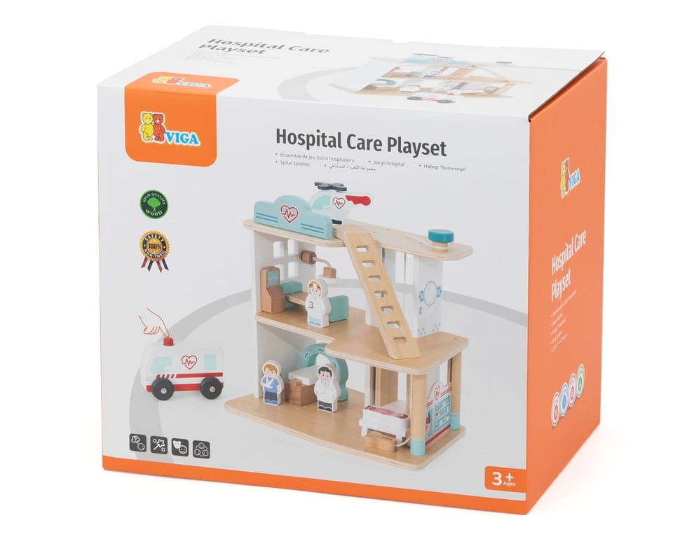 Viga 44802 Drewniany szpital z akcesoriamiDrewniany szpital Viga 44802 to doskonały zestaw dla małych lekarzy i pielęgniarek, którzy chcą pomagać pacjentom i wcielać się w role medycznych bohaterów!Ta pięknie wykonana zabawka rozwija wyobraźnię, empatię i umiejętności społeczne dziecka, jednocześnie zapewniając wiele godzin kreatywnej zabawy.Szpital składa się z dwóch pięter oraz lądowiska dla helikoptera. Każde pomieszczenie zostało zaprojektowane tak, aby przypominało prawdziwe sale szpitalne – znajdziemy tu gabinet lekarski, pracownię RTG, pokój badań, łóżka dla pacjentów i sprzęt medyczny.W zestawie znajdują się figurki lekarzy, pielęgniarki i pacjentów, a także ambulans i helikopter ratunkowy, które pozwalają tworzyć realistyczne scenariusze ratunkowe.Całość wykonano z wysokiej jakości drewna, pomalowanego nietoksycznymi, bezpiecznymi farbami w pastelowych kolorach, co nadaje zabawce elegancki i przyjazny wygląd.Cechy produktu:• Producent: Viga Toys• Model: 44802• Wiek: od 3 lat• Materiał: drewno• W zestawie: budynek szpitala, 3 figurki lekarzy, 1 pacjent, ambulans, helikopter, łóżka, sprzęty medyczne i mebelki• Farby: nietoksyczne, wodne• Certyfikaty: CE, EN71, ASTM, UKCAZalety zabawki:• Rozwija wyobraźnię, empatię i zdolności społeczne,• Zachęca do zabawy w odgrywanie ról,• Wspiera rozwój mowy i kreatywnego myślenia,• Solidne wykonanie gwarantuje bezpieczeństwo i trwałość,• Piękne, pastelowe kolory działają uspokajająco i estetycznie.Viga 44802 Drewniany szpital z akcesoriami to idealny prezent dla dzieci, które lubią opiekować się innymi i poznawać świat medycyny poprzez zabawę. Z tym zestawem każda akcja ratunkowa zakończy się sukcesem!Wymiary produktu:Dł.330 x szer.225 x wys.325 mmWymiary opakowania:Dł.360 x szer.330 x wys.240 mmWaga: 0,33 kgINFORMACJE NA TEMAT BEZPIECZEŃSTWA PRODUKTUViga 44802 Drewniany szpital z akcesoriamiZabawka przeznaczona dla dzieci w wieku od 3 roku.PRODUCENT:Ningbo Viga International Co., Ltd.20F, 588 CANHGAI ROAD315040, NINGBO, Chinye-mail: sales@vigatoys.comIMPORTER:PM INVESTMENT GROUP Napert, Soszyński Sp.k.Podkowy 1804-937 Warszawa, Polskaemail: info@pminvestment.plINSTRUKCJA OBSŁUGI. WAŻNE! PRZECZYTAJ UWAŻNIE I ZACHOWAJ DO PÓŹNIEJSZEGO STOSOWANIA.OSTRZEŻENIA! Przed użyciem zabawki usuń opakowanie. Nie używać zabawki jeśli jakikolwiek jej element jest uszkodzony lub go brakuje. Czyszczenie: Przetrzyj wilgotną ściereczką lub szczotką o miękkim włosiu zwilżoną w wodzie z mydłem. Nie mocz drewna w wodzie. Po umyciu wytrzyj do sucha czystą ściereczką.