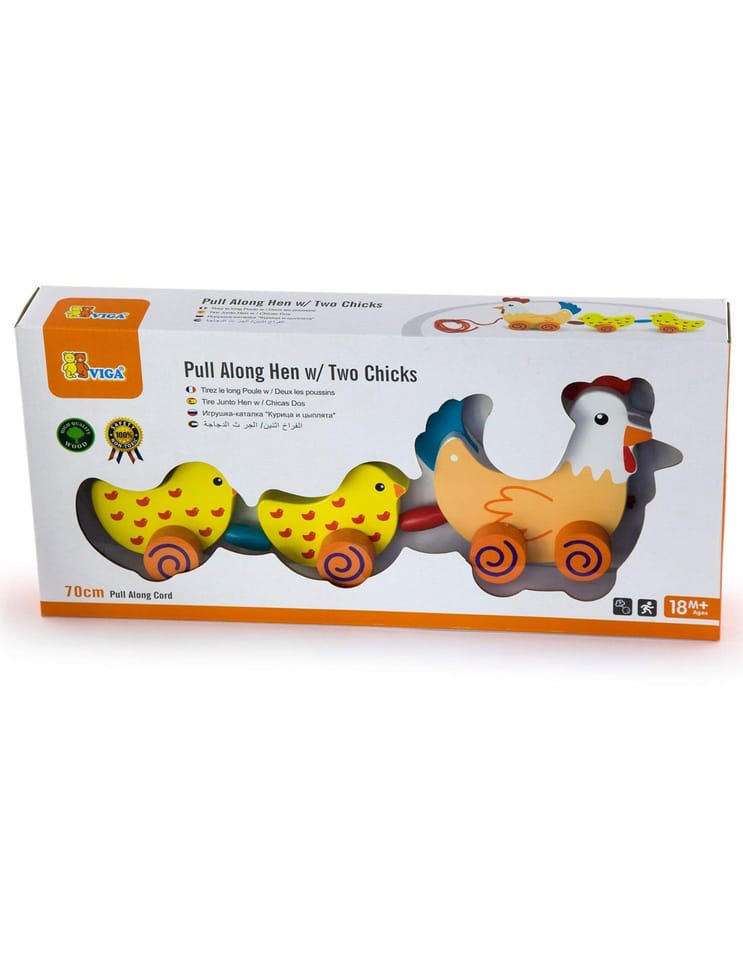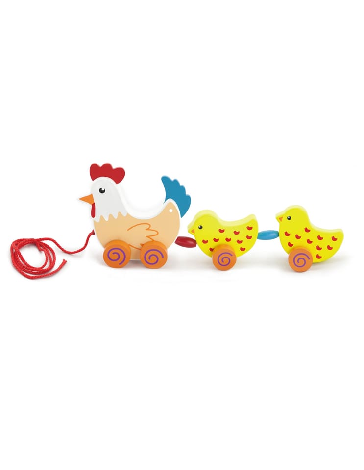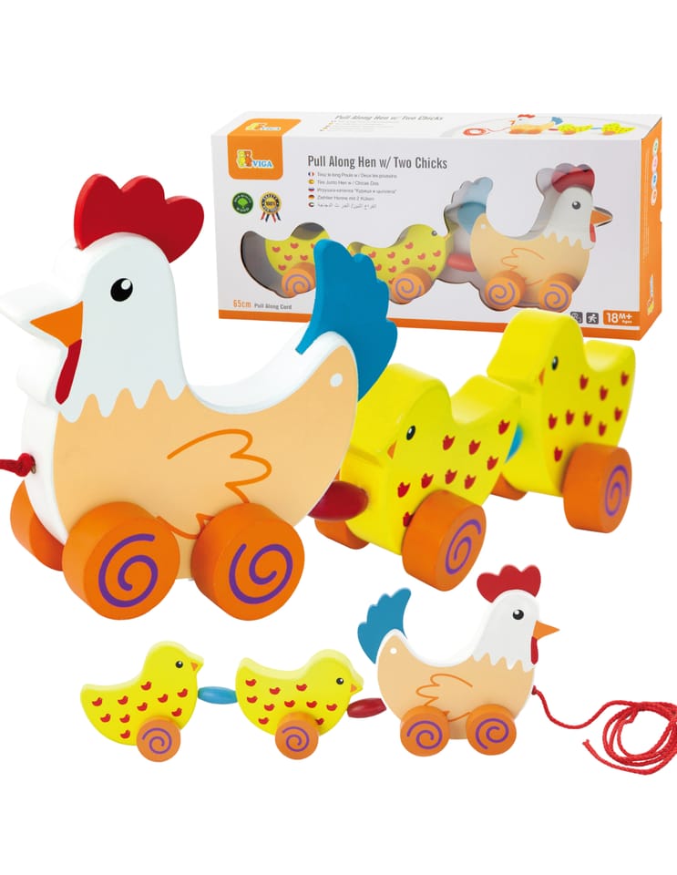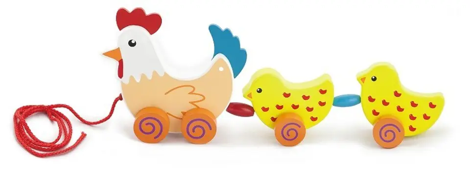 VIGA KURKA Z KURCZACZKAMI DO CIĄGANIA 50078Kurka z kurczakami na sznurku od firmy Viga to zabawka, która sprawdzi się jako pomoc u dzieci, które zaczynają stawiać pierwsze kroki. Wesoła gromadka będzie dla nich dodatkową atrakcją i zachętą do doskonalenia umiejętności chodzenia.Kurka i jej dwa pisklaki połączone są ze sobą czerwonym sznurkiem. Po między małymi ptaszkami umieszczone są kolorowe koraliki. Podczas ciągnięcia cała gromadka będzie się poruszać w zabawny sposób.Zabawka przeznaczona dla maluchów od 18 miesiąca życia.Całość wykonana została z drewna lakierowanego i pomalowana nie toksycznymi farbami w żywe barwy, które zadowolą każdego użytkownika i dadzą mnóstwo radości z zabawy.Naszym priorytetem jest bezpieczeństwo i jakość naszego towaru, dlatego dbamy o to aby farby, którymi malujemy nasze zabawki nie były toksyczne i spełniały normy bezpieczeństwa ( EN71 i ASTM).DANE TECHNICZNEWymiar produktu:dł: 360mm x wys: 53mm x szer: 145mmWymiary opakowania:dł: 420mm x wys: 195mm x szer: 65mmINFORMACJE NA TEMAT BEZPIECZEŃSTWA PRODUKTUViga 50078 Kurka z kurczaczkami do ciąganiaZabawka przeznaczona dla dzieci w wieku powyżej od 18 miesięcy.OSTRZEŻENIE! Nieodpowiednie dla dzieci w wieku poniżej 18 miesiąca życia. Zawiera długą linkę. Ryzyko uduszenia.PRODUCENT:Ningbo Viga International Co., Ltd.20F, 588 CANHGAI ROAD315040, NINGBO, Chinye-mail: sales@vigatoys.comIMPORTER:PM INVESTMENT GROUP Napert, Soszyński Sp.k.Podkowy 1804-937 Warszawa, Polskaemail: info@pminvestment.plINSTRUKCJA OBSŁUGI. WAŻNE! PRZECZYTAJ UWAŻNIE I ZACHOWAJ DO PÓŹNIEJSZEGO STOSOWANIA.OSTRZEŻENIA! Przed użyciem zabawki usuń opakowanie. Nie używać zabawki jeśli jakikolwiek jej element jest uszkodzony lub go brakuje. Czyszczenie: Przetrzyj wilgotną ściereczką lub szczotką o miękkim włosiu zwilżoną w wodzie z mydłem. Nie mocz drewna w wodzie. Po umyciu wytrzyj do sucha czystą ściereczką.