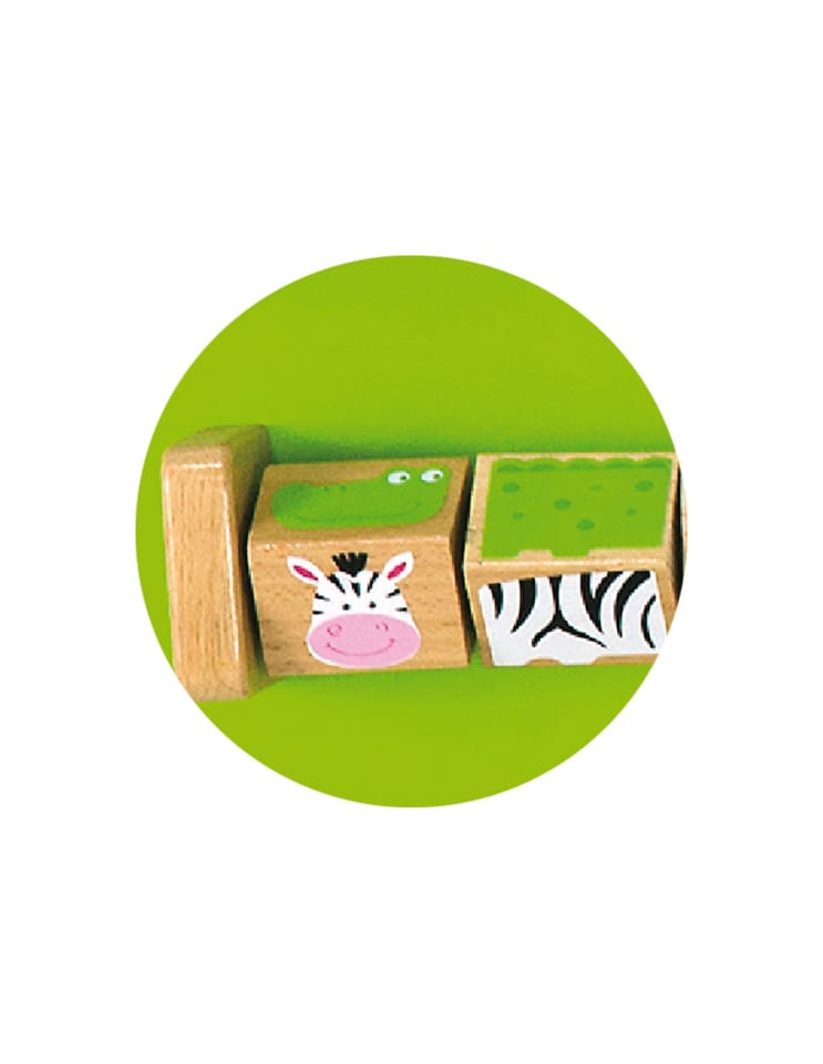 Zielony krokodyl – z ostrymi ząbkami zabierze dziecko w kolorowy świat łamigłówek. Zawieszony na ścianie będzie ozdobą dziecięcego pokoju, jak również ulubioną zabawką która nigdy się nie zgubi. Zamontowana na odpowiedniej wysokości dla dziecka i można się bawić bez końca.Wesoły krokodyl to trzy główne atrakcje: Układanka – klocki logiczne ze zwierzętami, dziecko obracając odpowiednio klocki może ułożyć cztery zwierzątka: krokodyla, zebrę, słonia i tygrysa. Pętla motoryczna na metalowym druciku, po którym dziecko prowadząc drewniane koraliki ćwiczy manualnie rękę oraz koordynację wzrokowo-ruchową. Labirynt - przesuwanka, każda z linii ma swój własny kształt dla lepszego ćwiczenia koncentracji. Na każdej z przesuwanek umieszczono figurę geometryczną Linie przypominają kształtem daną figurę: kwadrat, koło i trójkąt. Dziecko przesuwając kształty po linii nabiera wprawy potrzebnej później do np. rysowania takich kształtów.Dzięki wymiarom zabawki może się nią bawić więcej niż jedno dziecko.Panel ścienny montowany do ściany za pomocą czterech kołków rozporowych. Kołki znajdują się w zestawie.Wiek: 12m+Wymiary: 91 x 32 x 6cmDeklaracja zgodności CE