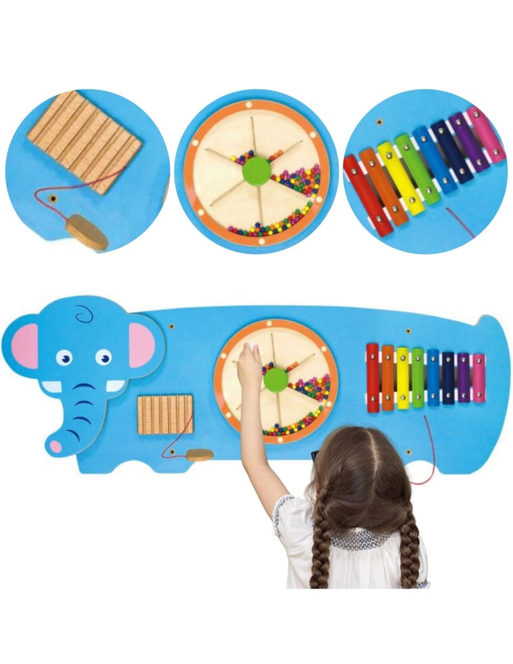 Wspaniała propozycja od Viga – sensoryczna zabawka edukacyjna którą wystarczy przykręcić do ściany. Oto zestaw zabawek sensorycznych i manipulacyjnych w formie panelu do zawieszenia na ścianie. Słoń sprawdzi się doskonale w domu, przedszkolu, placach zabaw, a także w miejscach gdzie często goszczą dzieci… do kącików zabaw, poczekalni…