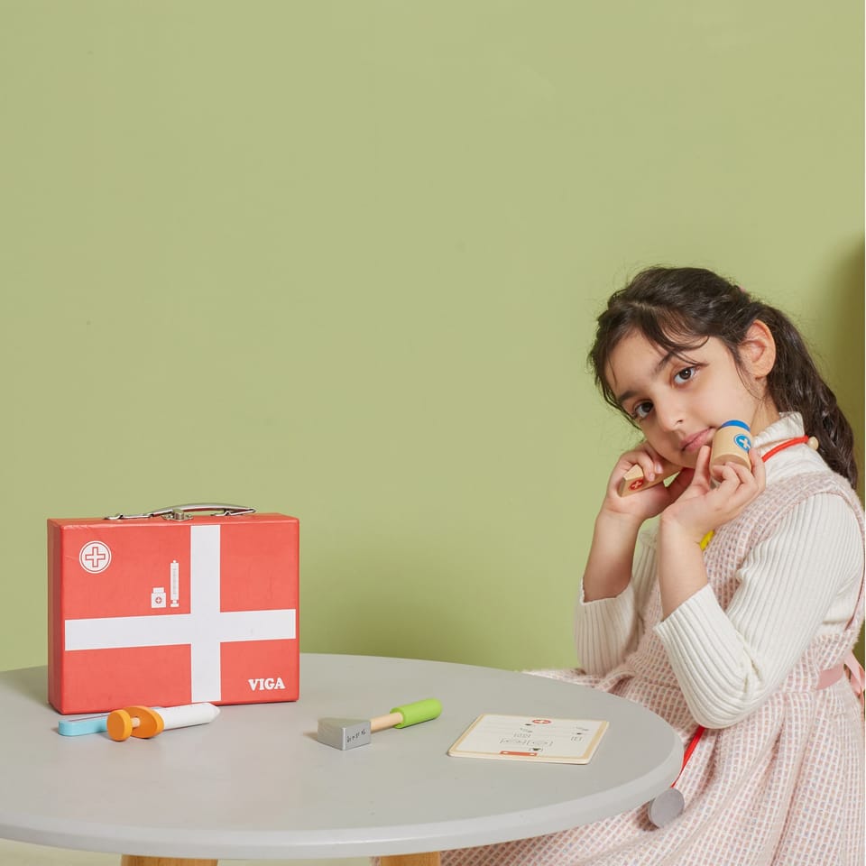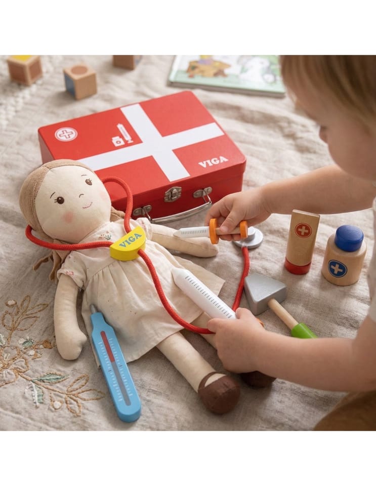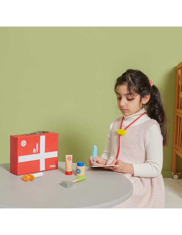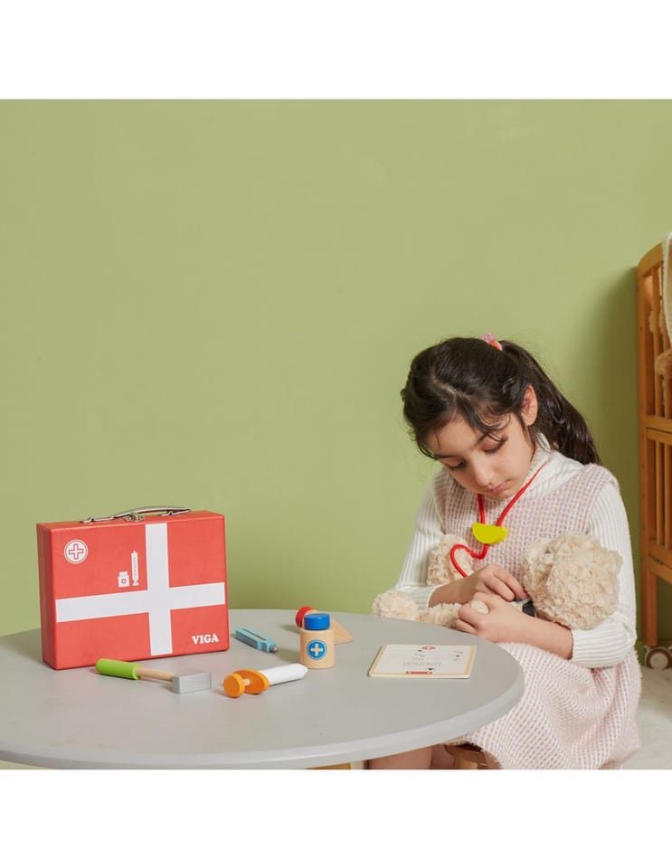 Wspaniały zestaw do zabawy w lekarza zapakowany w walizeczkę, którą można zabierać ze sobą w wszędzie – do Babci, na wakacje. Dziecko podczas zabawy rozwinie swoją inteligencje emocjonalną. Pomoże przezwyciężyć strach przed strzykawkami, oraz zrozumieć iż nawet gorzki syropek jest dla ich zdrowia.
