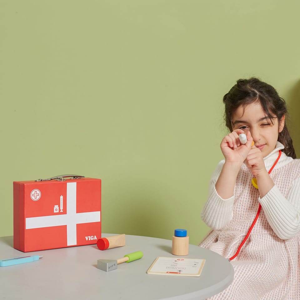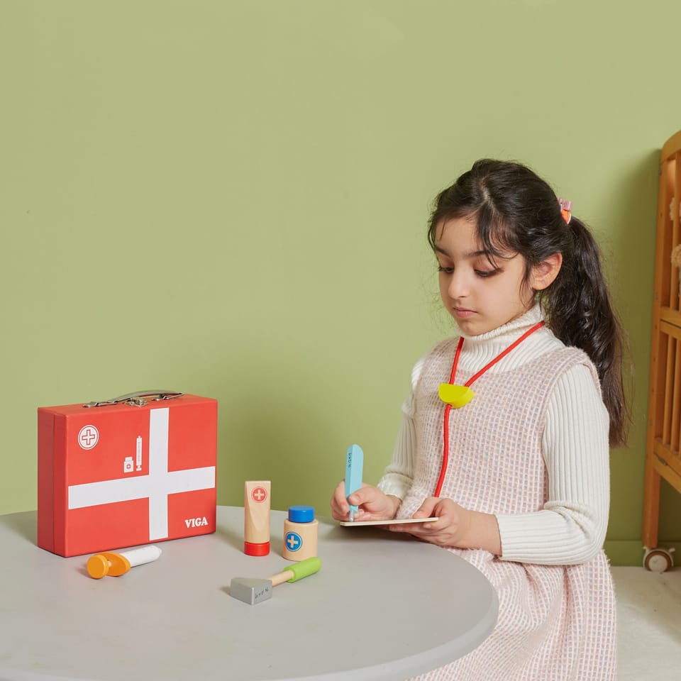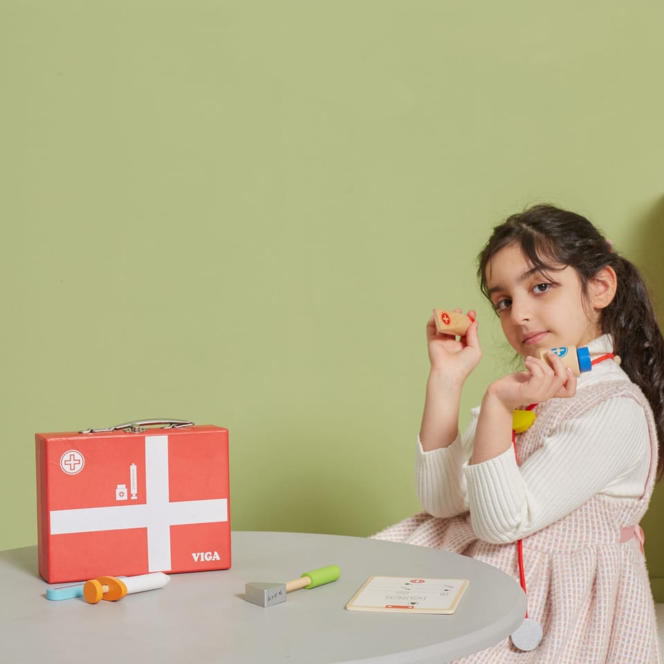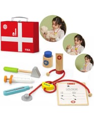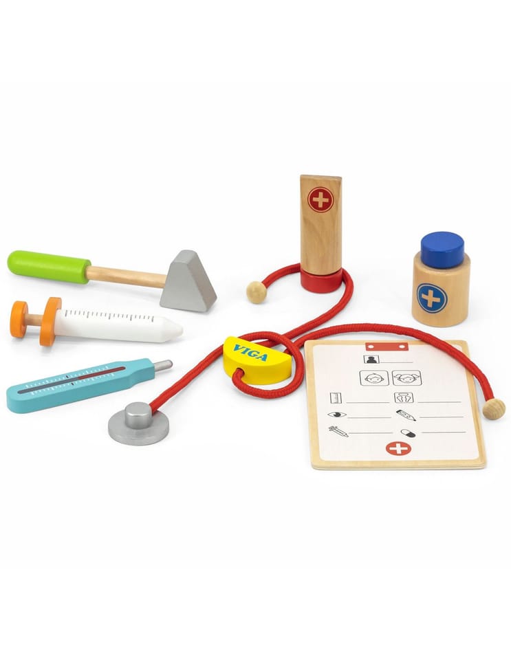 Wspaniały zestaw do zabawy w lekarza zapakowany w walizeczkę, którą można zabierać ze sobą w wszędzie – do Babci, na wakacje. Dziecko podczas zabawy rozwinie swoją inteligencje emocjonalną. Pomoże przezwyciężyć strach przed strzykawkami, oraz zrozumieć iż nawet gorzki syropek jest dla ich zdrowia.