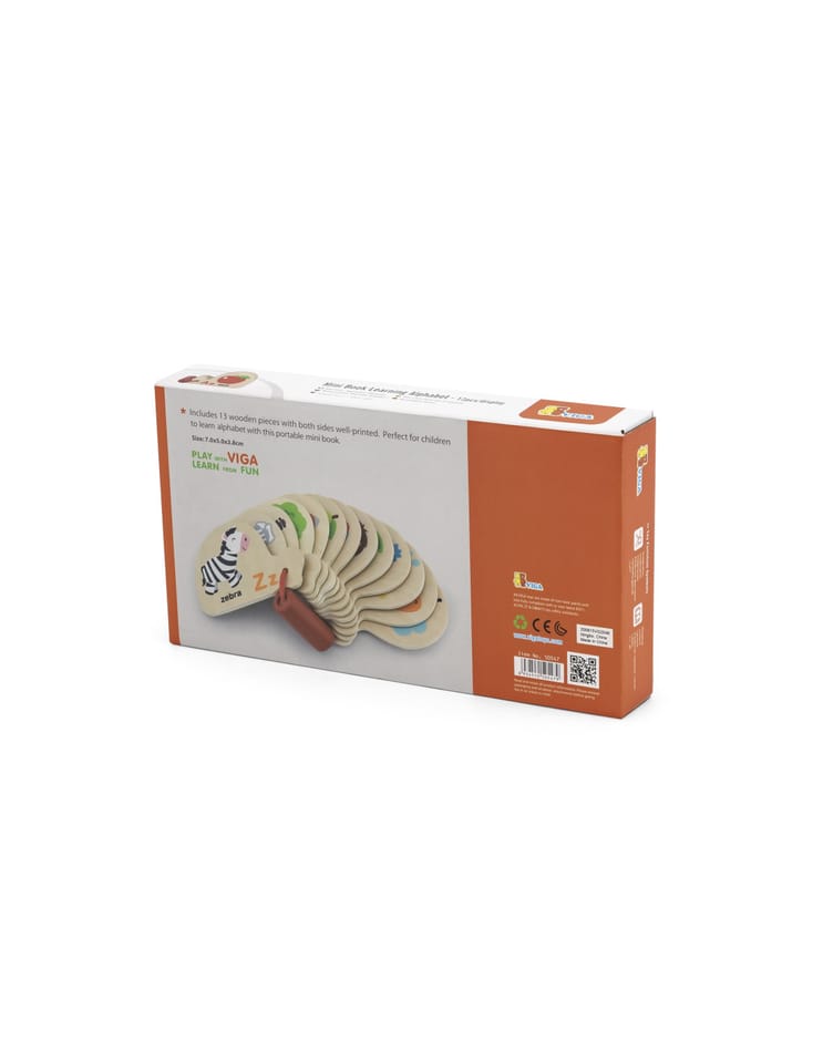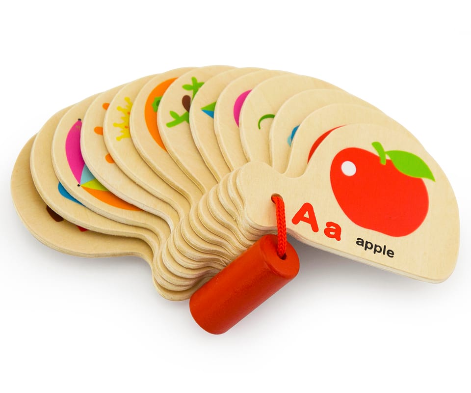 Książeczka do nauki angielskiego alfabetu to idealna pomoc dydaktyczna dla dzieci. Na każdej karcie znajduje się inny obrazek ułatwiający zapamiętywanie dziecku poprzez kojarzenie, a tuż pod nim jego angielska nazwa i pierwsza litera danego słowa (mała i wielka). Wszystkie karty połączone są czerwonym sznurkiem, przez który przewleczony jest także czerwony koralik.