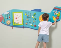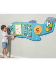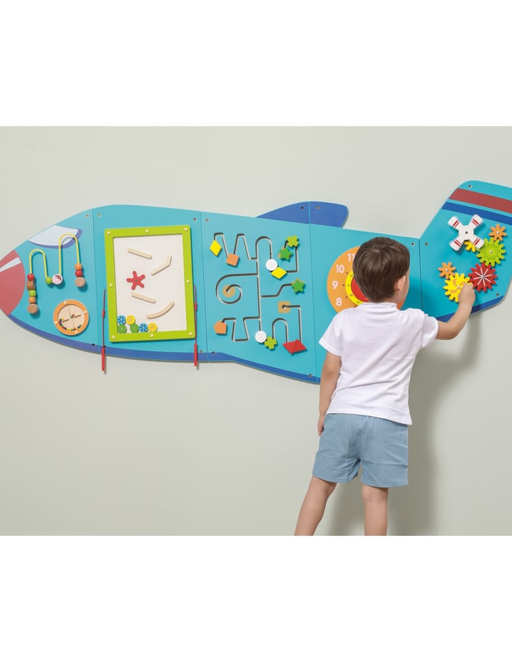 Samolot zbudowany z pięciu elementów- na każdym z nich jest moc atrakcji. Zabierze w podróż niejednego młodego poszukiwacza przygody. Na pierwszej tablicy znajduje się koło „młyńskie wraz z piłeczkami” – które wprawione w ruch oczarują swym dźwiękiem, nie jednego smyka. Obok niego znajduje się „winda” po której dziecko przeprowadzi barwne koraliki.