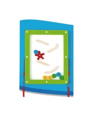 Na kolejnej planszy znajduje się magnetyczna gra – która przyciągnie do siebie wszystkie dzieci. Na białej tablicy znajduje się tor przeszkód… zadaniem dziecka jest przeprowadzić „pionek” na metę wyścigu, przy użyciu magnetycznej „różdżki” – przymocowanej do planszy. Dziecko posługując się „różdżką” rozwija takie umiejętności jak – koncentracja uwagi, kreatywność, analityczne myślenie.