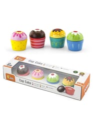 Zestaw ciasteczka „CUP CAKE” od firmy Viga to idealna zabawka, która pobudzi wyobraźnię Waszego dziecka. Młodzi kucharze często lubią pomagać swoim rodzicom w kuchni, dlatego teraz sami będą mogli przygotować pyszne muffiny jak prawdziwi cukiernicy. Babeczki świetnie uzupełnią kuchenne wyposażenie małych gospodyń i kucharzy. Dzięki nim dziecko stworzy idealne przyjęcie lub poczęstunek dla swoich lalek czy misiów.Zestaw zawiera 4 babeczki, które oblane są kolorowym lukrem lub pyszną czekoladą. Na czubku każdej z nich widnieje czerwona wisienka lub słodka truskaweczka.Dodatkową zaletą jest fakt, że wszystkie produkty połączone są rzepami i po ich odczepieniu można stworzyć zupełnie nową muffinę lub z powrotem połączyć ją w jedną całość.