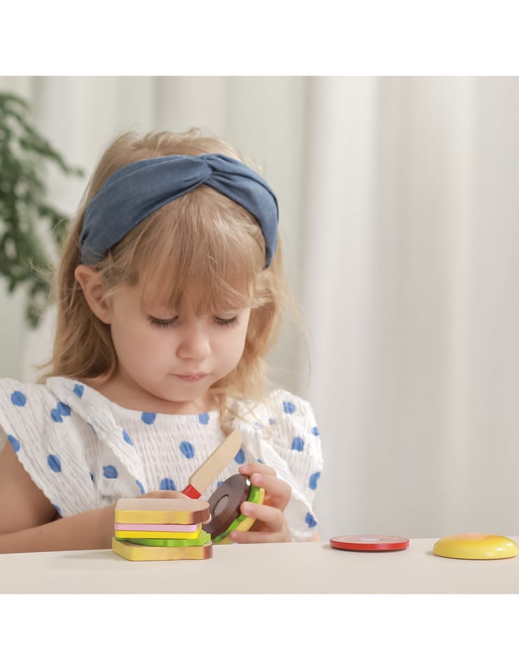 Przy pomocy zestawu do krojenia "Hamburger i kanapka" przygotowywanie śniadania staje się prawdziwą przyjemnością. Teraz Twoje dziecko może stać się małym kucharzem, który przygotowuje pyszne kanapeczki dla swoich ulubionych lalek i pluszaków. Bezpieczny nożyk wykonany z drewna pozwala dziecku "kroić" chlebek, wędlinę i ser. To nie tylko zabawa, ale także doskonała okazja, aby uczyć dziecko korzystania z ostrych narzędzi kuchennych. Wszystkie elementy zestawu łączą się za pomocą rzepów, dzięki czemu zabawa trwa w nieskończoność. Po zakończeniu śniadania można ponownie połączyć wszystkie elementy w jedną całość. Zabawka wykonana jest z drewna lakierowanego i malowana nietoksycznymi farbami w żywych kolorach, które zachwycą każdego użytkownika i dostarczą mnóstwo radości.