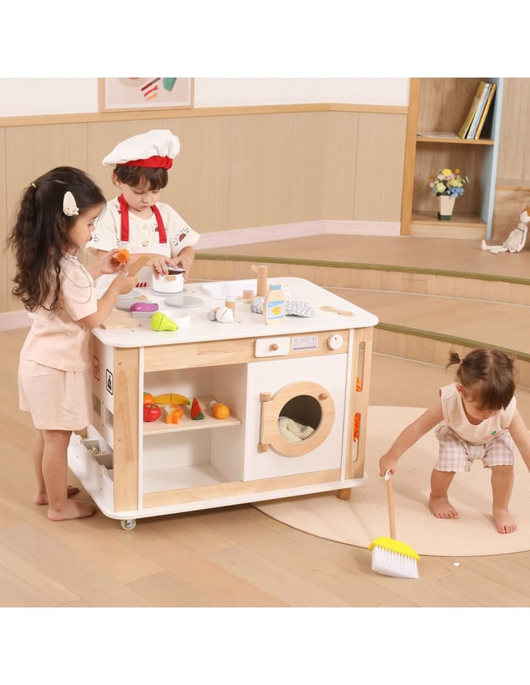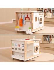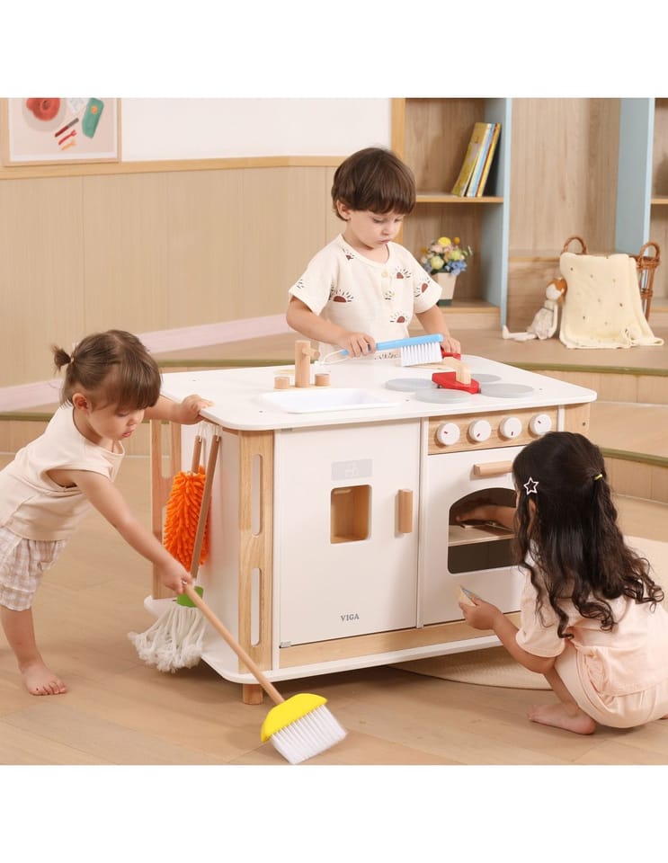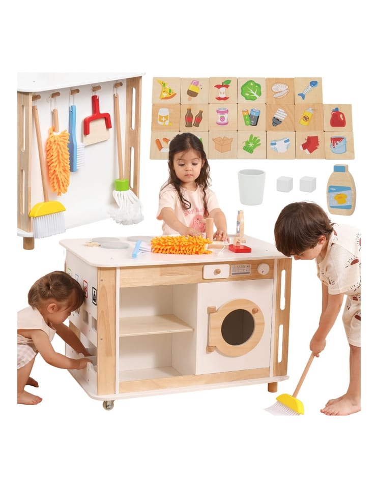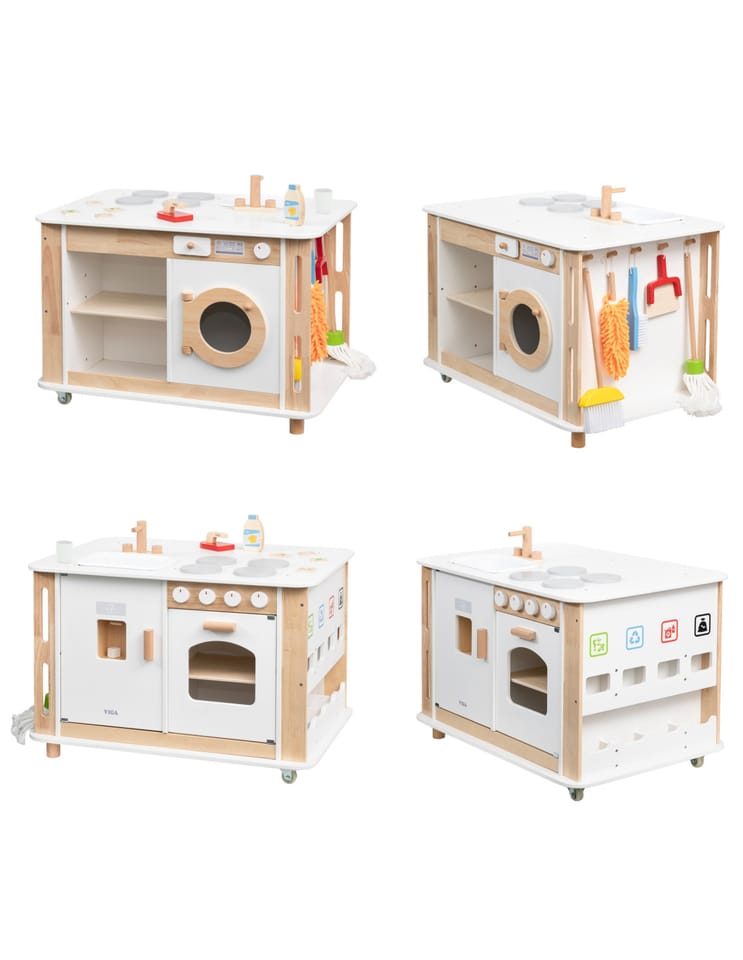 Odkryj zabawkę, która zamieni pokój Twojego dziecka w tętniące życiem centrum domowych przygód i radosnej nauki! Ten wyjątkowy, drewniany zestaw od marki Viga! łączy w sobie funkcję nowoczesnej kuchni z piekarnikiem, profesjonalnej pralni z pralką, stacji sprzątającej oraz kącika do nauki ekologicznego recyklingu. Dzięki stabilnym kółkom, mały gospodarz może swobodnie przemieszczać swoje królestwo, dbając o porządek w każdym zakamarku domowego placu zabaw. Bogate wyposażenie, w tym szczotki, mop i kolorowe oznaczenia segregacji, w naturalny sposób uczy odpowiedzialności oraz rozwija koordynację ruchową poprzez fascynującą zabawę. To idealny wybór dla rodziców, którzy stawiają na trwałe, estetyczne i rozwijające wyobraźnię rozwiązania, które bawią przez długie godziny!