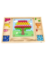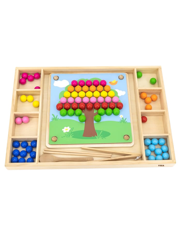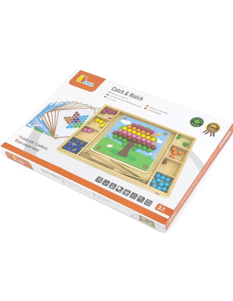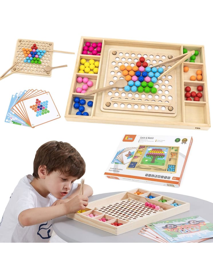 Drewniana gra "Złap i dopasuj" marki Viga. Zadanie dzieci jest nie tylko dopasowywać kolory według wzoru na papierze, ale także tworzyć więcej wzorów dzięki swojej wyobraźni. Ta gra może ćwiczyć koordynację ręka-oko i koncentrację dziecka. Dzieci mogą przymocować ulubiony papier do drewnianej tacy. Za pomocą pałeczek, łyżki lub spinacza przyczepić kulki do otworów na desce według wzorów i kolorów, a na koniec ułożyć je w piękny obrazek.