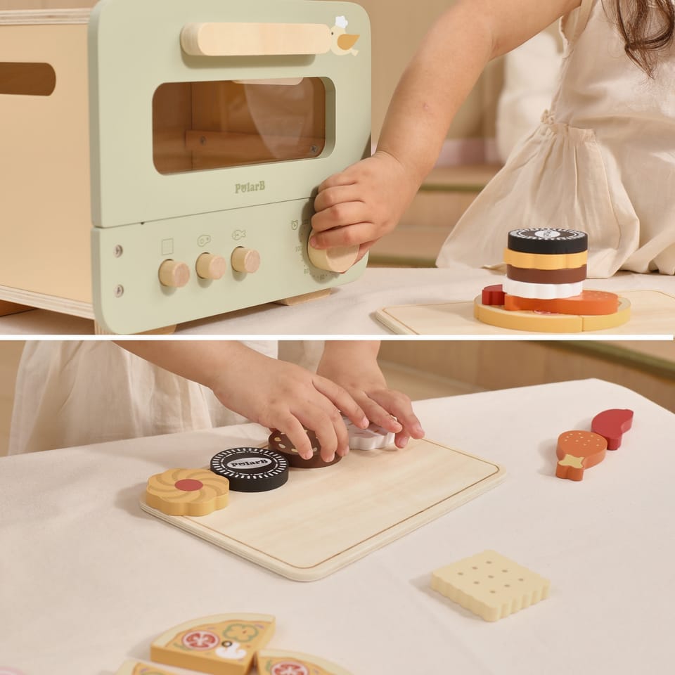 Pozwól swojemu dziecku stać się prawdziwym szefem kuchni dzięki uroczemu, drewnianemu Zestawowi do Pieczenia Słodko-Pikantnych Potraw od VIGA! Ten innowacyjny zestaw, stylizowany na nowoczesny toster/piekarnik w modnym, zielonym odcieniu, idealnie nadaje się do odgrywania ról w kuchni. W zestawie znajduje się 12 realistycznych, drewnianych akcesoriów spożywczych, w tym pyszne ciasteczka, mini pizza (krojona na 4 części), kiełbaska oraz udko kurczaka. Piekarnik ma otwieraną klapę, ruchome pokrętła i wysuwaną tacę, co sprawia, że zabawa jest niezwykle autentyczna. Zabawa w pieczenie i gotowanie nie tylko zapewnia świetną rozrywkę, ale także intensywnie rozwija małą motorykę, koordynację wzrokowo-ruchową, a także kreatywność i świadomość społeczną. Dzięki temu zestawowi, maluchy mogą naśladować dorosłych, uczyć się serwowania i dzielenia posiłków. To idealny dodatek do każdej drewnianej kuchni, gwarantujący godziny bezpiecznej i rozwijającej zabawy!