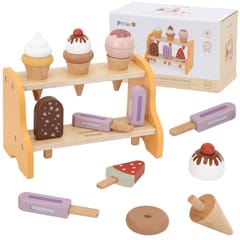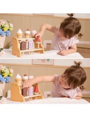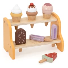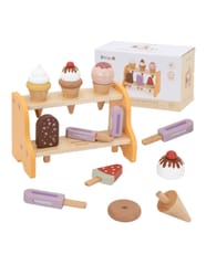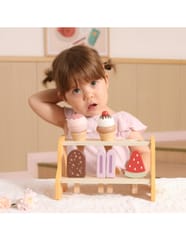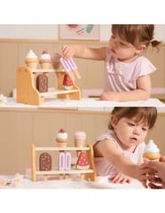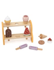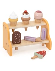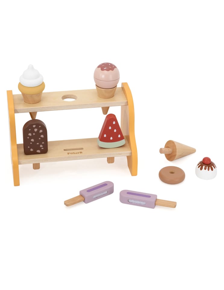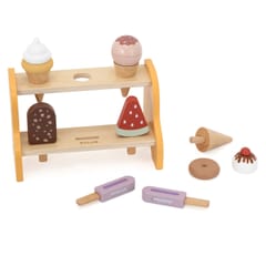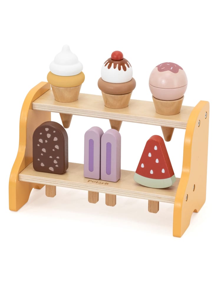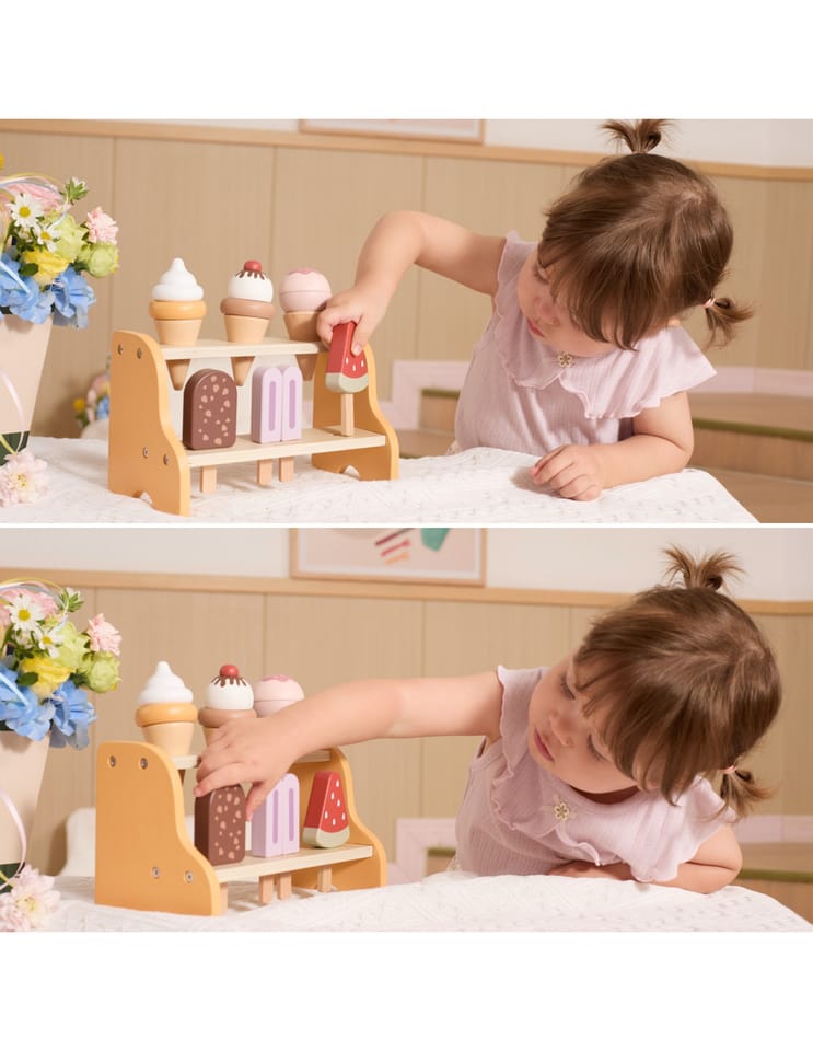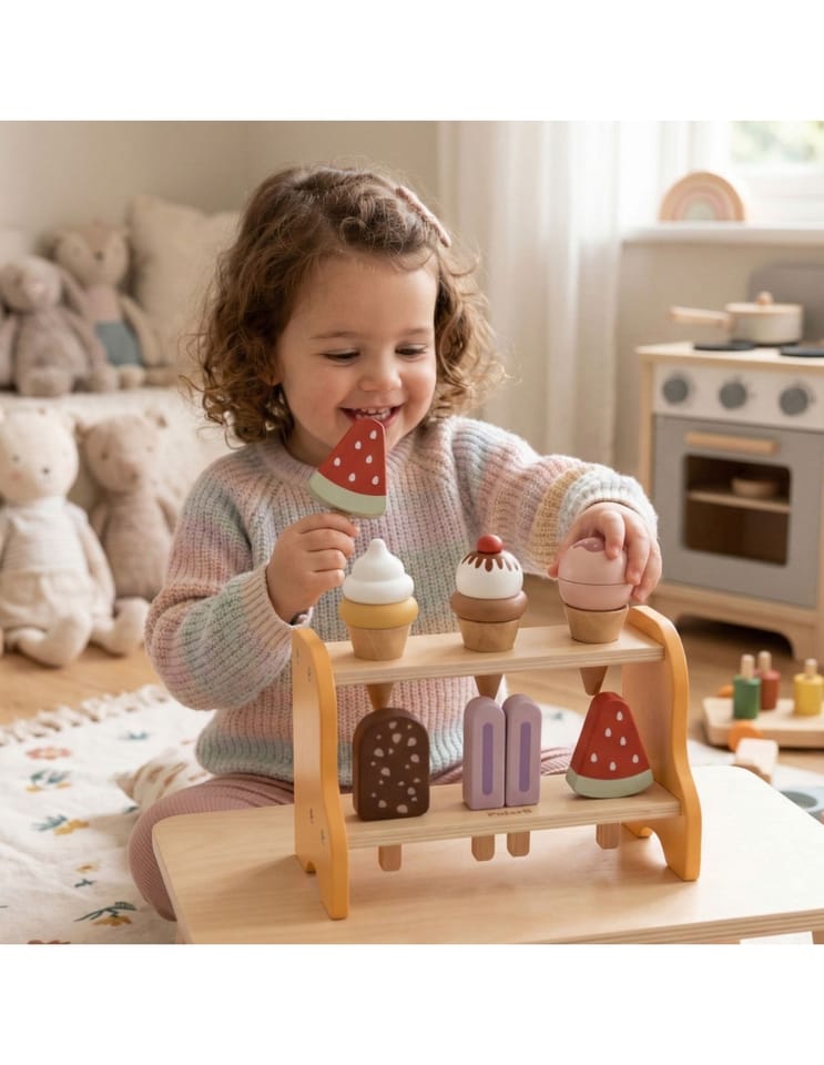Ten uroczy zestaw zawiera 6 kolorowych lodów od marki VIGA– 3 rożki i 3 lody na patyku – ozdobione kultowymi wzorami, które zachwycą każde dziecko. Dwuwarstwowy, drewniany stojak pozwala eksponować lody i utrzymać porządek podczas zabawy. Wyjmowane elementy stymulują małą motorykę i rozwijają zabawę dotykową. Idealny do kreatywnego odgrywania ról – np. własnego straganu z lodami!