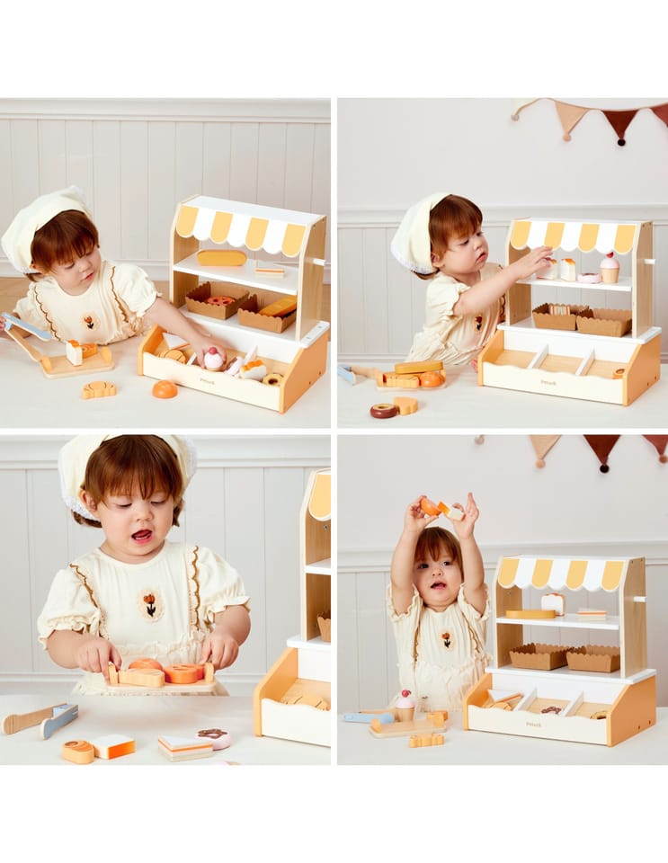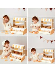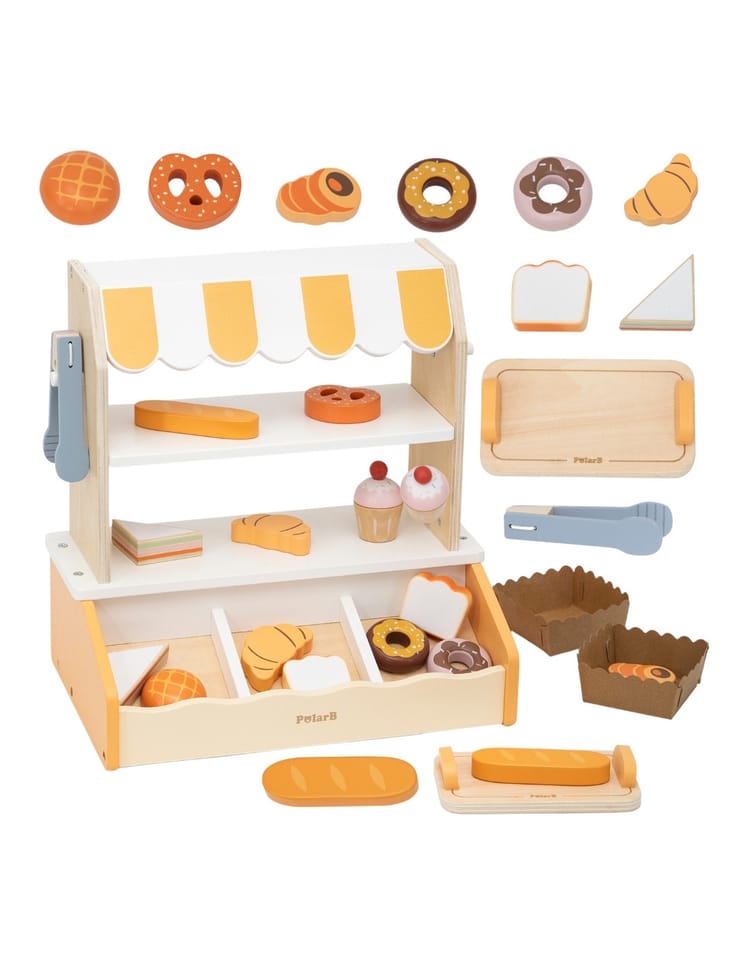 Ta urocza, drewniana Mini Piekarnia marki VIGA to idealna zabawka do odgrywania ról! Zestaw zawiera realistyczny stojak/stragan z daszkiem w paski oraz 16 sztuk drewnianych akcesoriów imitujących pyszne wypieki. Dzieci mogą wcielić się w rolę prawdziwego piekarza lub sprzedawcy, serwując klientom rogaliki, pączki, tosty, babeczki i wiele innych smakołyków. Stojak wyposażony jest w dwie półki ekspozycyjne, specjalne miejsce na chleb (imitacja ceglanego pieca) i szczypce do nakładania, co dodaje zabawie autentyczności. Subtelna, pastelowa kolorystyka (naturalne drewno, biel i odcienie pomarańczu/żółci) sprawia, że piekarnia pięknie prezentuje się w każdym dziecięcym pokoju. Zabawa w piekarnię doskonale rozwija kreatywność i umiejętności społeczne poprzez interakcje oraz wspiera rozwój ruchowy dzięki manipulowaniu małymi elementami i szczypcami.