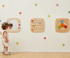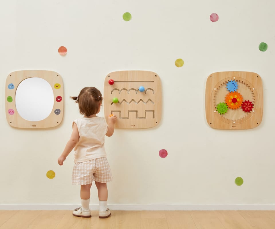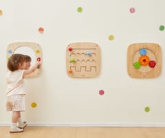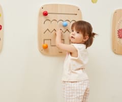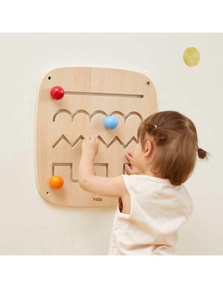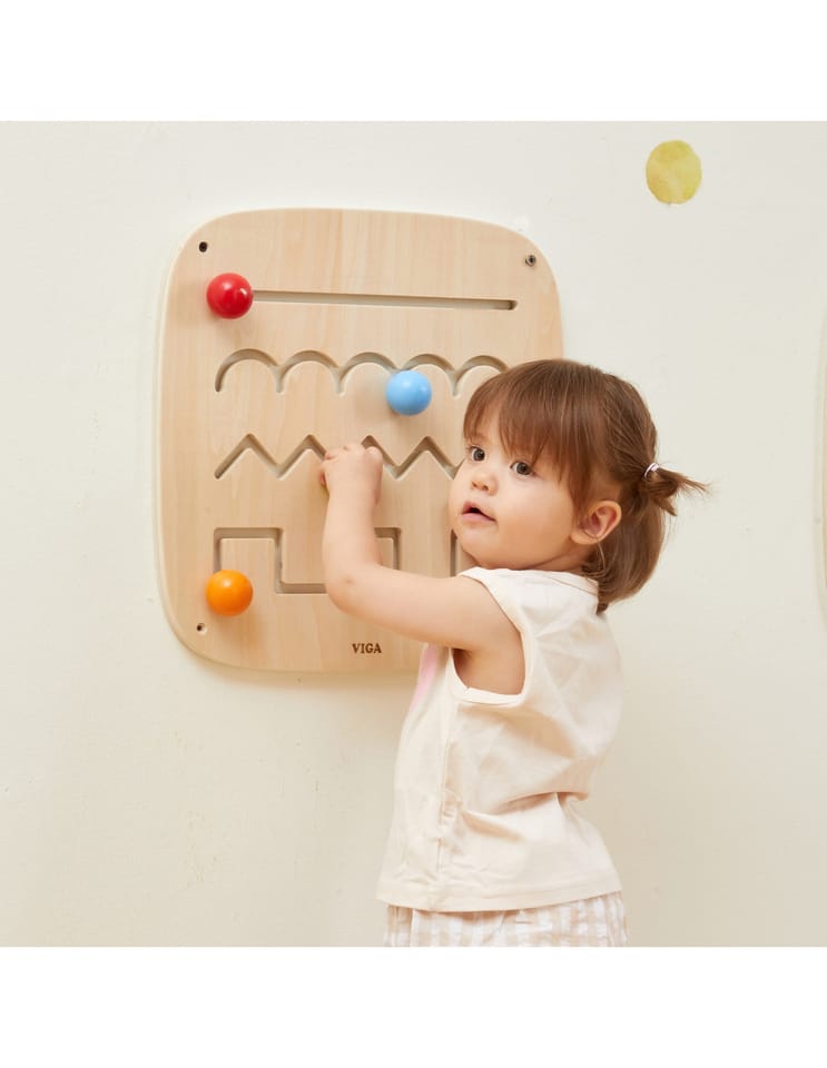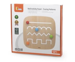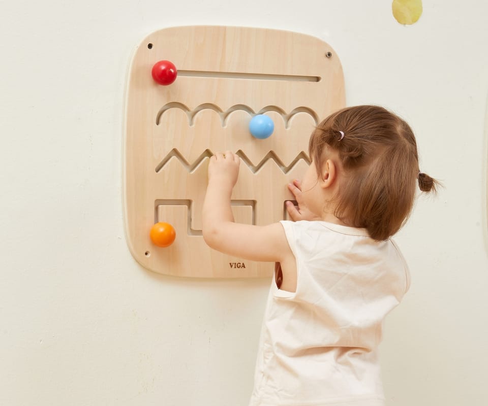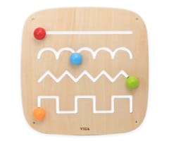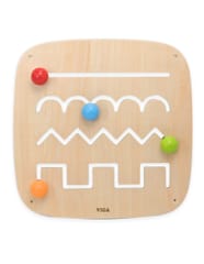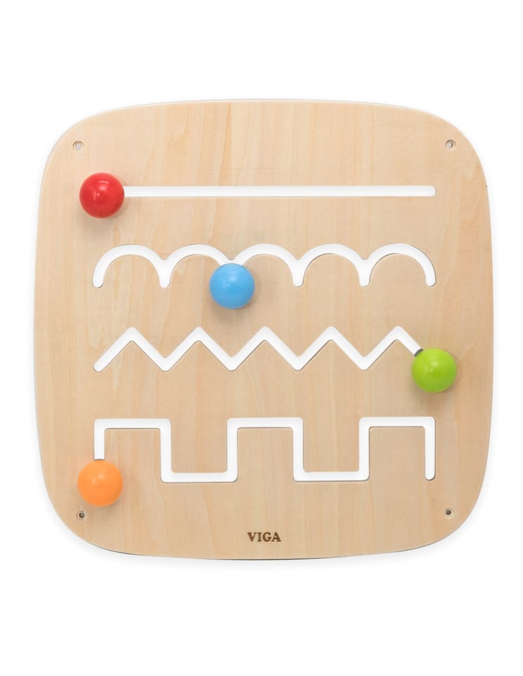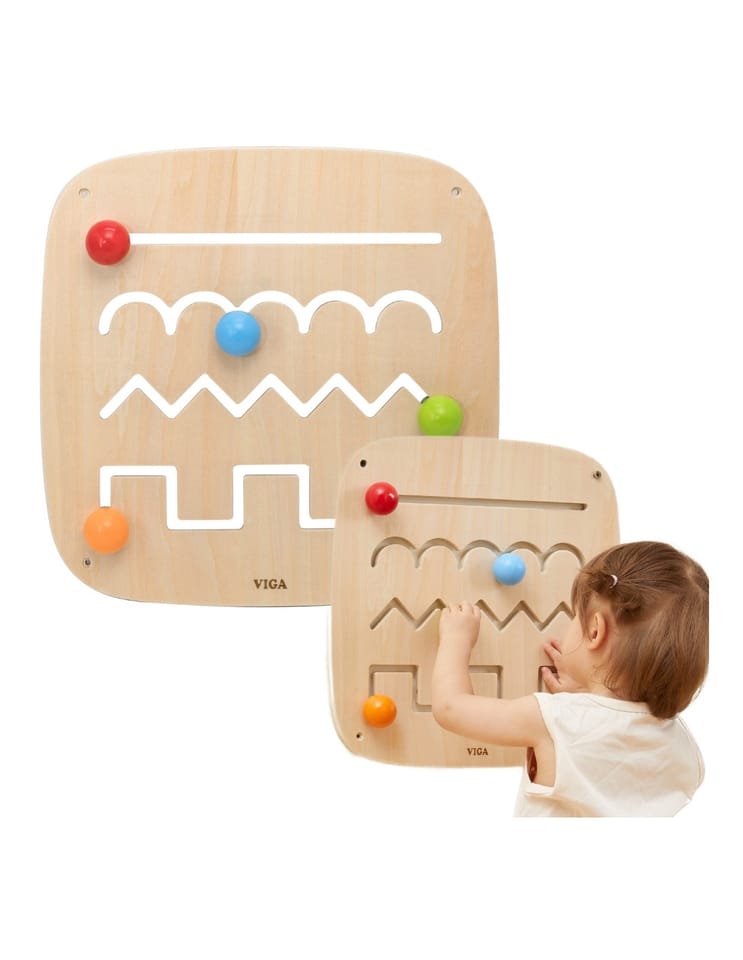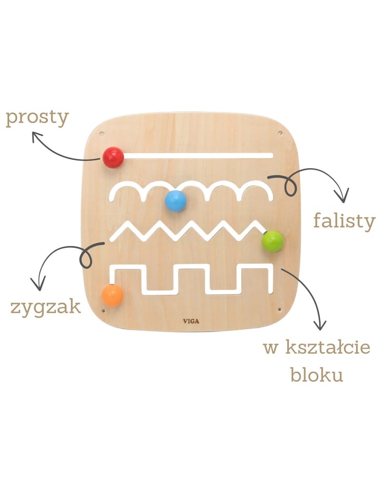 Ta drewniana tablica manipulacyjna to idealne narzędzie do nauki poprzez zabawę, stworzone z myślą o małych dzieciach od 12 miesiąca życia. Produkt pomaga w rozwoju koordynacji ręka-oko i motoryki małej, wprowadzając maluchy w świat różnorodnych linii i kształtów w interaktywny sposób. Tablica posiada cztery przesuwane tory z różnymi wzorami – prostym, falistym, zygzakowatym oraz w kształcie bloku. Do każdego toru przymocowana jest kolorowa kulka z łatwym do uchwycenia uchwytem, zaprojektowanym z myślą o małych rączkach. Przesuwając kulki, dzieci odkrywają różne cechy linii, ćwiczą rozpoznawanie kolorów oraz uczą się pojęć, takich jak kąty i krzywe. Tablica jest łatwa w montażu na ścianie, a jej solidna, drewniana konstrukcja zapewnia trwałość i bezpieczeństwo podczas zabawy.