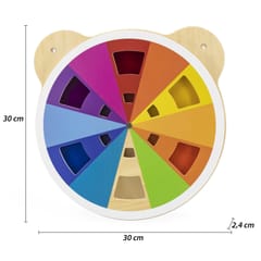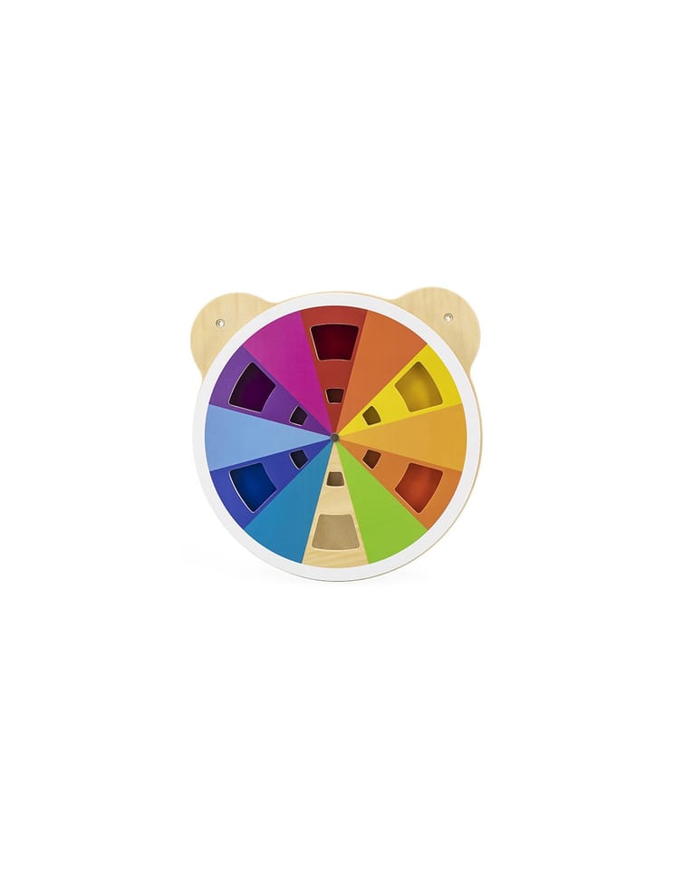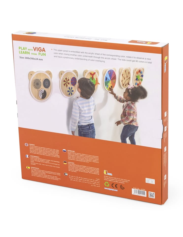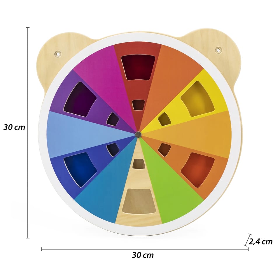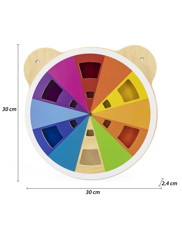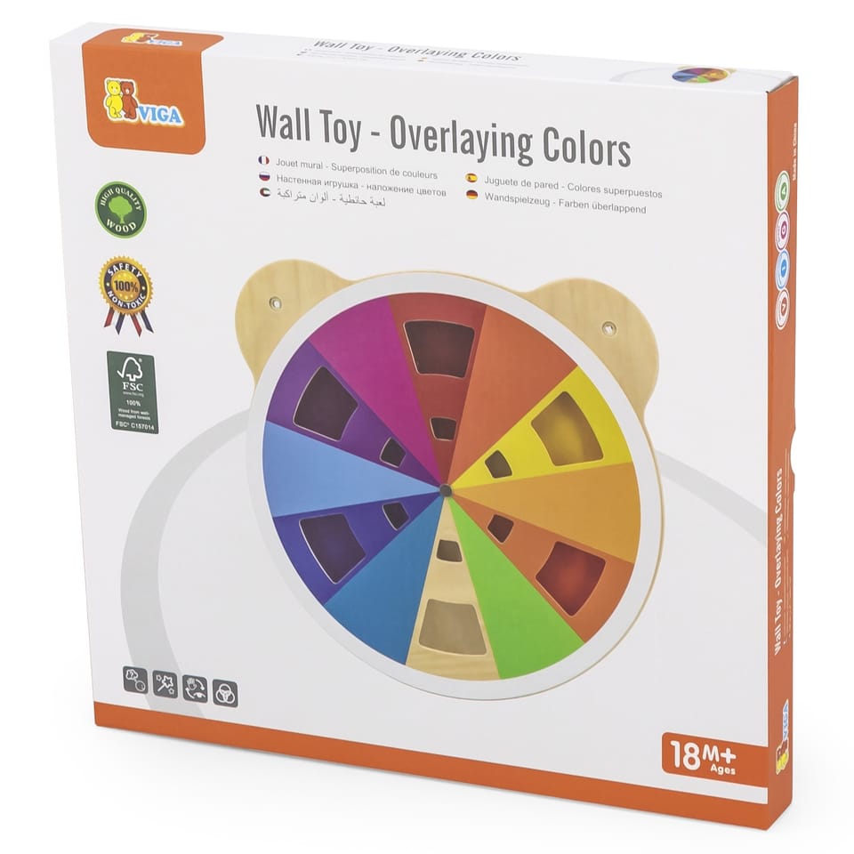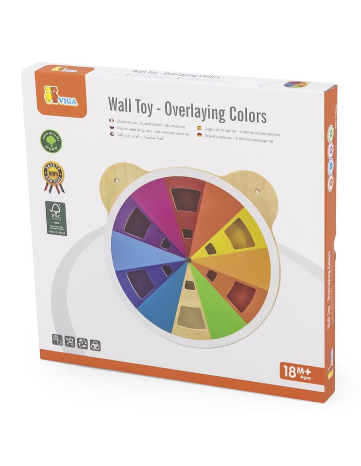Tablica z akrylową tarczą w różnych odcieniach od marki Viga. Dziecko dzięki obracaniu tarczy tablicy może mieszać kolory w dowolny sposób i odkrywać jakie inne barwy powstają. W sumie można uzyskać aż 60 różnych kolorów. Produkt idealnie sprawdzi się zarówno w domowym zaciszu, szkole oraz przedszkolu. Ciekawe przygotowanie formy tablicy z pewnością przykuje uwagę każdego malucha. Całość wykonana została z drewna lakierowanego i pomalowana nietoksycznymi farbami w żywe barwy, które zadowolą każdego użytkownika i dadzą mnóstwo radości z zabawy. Produkt przeznaczony dla dzieci od 18 miesiąca życia.