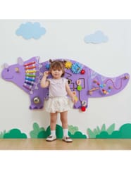- - Drewniana, sensoryczno-manipulacyjna tablica w kształcie Triceratopsa, przyciągająca wzrok i zachęcająca do zabawy