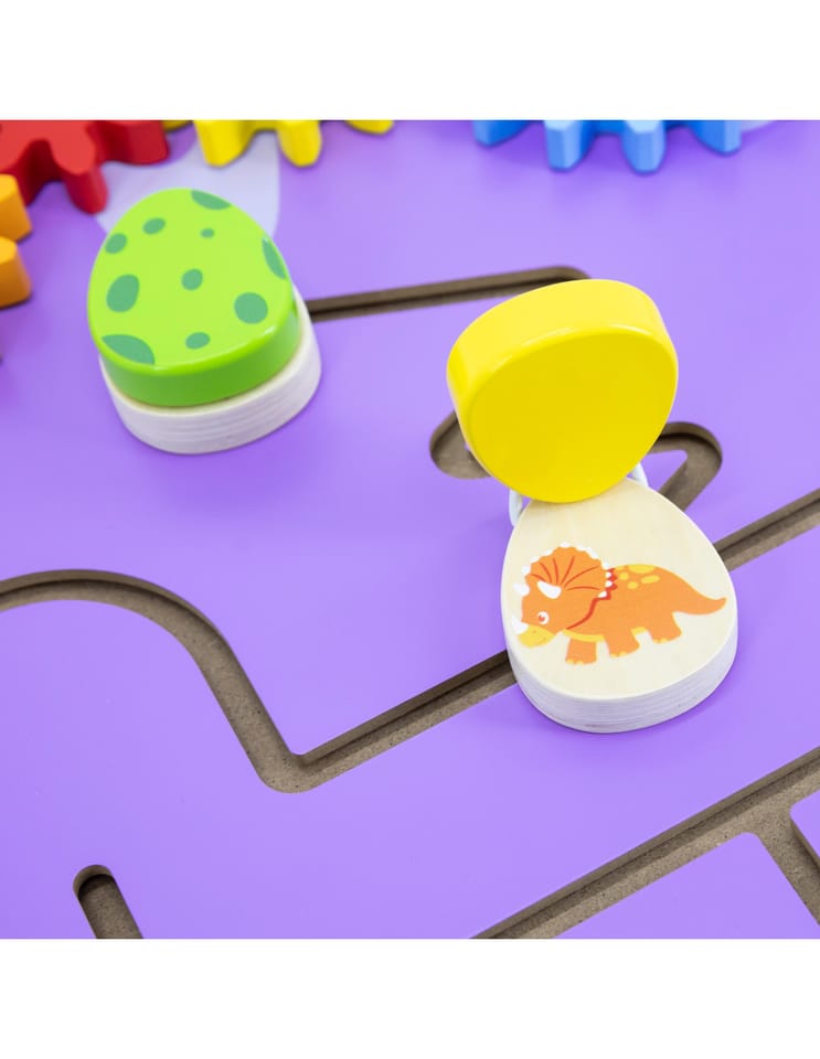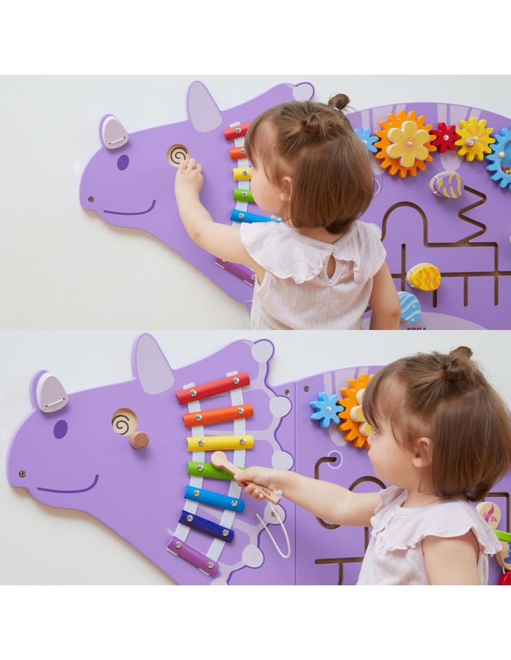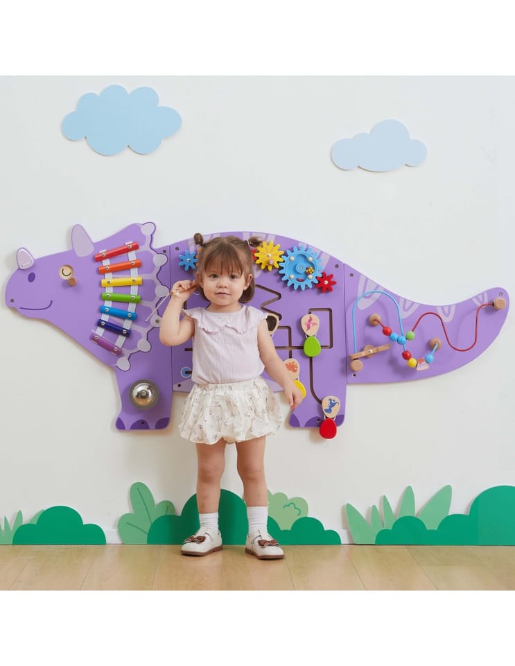Ta fascynująca tablica sensoryczna w kształcie dinozaura Triceratopsa od marki Viga Toys, przenosi codzienną zabawę na wyższy poziom edukacji! Dzieci mogą bawić się kołami zębatymi, labiryntami z obracanymi jajeczkami i pętlami z koralikami — wszystko w jednym wielofunkcyjnym panelu. Tablica jest idealna do domu, przedszkola lub sali zabaw, zachęca do eksperymentowania i samodzielnej nauki poprzez kreatywną zabawę. Solidne, lakierowane drewno oraz nietoksyczne farby zapewniają trwałość i bezpieczeństwo nawet przy długotrwałym użytkowaniu.