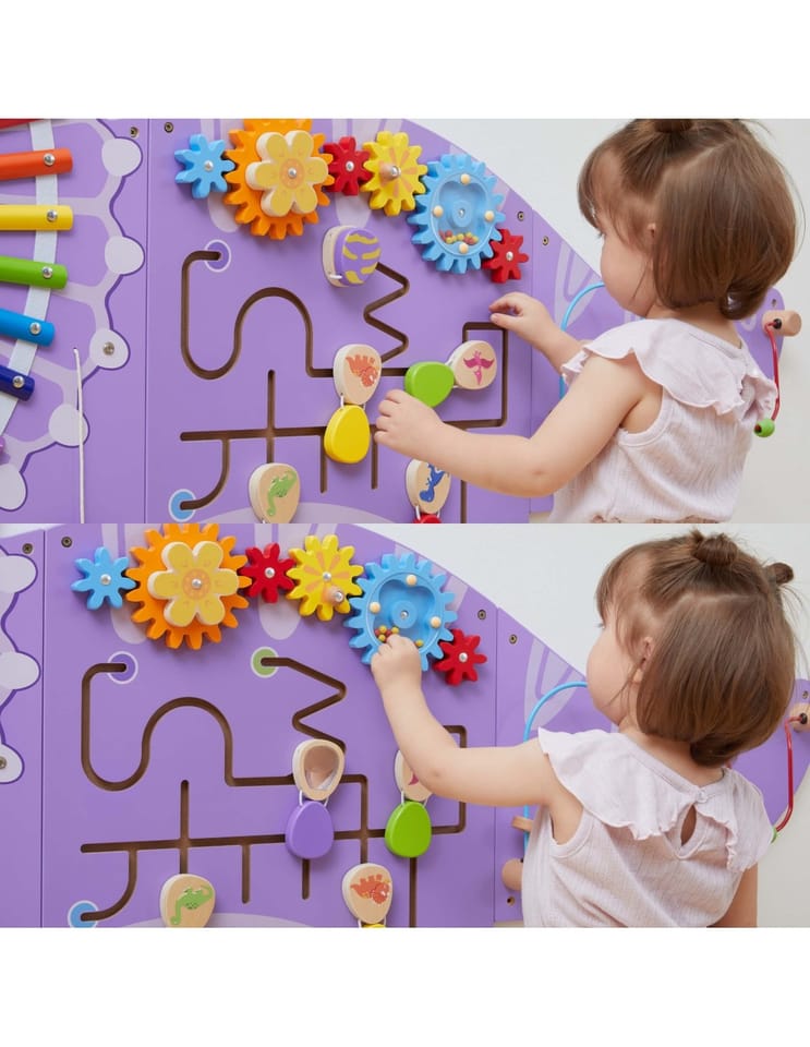 - - Multifunkcyjne elementy: koła zębate, labirynt z otwieranymi jajeczkami, pętle motoryczne oraz muzyczne aktywności
