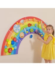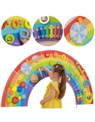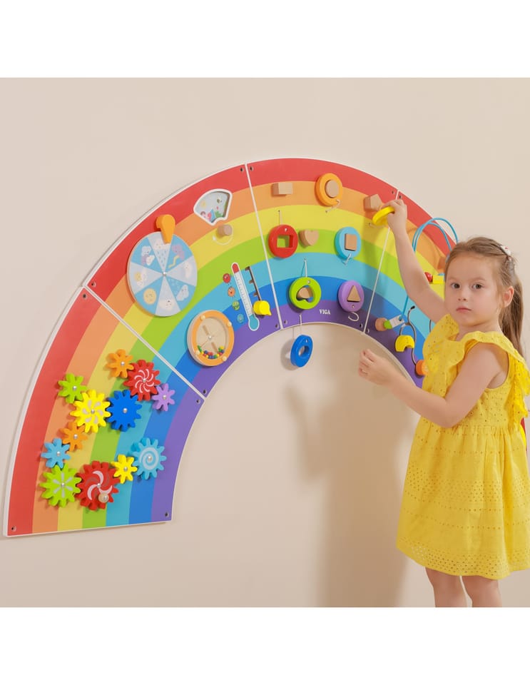 Tablica Sensoryczna Tęcza marki Viga Toys to drewniana, wielofunkcyjna zabawka ścienna składająca się z 5 modułowych części, co ułatwia transport i pozwala na dowolną kolejność montażu. Oferuje liczne aktywności, w tym tablicę pogody, koła zębate, ksylofon, lustra i przeplatankę. Zakrzywiona konstrukcja umożliwia jednoczesną zabawę dzieciom o różnym wzroście. Tablica stymuluje zmysły, wspiera rozwój motoryki małej, logicznego myślenia i cierpliwości, ucząc o kolorach, kształtach, dźwiękach i pogodzie. Idealna do placówek edukacyjnych.