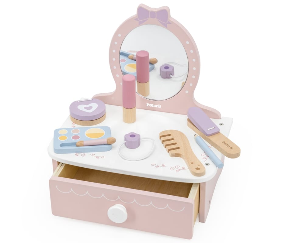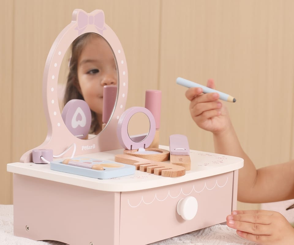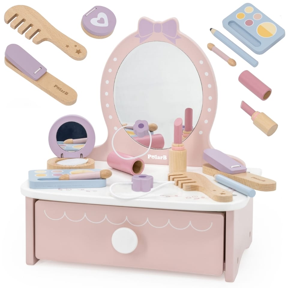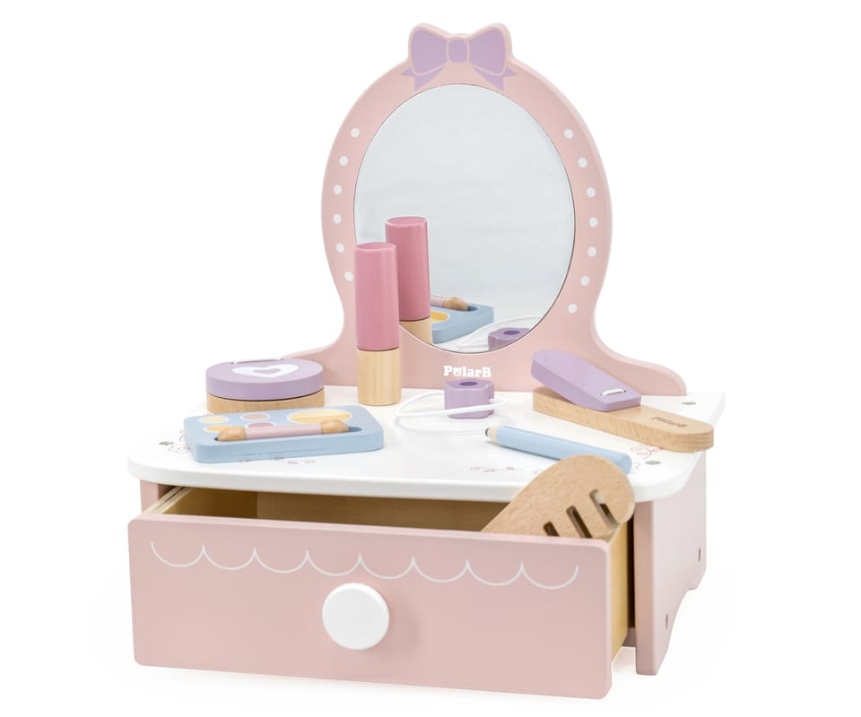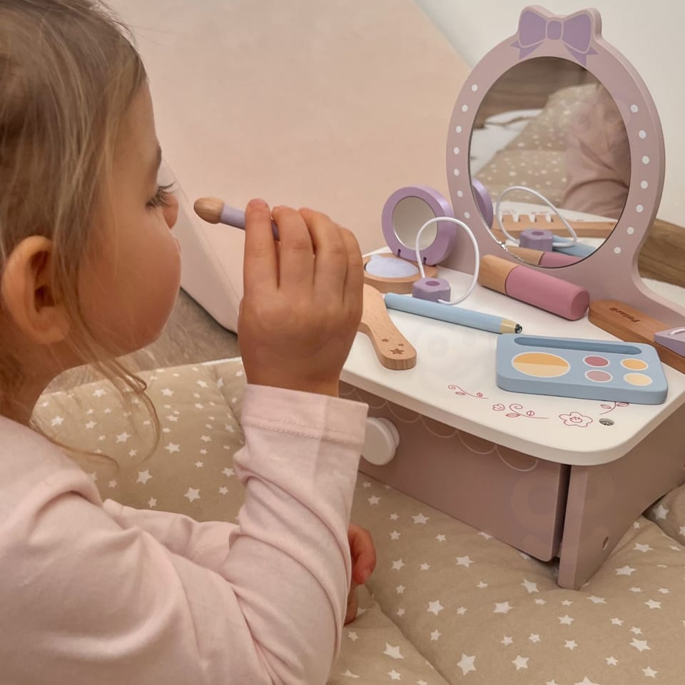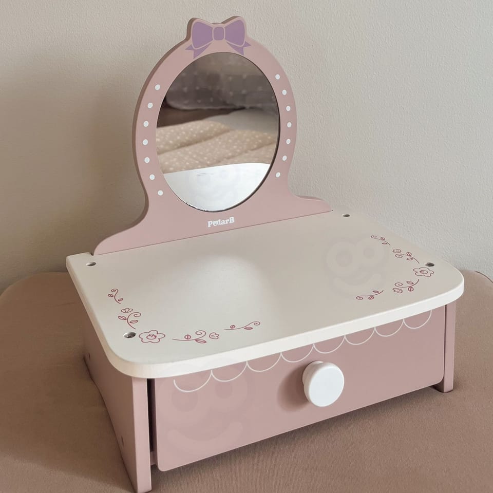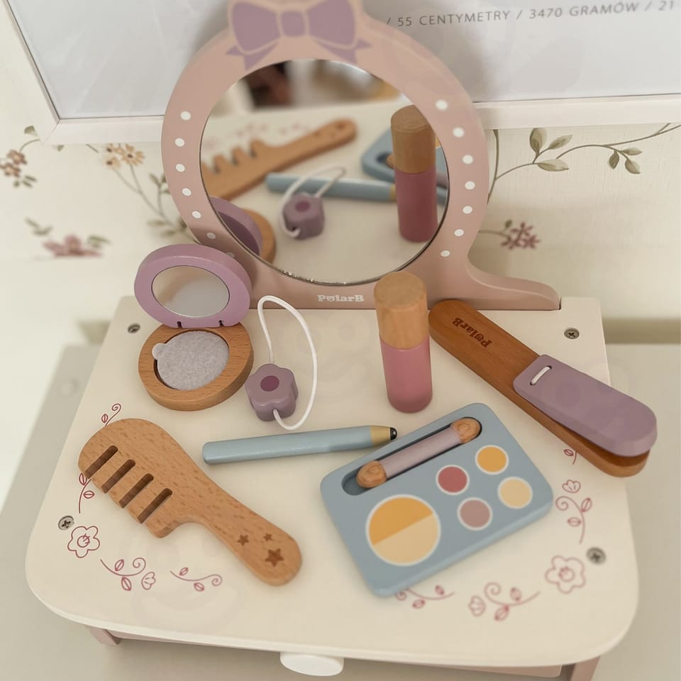 ✔️zabawka dla dzieci od 3 roku życia✔️Toaletkę z lustrem – bezpieczne lusterko w eleganckiej, różowej ramie z ozdobną koroną.✔️Pojemną szufladę – idealną do przechowywania akcesoriów i skarbów małej księżniczki.✔️Zabawka nie zawiera ostrych krawędzi.✔️Pomalowana nietoksycznymi farbami.