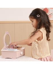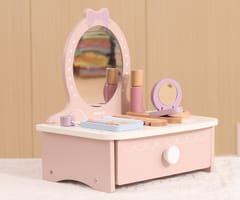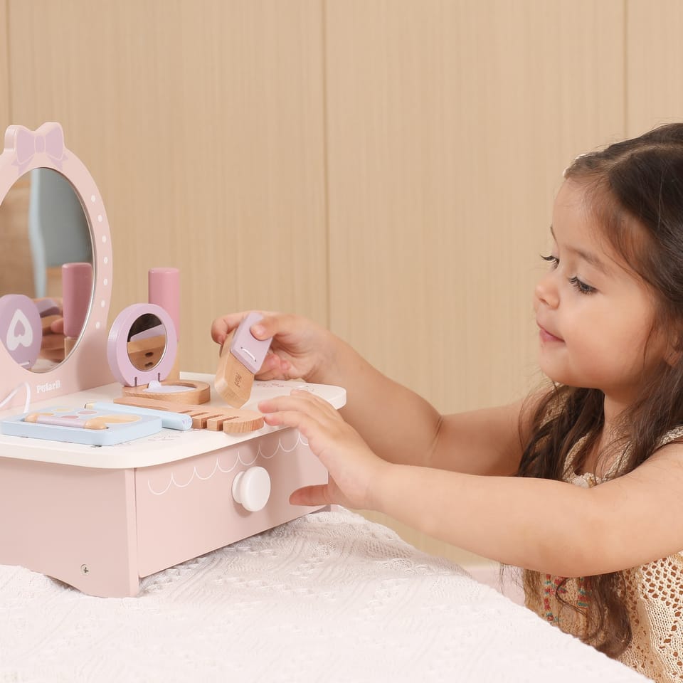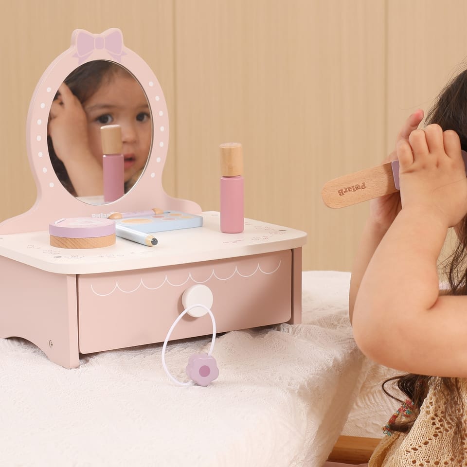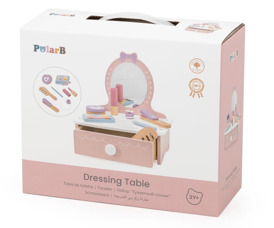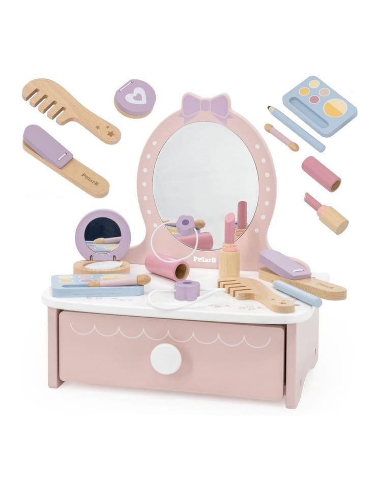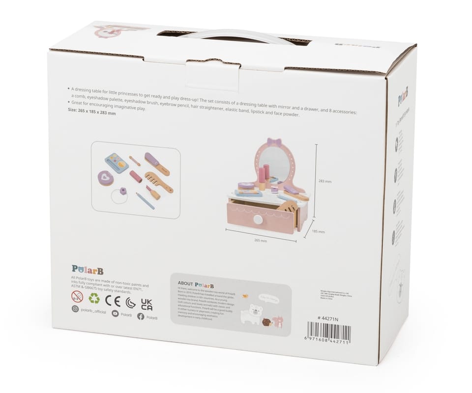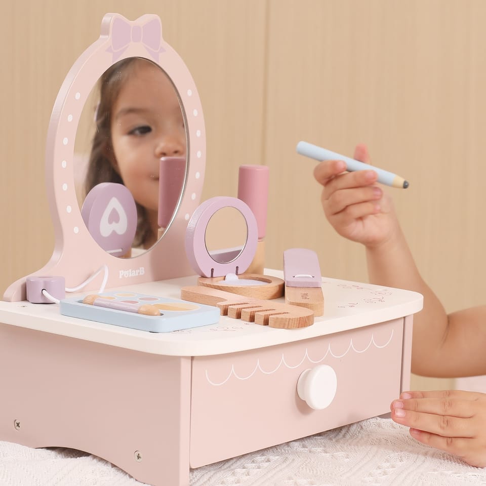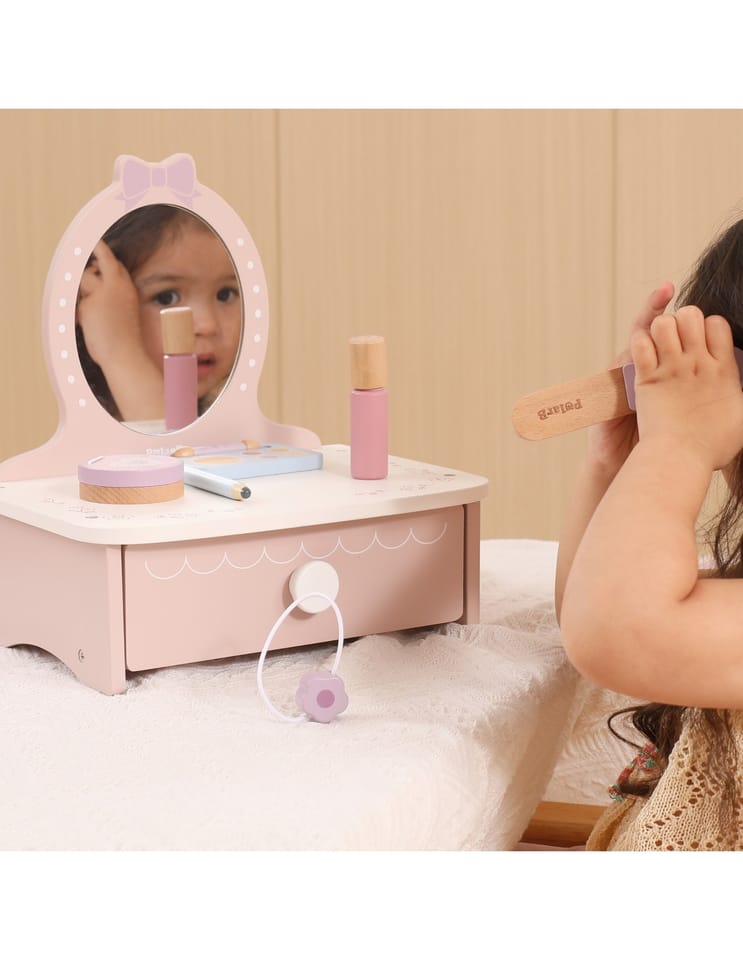 ✔️zabawka dla dzieci od 3 roku życia✔️Toaletkę z lustrem – bezpieczne lusterko w eleganckiej, różowej ramie z ozdobną koroną.✔️Pojemną szufladę – idealną do przechowywania akcesoriów i skarbów małej księżniczki.✔️Zabawka nie zawiera ostrych krawędzi.✔️Pomalowana nietoksycznymi farbami.