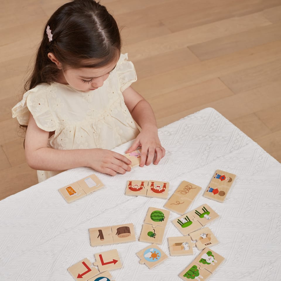 Drewniana Układanka Dopasowanie Przeciwieństw od marki VIGA zawiera w sobie 24 kolorowych puzzli, które można dopasować tworząc przeciwstawne pary. Dzięki zabawie małe dzieci rozwiną swoje słownictwo, koncentrację, zdolności motoryczne i logiczne myślenie poprzez dopasowanie i odkrywanie połączeń.