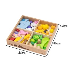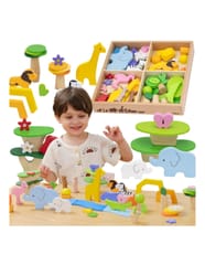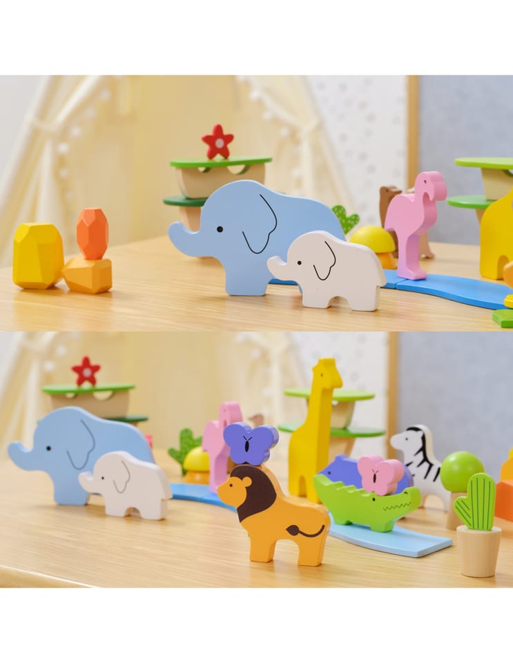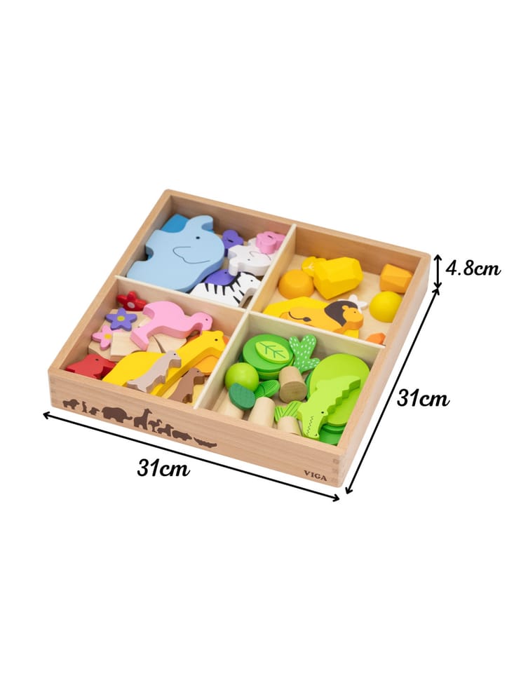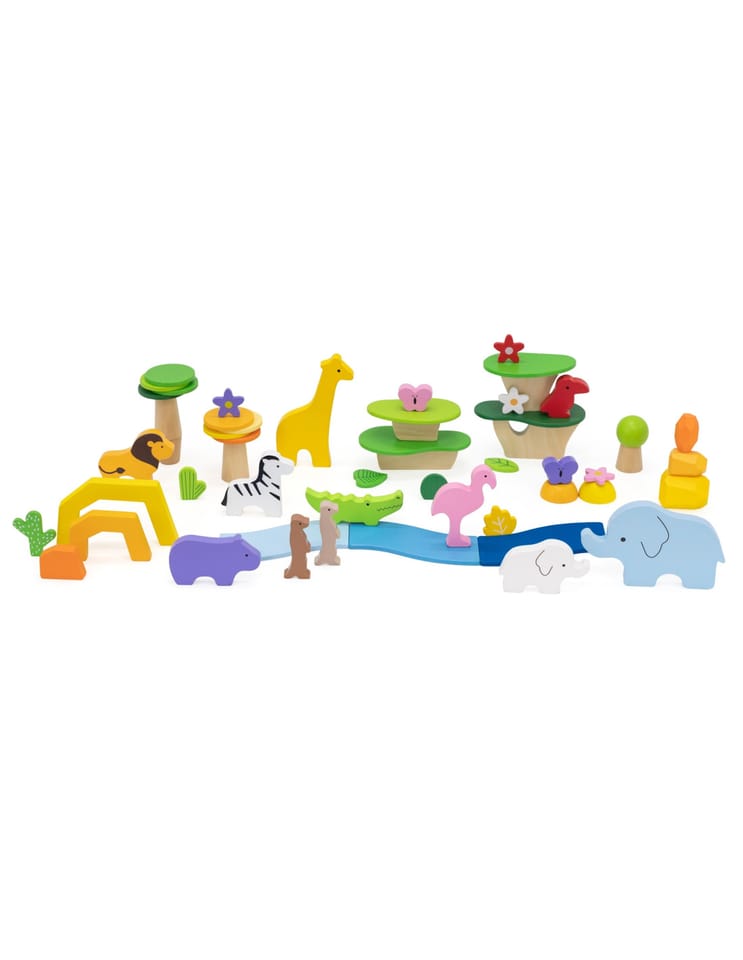 - - 55 elementów drewnianych (figurki zwierząt tropikalnych i elementy otoczenia)