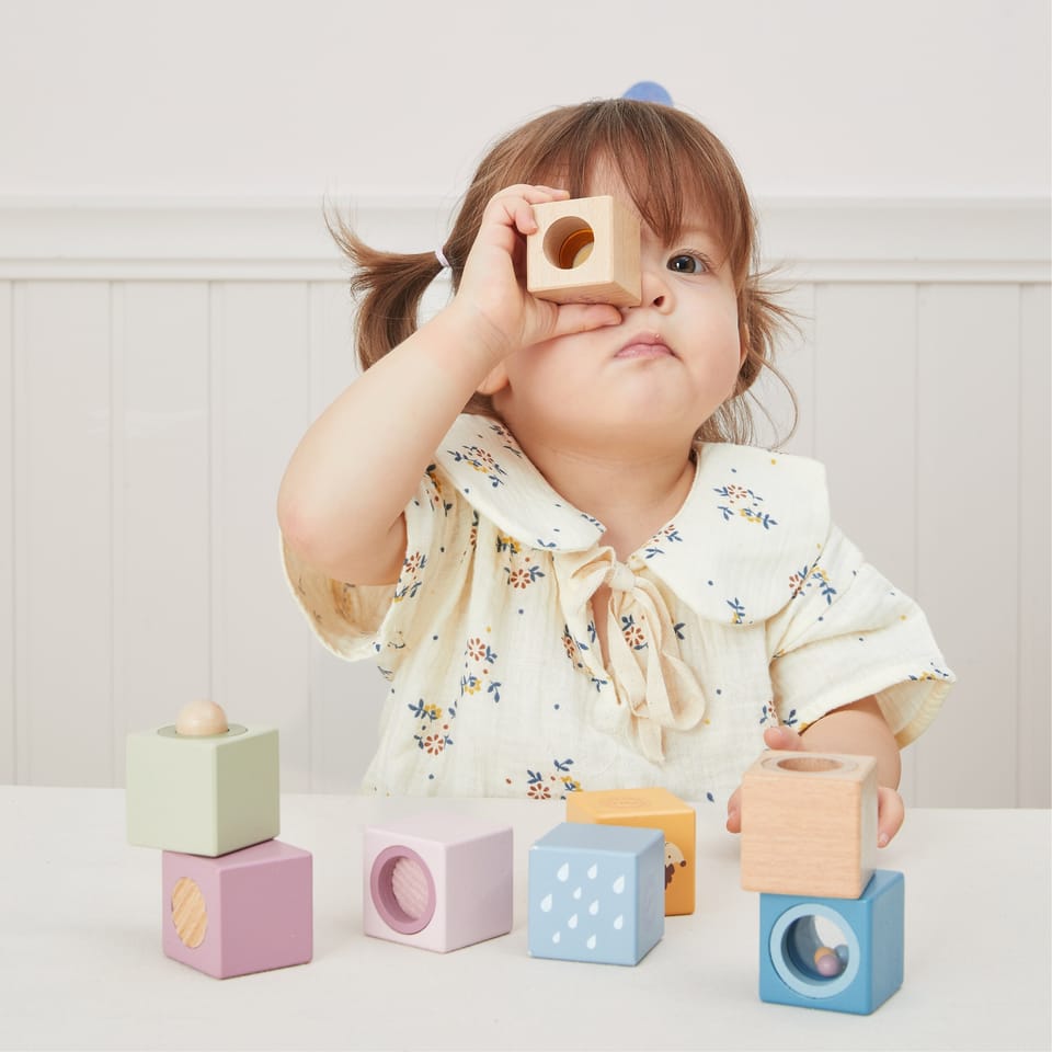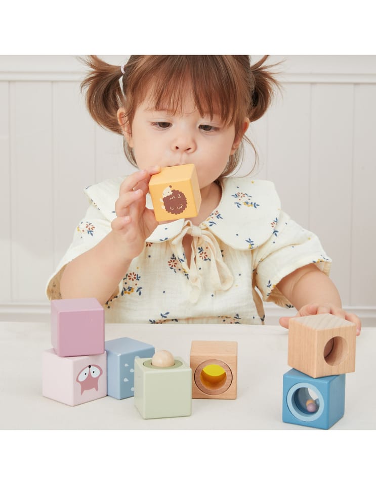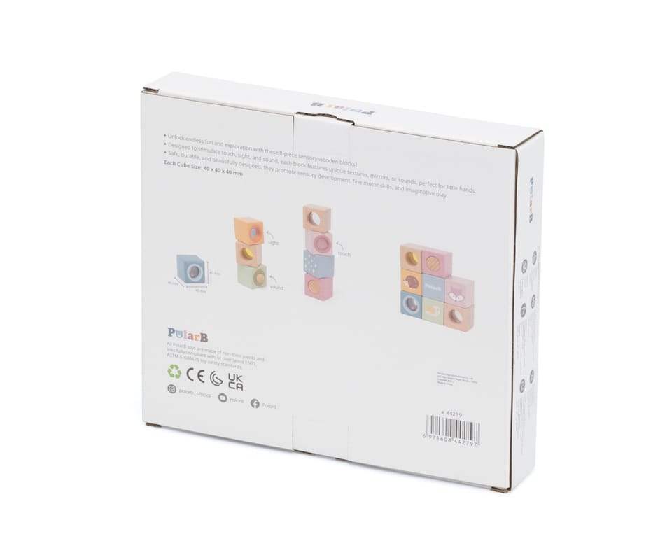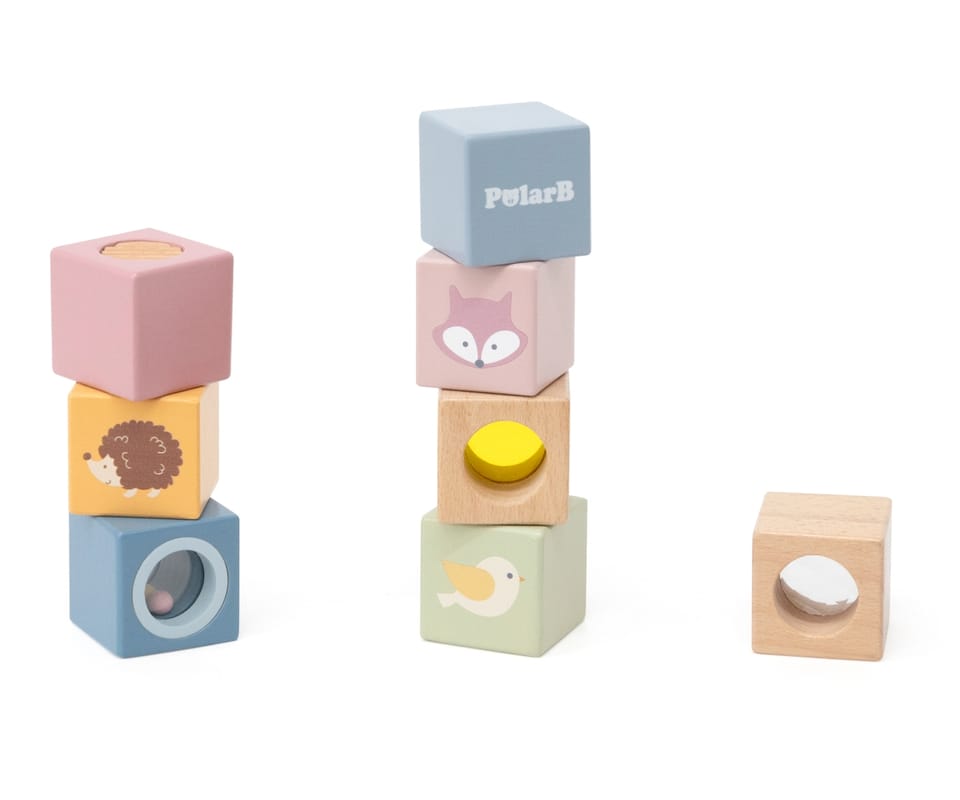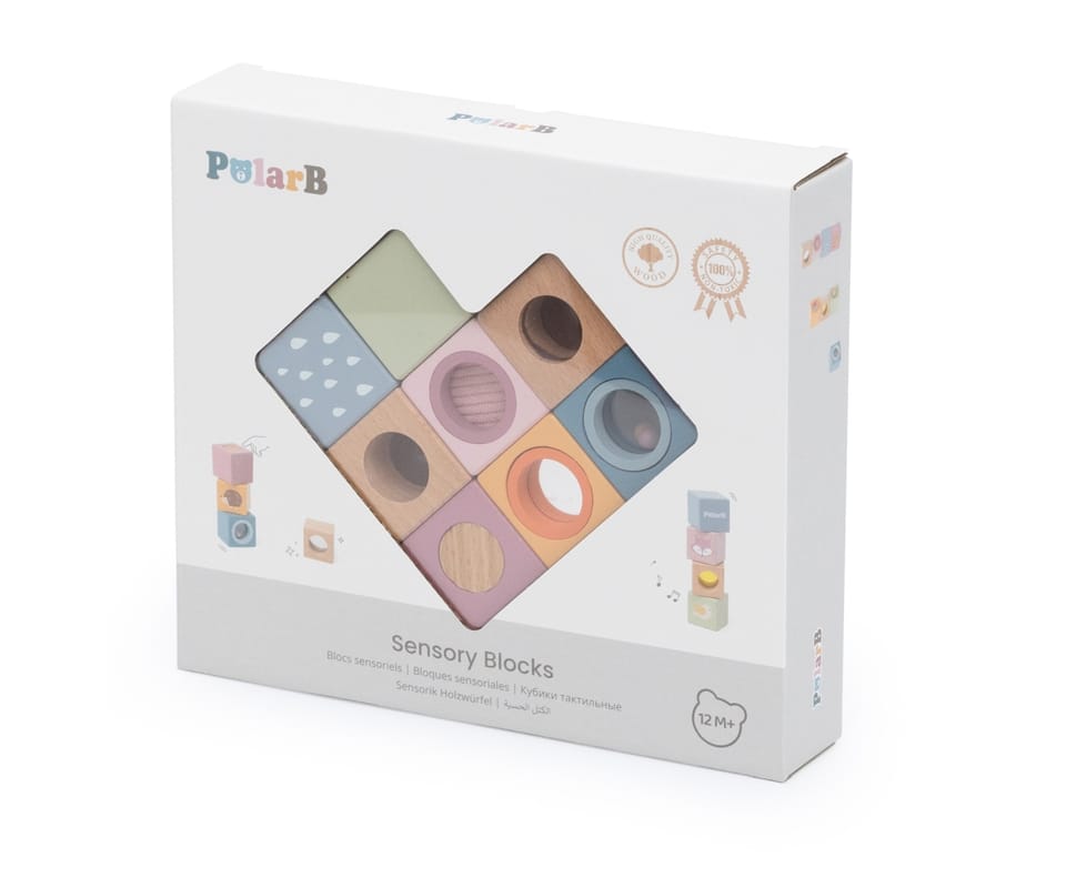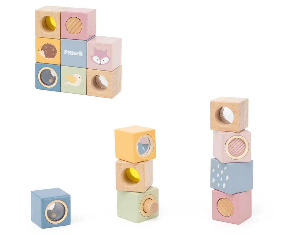 Odkryj świat niekończącej się zabawy i odkrywania z tymi 8-elementowymi, sensorycznymi, drewnianymi klockami. Zaprojektowane, aby stymulować dotyk, wzrok i słuch, każdy klocek ma unikalną fakturę, lusterko, dzwoneczek lub grzechotkę. Klocki są idealne dla małych rączek, bezpieczne, trwałe i pięknie zaprojektowane, wspierają rozwój sensoryczny, małą motorykę i wyobraźnię Twojego dziecka.