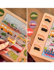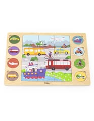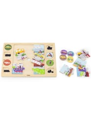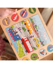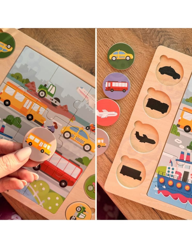 Rozpocznij zabawę od ułożenia 9-elementowej układanki znajdującej się pośrodku. Następnie Twoje dziecko może dopasować 8 okrągłych puzzli do odpowiadających im cieni na tablicy. To zadanie nie tylko rozwija zdolności manualne i koordynację, ale także logiczne myślenie. Na koniec, po dopasowaniu wszystkich elementów, dziecko może nazwać poszczególne środki transportu i odnaleźć je na dużym ułożonym obrazku. To doskonały sposób na rozwijanie słownictwa i budowanie umiejętności logicznego myślenia.